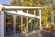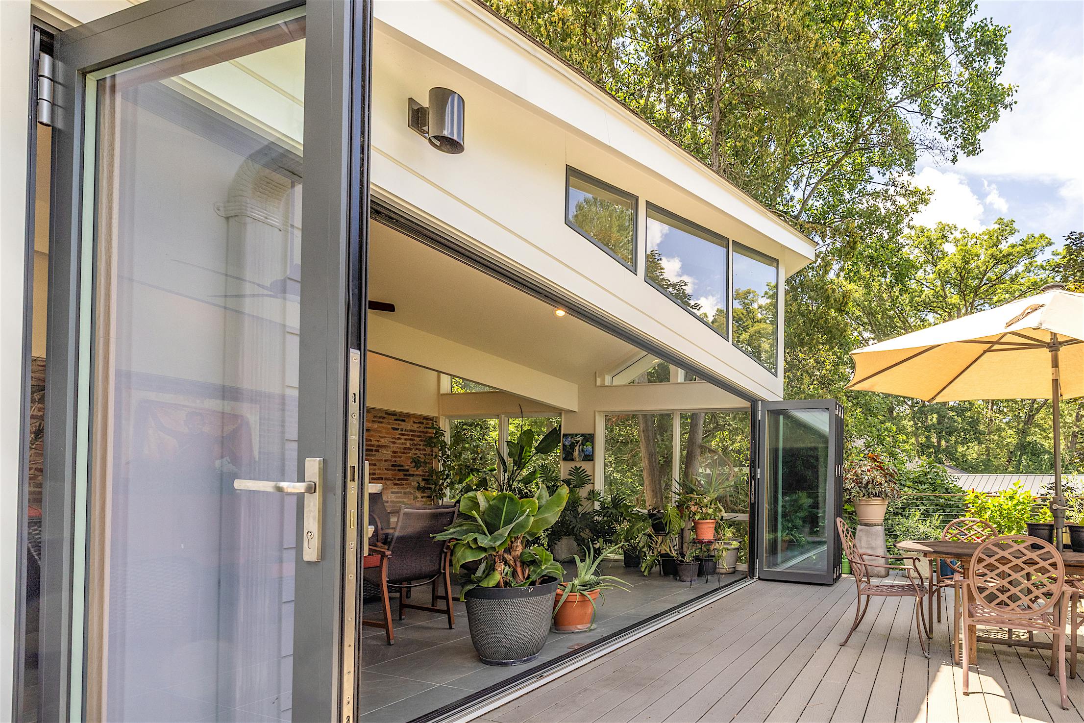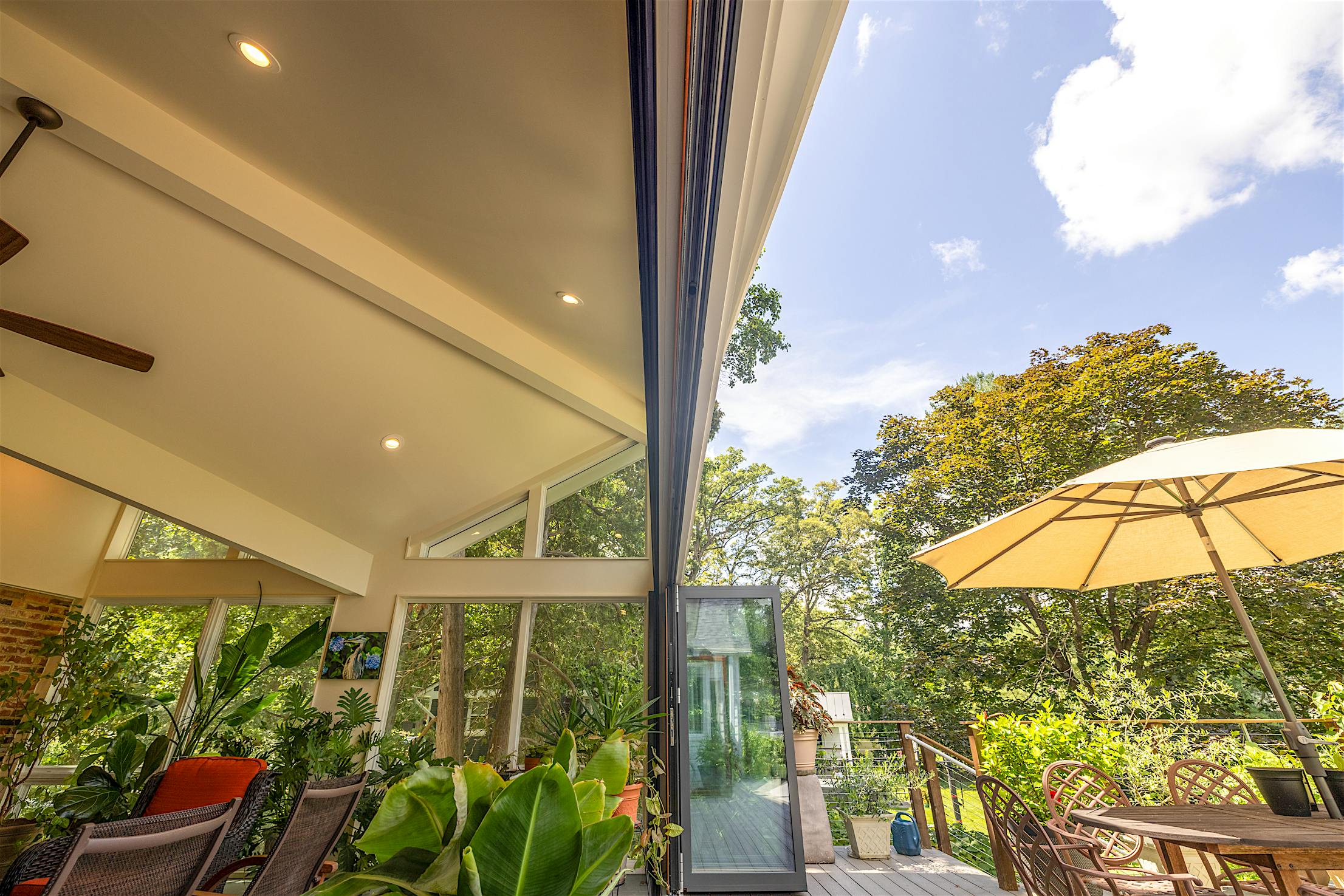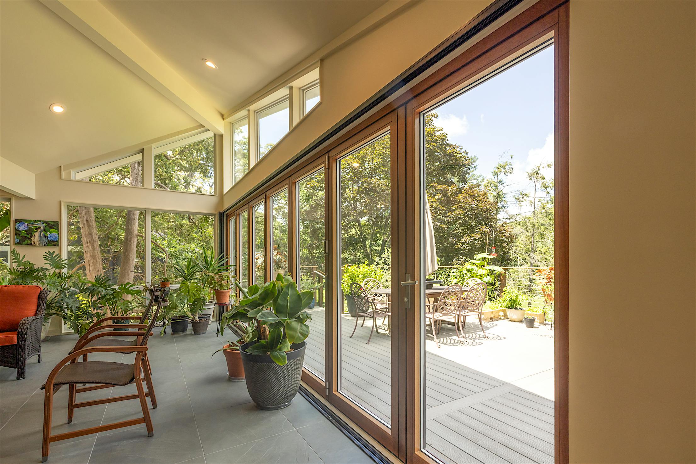 Featuring the elegant warmth of wood on the inside and the durability of aluminum on the outside, the Generation 4 aluminum clad folding glass door creates an expansive 21-foot-wide opening. The deck and conservatory become one with a barefoot-friendly threshold that makes transitions a breeze, especially when hosting special gatherings. Featuring the slimmest aluminum clad frames in the market, the panels offer serene views of the tree canopy even when closed.