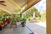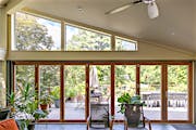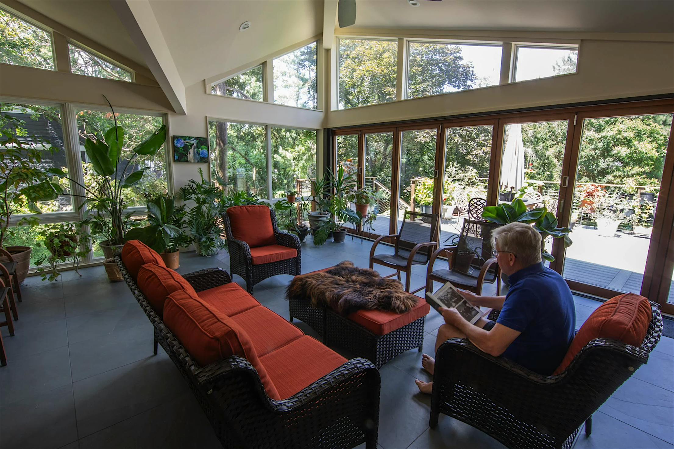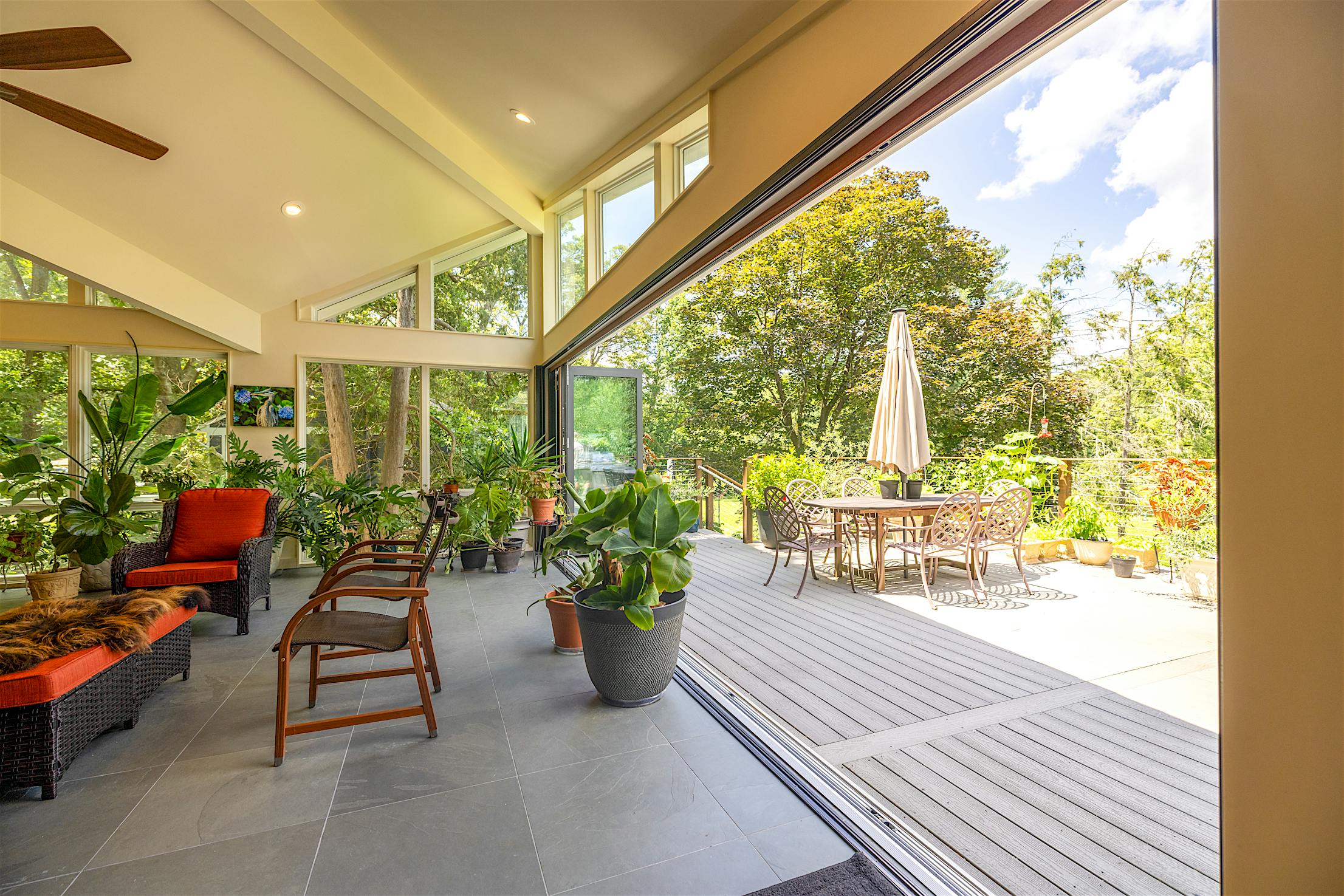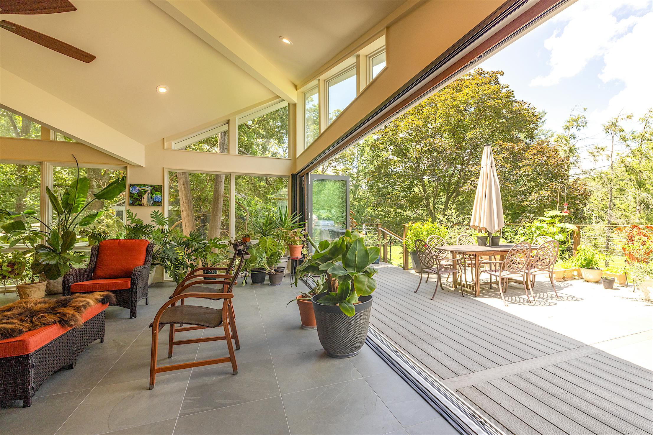 Featuring the elegant warmth of wood on the inside and the durability of aluminum on the outside, the Generation 4 aluminum clad folding glass door creates an expansive 21-foot-wide opening. The deck and conservatory become one with a barefoot-friendly threshold that makes transitions a breeze, especially when hosting special gatherings. Featuring the slimmest aluminum clad frames in the market, the panels offer serene views of the tree canopy even when closed.