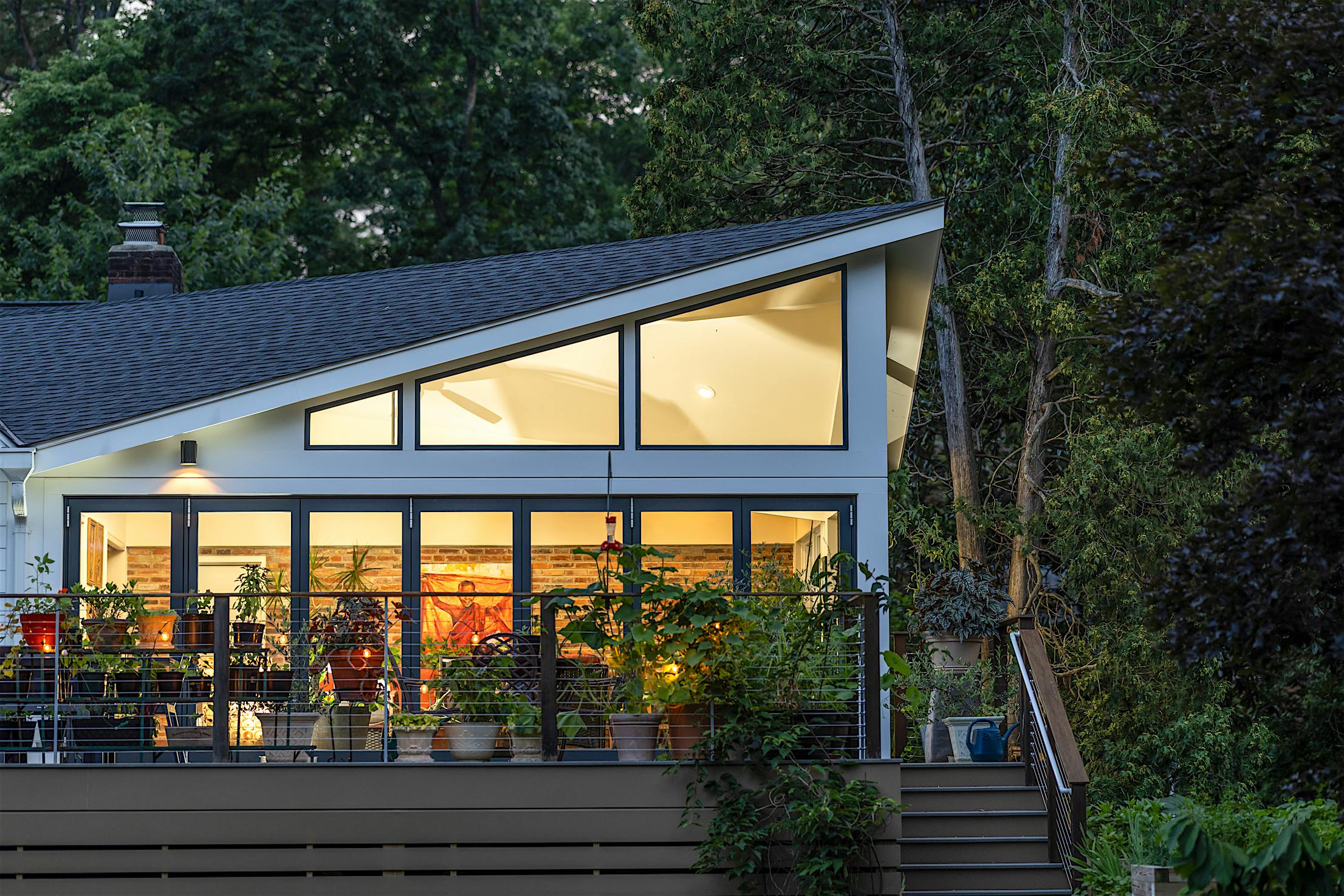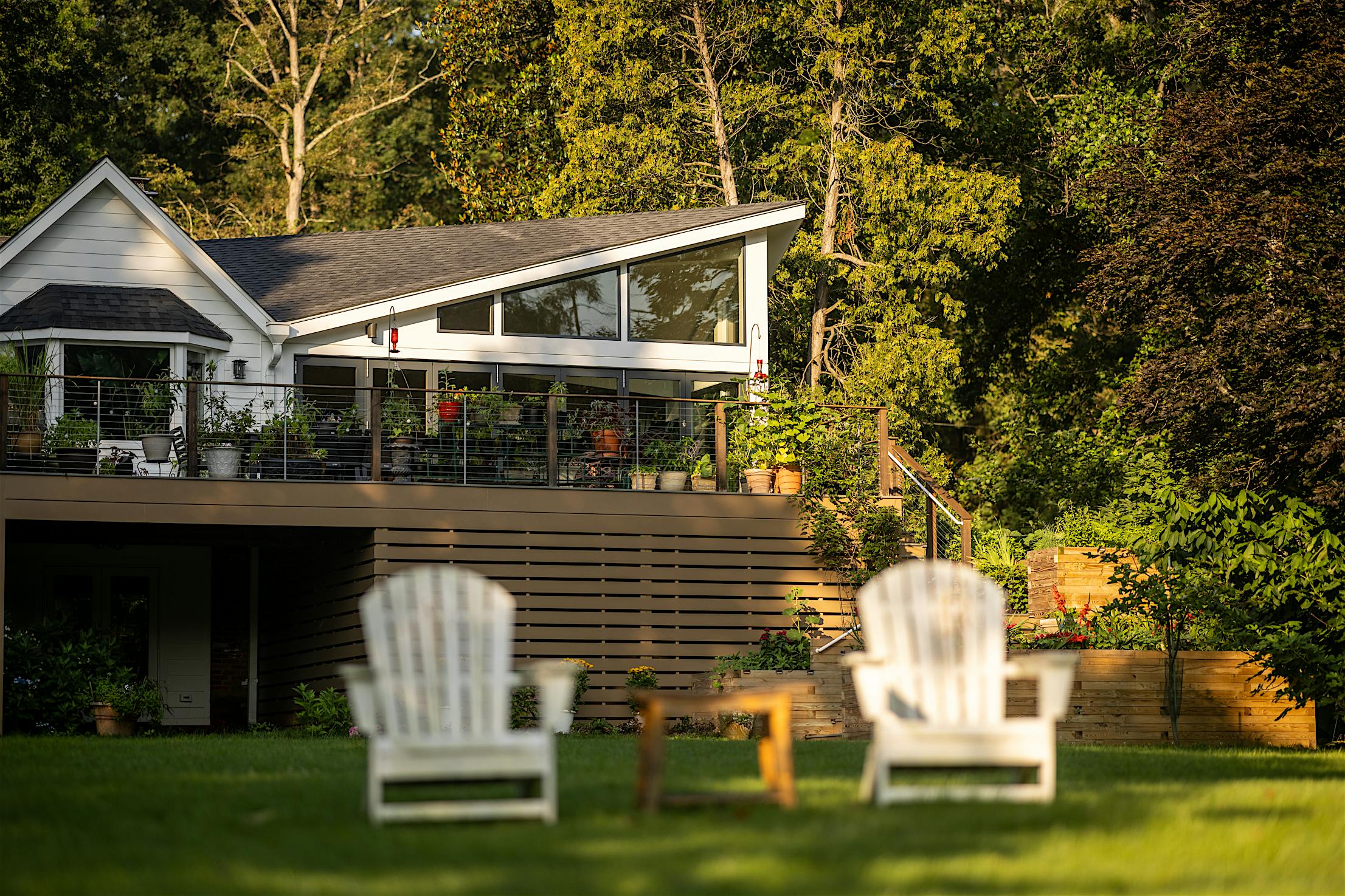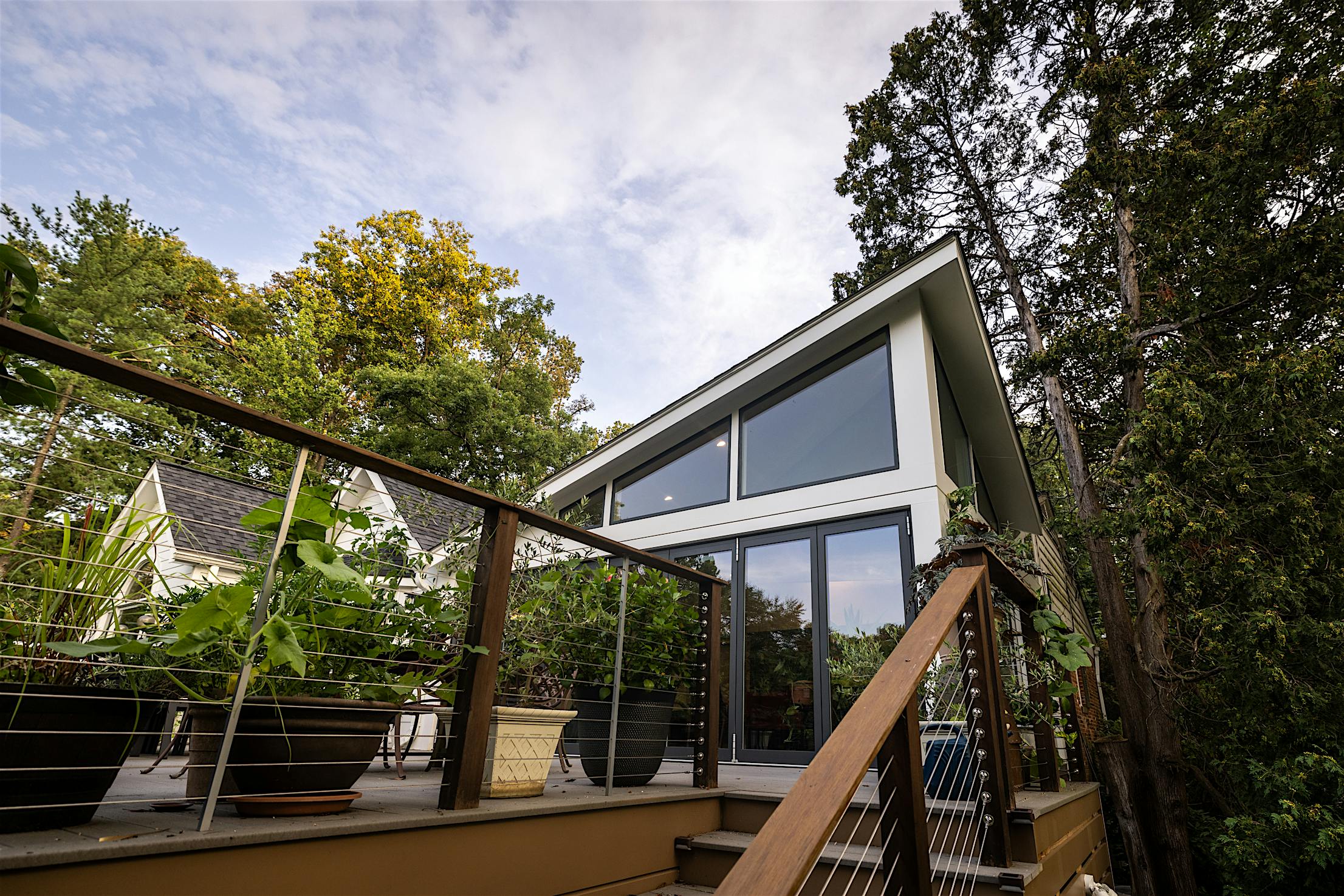 The vision for this Fall Church, VA, deck was to seamlessly connect to the home’s plant conservatory for effortless indoor-outdoor living. Echoing the homeowner’s passion for plants, DuBro Architects and Builders designed a light-filled functional space where plants could thrive and day-to-day living was made easy. Key to the design was integrating an aluminum clad folding glass door to blur the threshold between the deck and conservatory, allowing for one continuous indoor-outdoor living space without the fuzz.