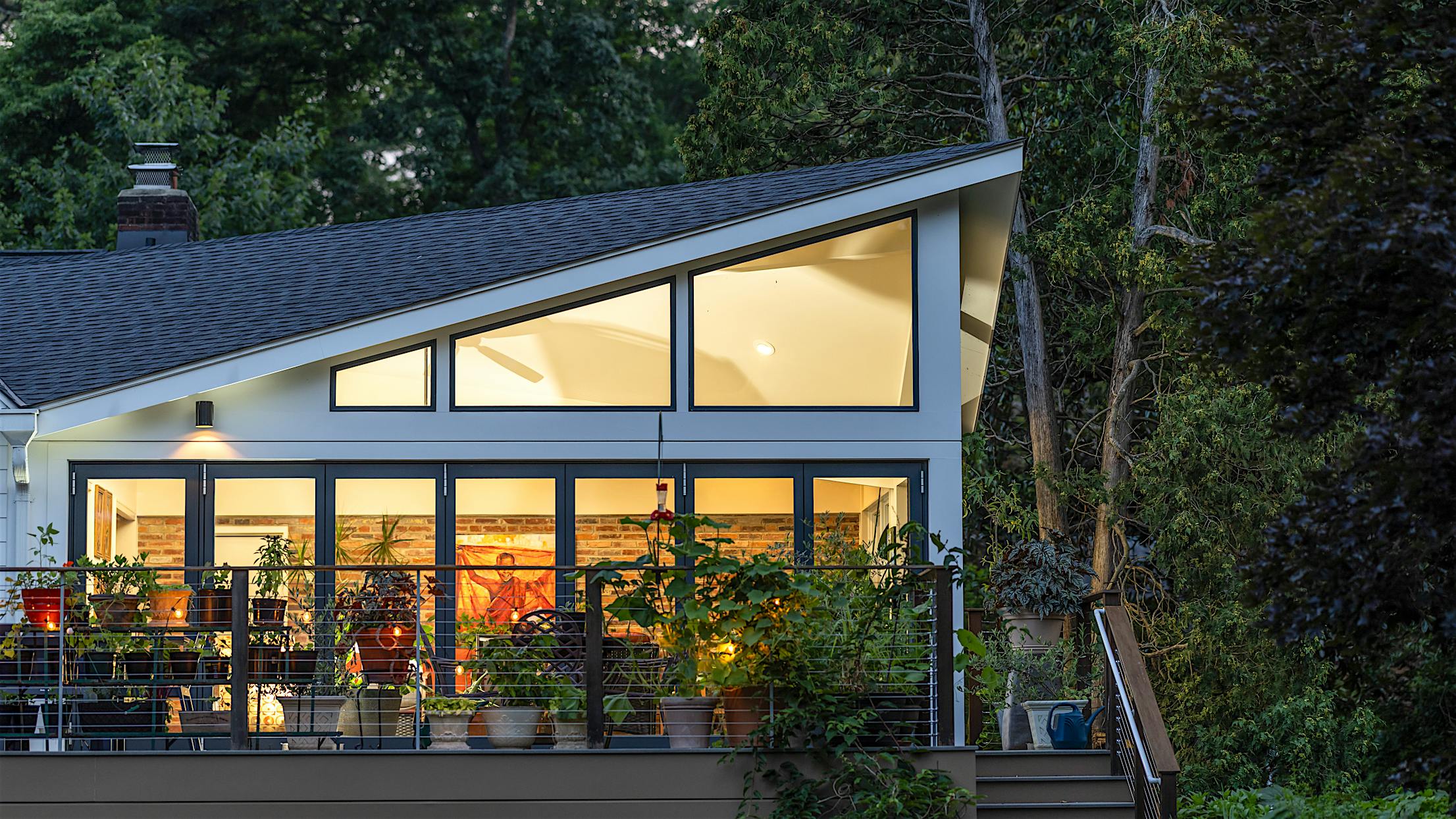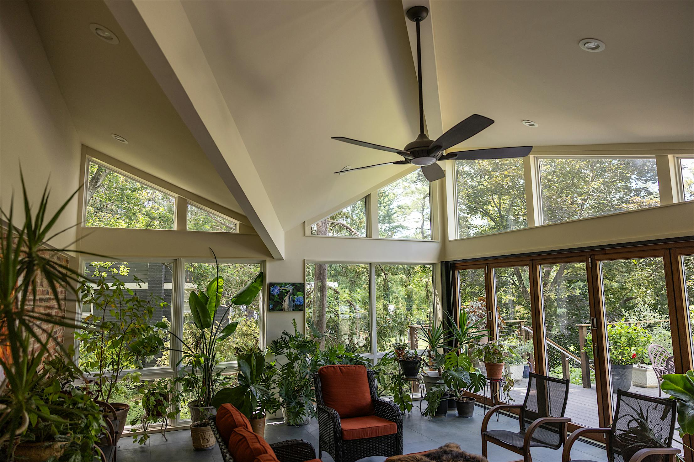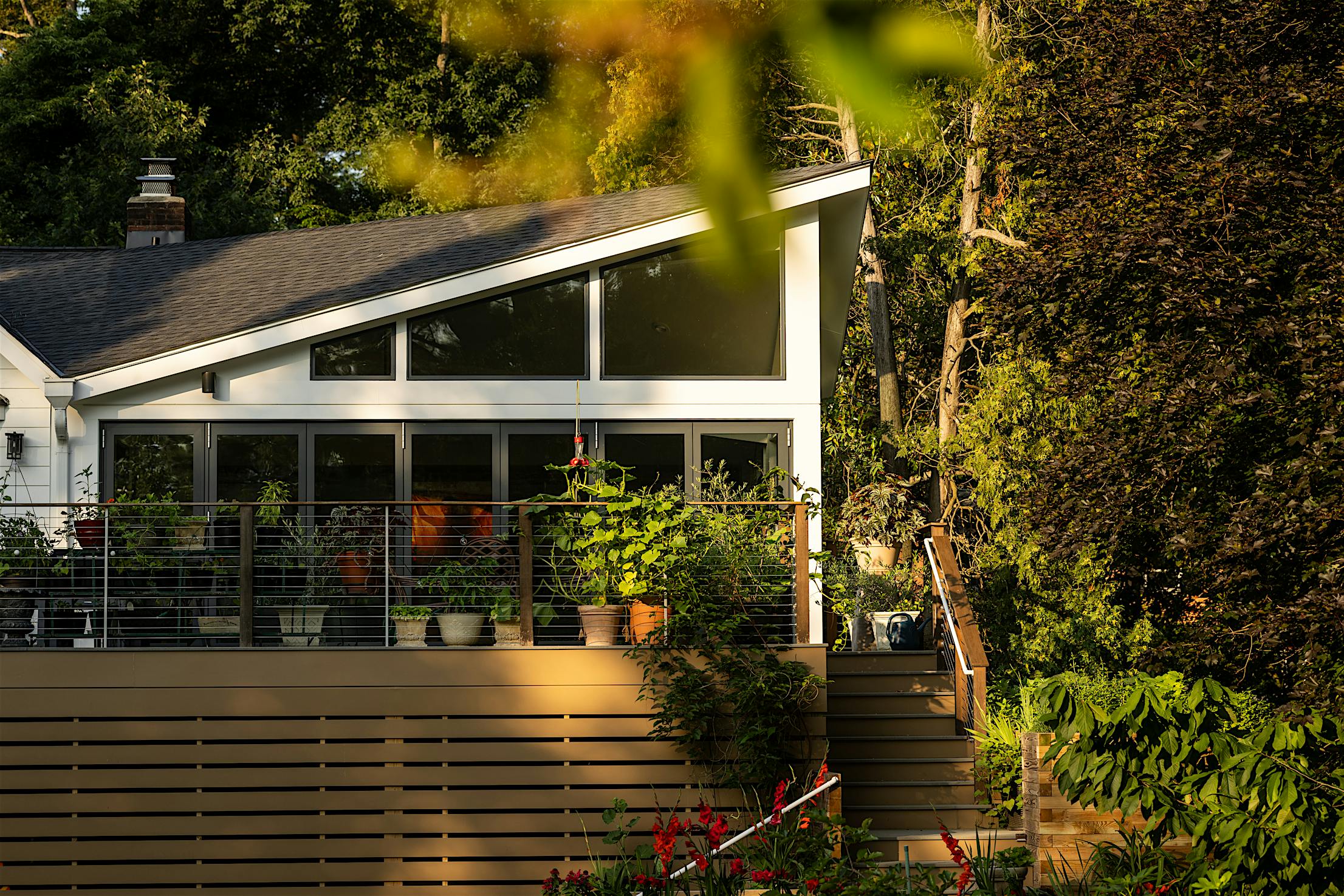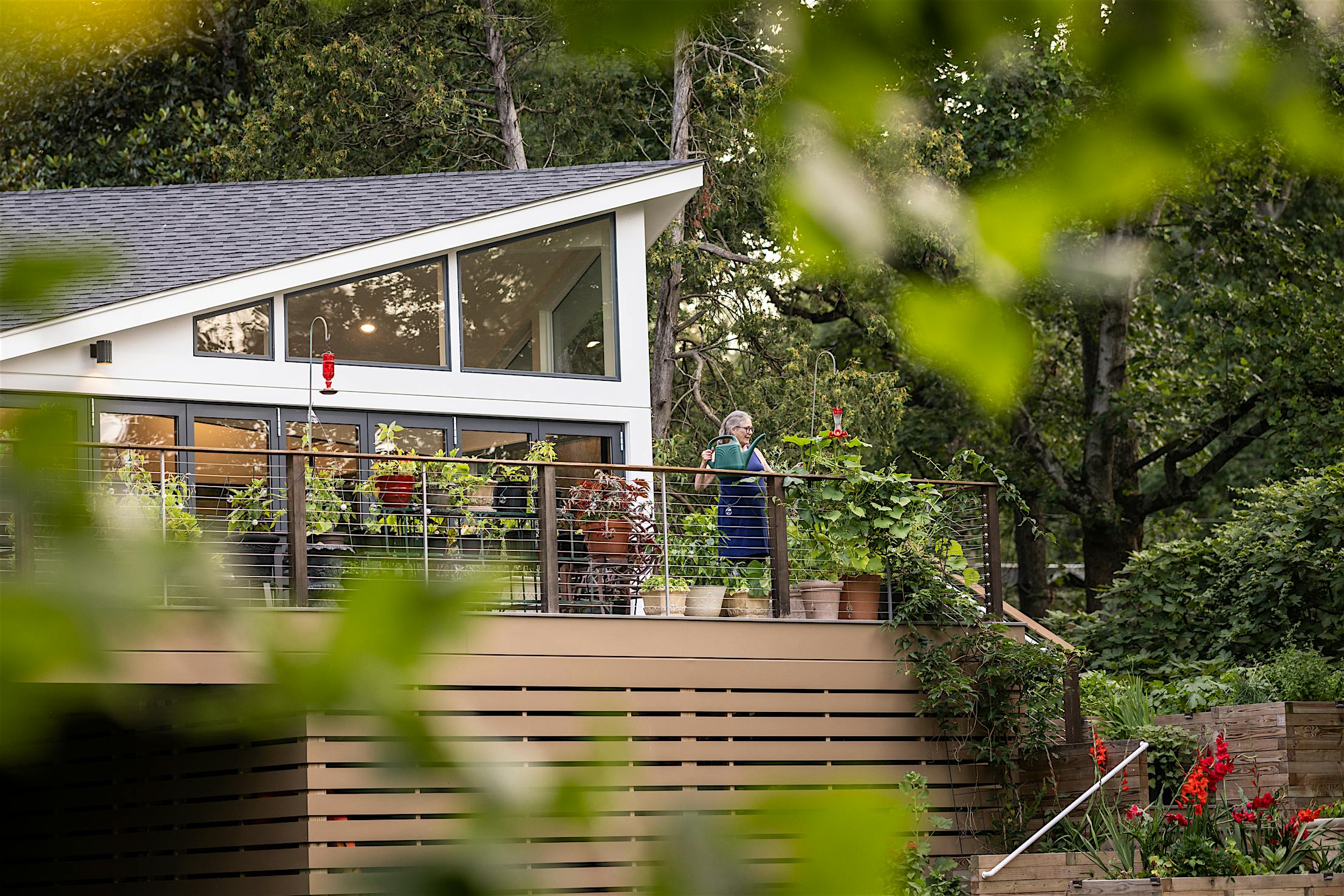 The vision for this Fall Church, VA, deck was to seamlessly connect to the home’s plant conservatory for effortless indoor-outdoor living. Echoing the homeowner’s passion for plants, DuBro Architects and Builders designed a light-filled functional space where plants could thrive and day-to-day living was made easy. Key to the design was integrating an aluminum clad folding glass door to blur the threshold between the deck and conservatory, allowing for one continuous indoor-outdoor living space without the fuzz.
