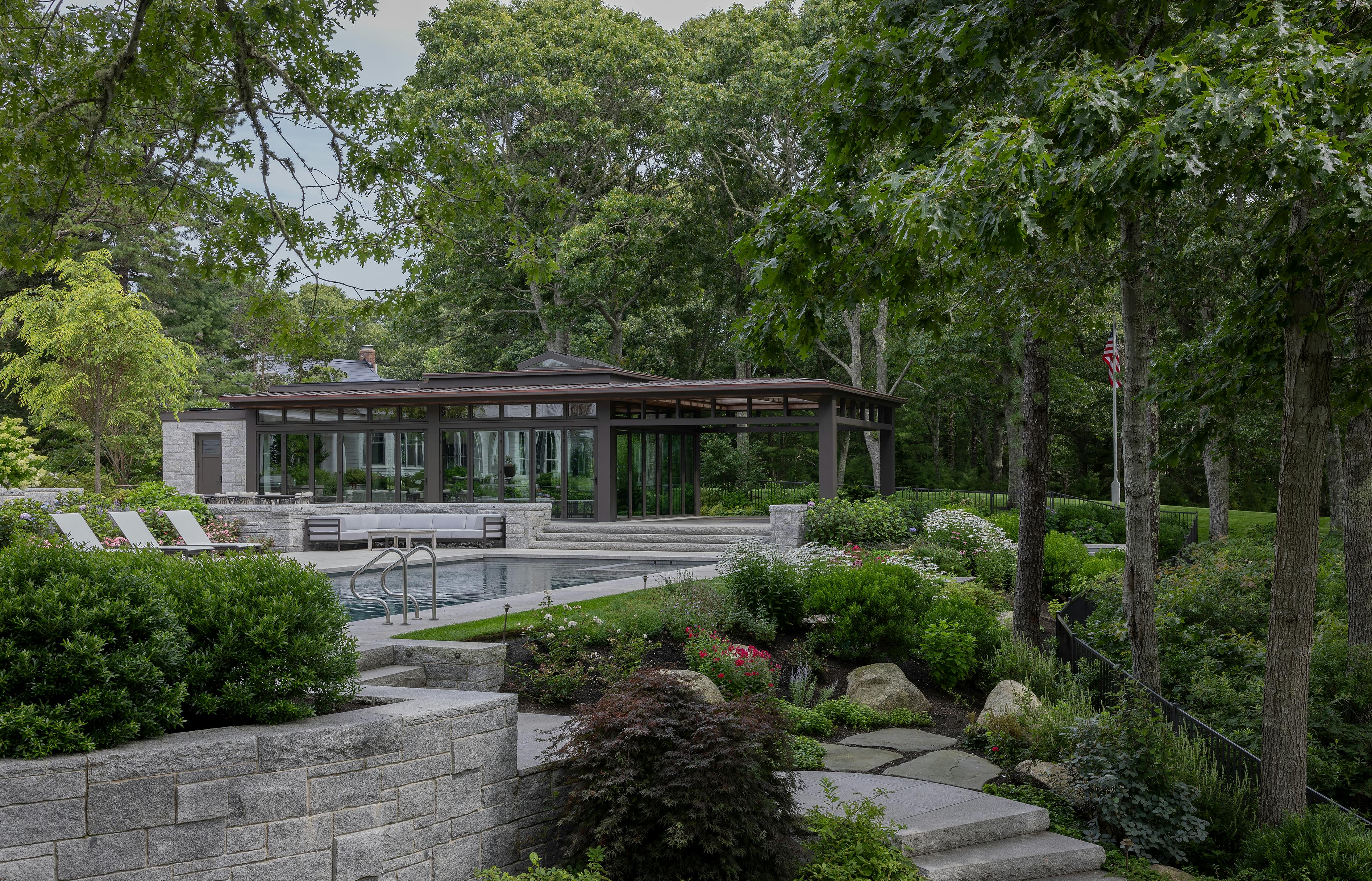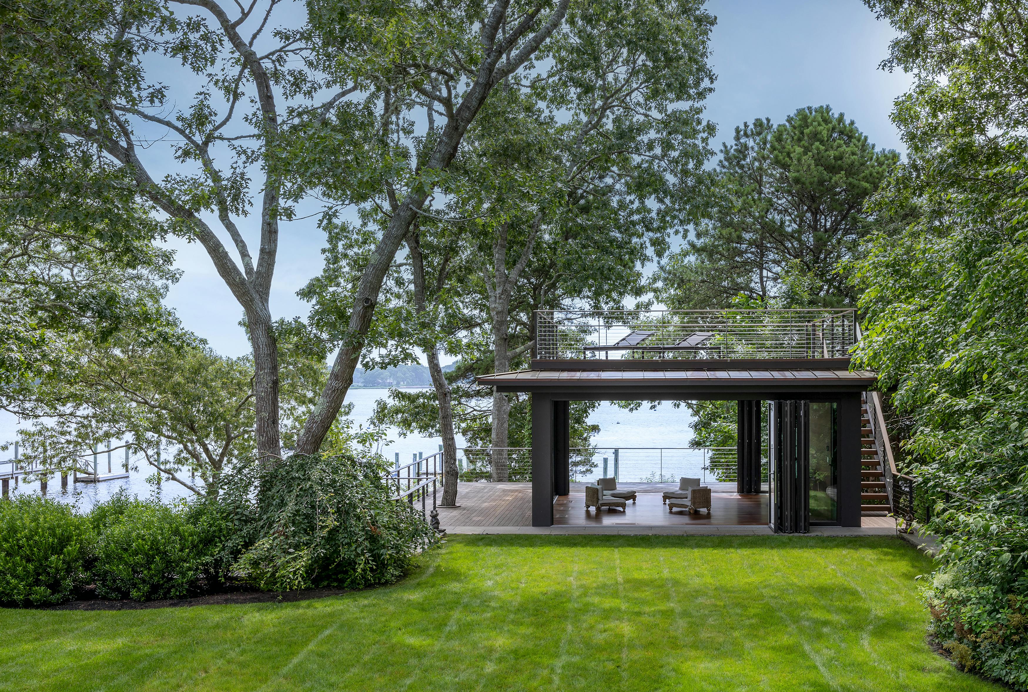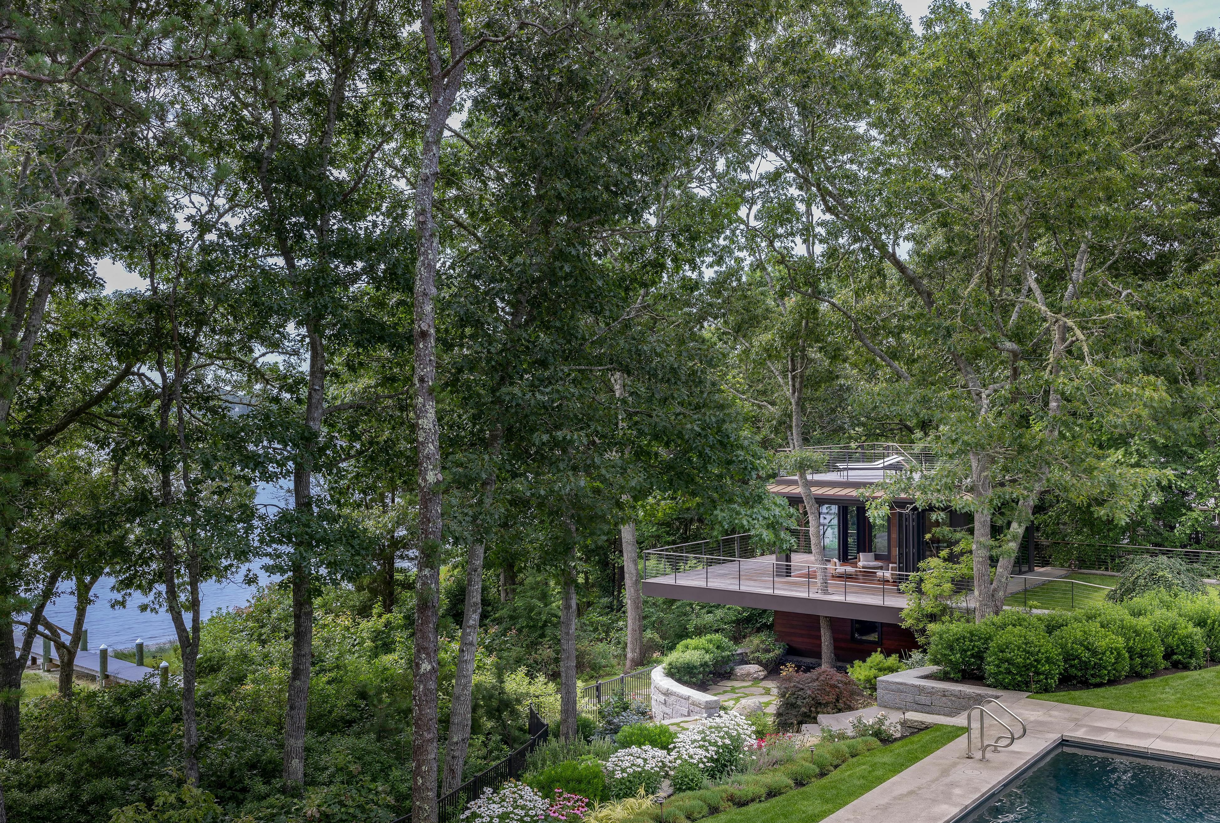 Drawing inspiration from the topography, this Cape Cod project was designed to create open, transparent structures that nestle in the trees and hover above the land. Designed by Doreve Nicholaeff Architecture.