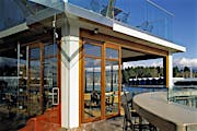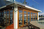 “It is very important to take advantage of the views and have the ability in the summer months to open up the waterfront façades as much as possible,” says Johnson. Yet with a relatively small, 5,000-square-foot floor area, it was also “imperative to find a wall solution that allowed the doors to open and the perimeter tables to become terrace seating, adding to the sense of more space.”