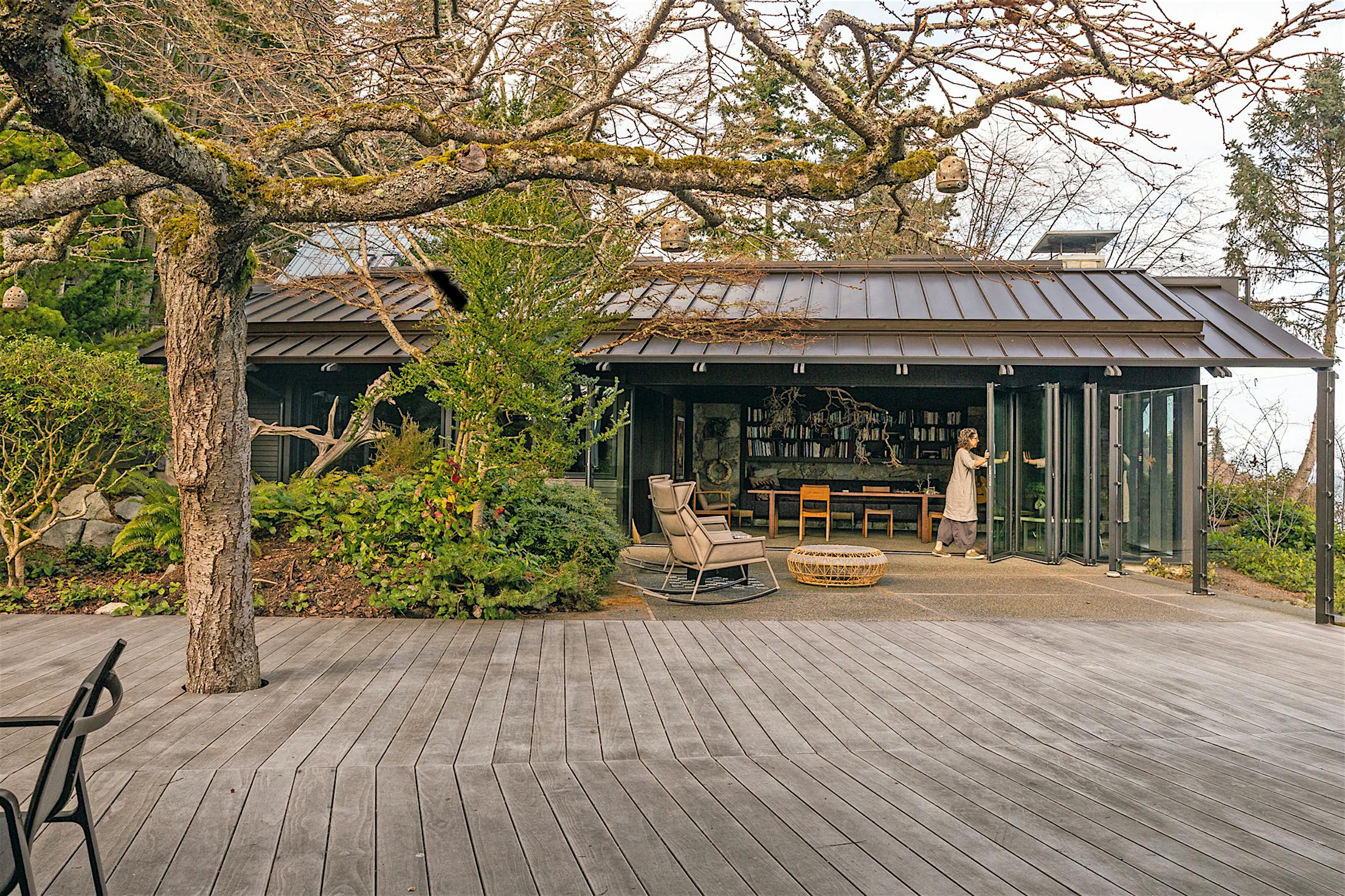 “In some ways the strongest attributes of the house are probably the outside spaces,” says the architect. The team, too painstaking, cared to preserve and enhance the existing flora going as far as relocating an over 6,000-pound Chinese dogwood tree and weaving in mushrooms into the vegetation to help meet the LBC urban agriculture requirement. With its proximity to the water and first-row-seat views to Puget Sound, not to mention abundant greenery, there is truth to that statement. Triple glazed windows and skylights throughout the home offer energy efficiency and protect interiors from the cold, including the 19 ½ foot-wide NanaWall accordion glass doors system in the guest house.