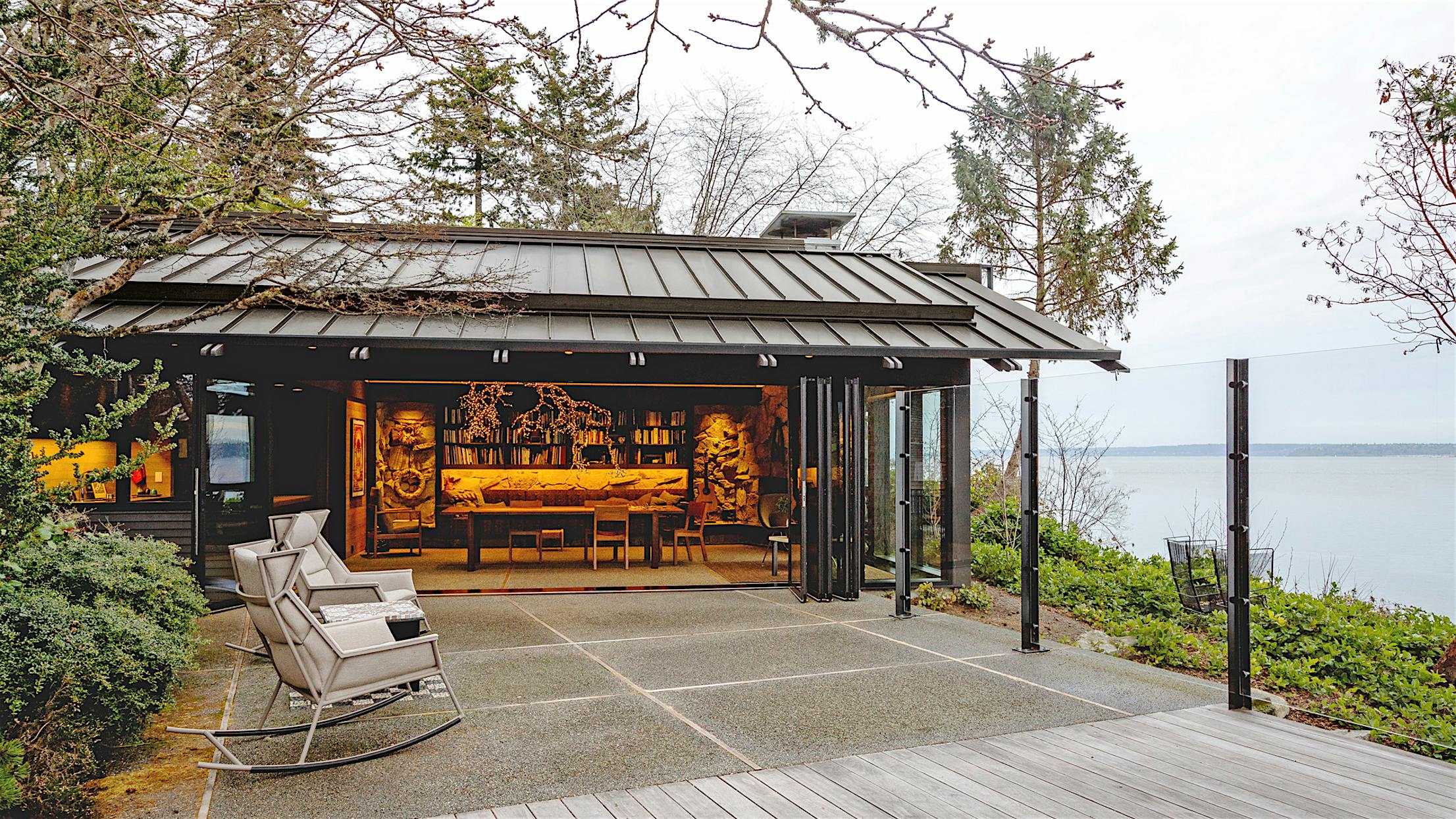 Originally built in the 1960s, this mid-century home is the first renovated home to achieve Living Building Challenge certification, a program that aims to promote sustainability in the built environment. Loom House, perched on a bluff overlooking Puget Sound, is composed of two structures acting as the main house and a guest house with sprawling NanaWall bifold glass walls that doubles as a home office. The two buildings are connected by a partially shaded deck stretched between them. The property’s newest owners sought to enhance the home’s connection to its immediate ecosystem and enlisted the expertise of The Miller Hull Partnership to renovate the existing structures into a sustainable property that made use of its surrounding natural resources.