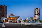 The building is distinguished by a swooping, soaring canopy. It seems, at first glance, like it is all roof with no walls at all. It subtly references Detroit’s rich historic involvement with both automobiles and music. “We intended to make the building like a machine, like a car: slender rooflines, louvered grills, concealed equipment,” says architect Touloukian. “Another aspect is its reference to music. The building geometry and wood ceiling louvers undulate with a rhythm unique to itself.”