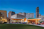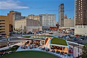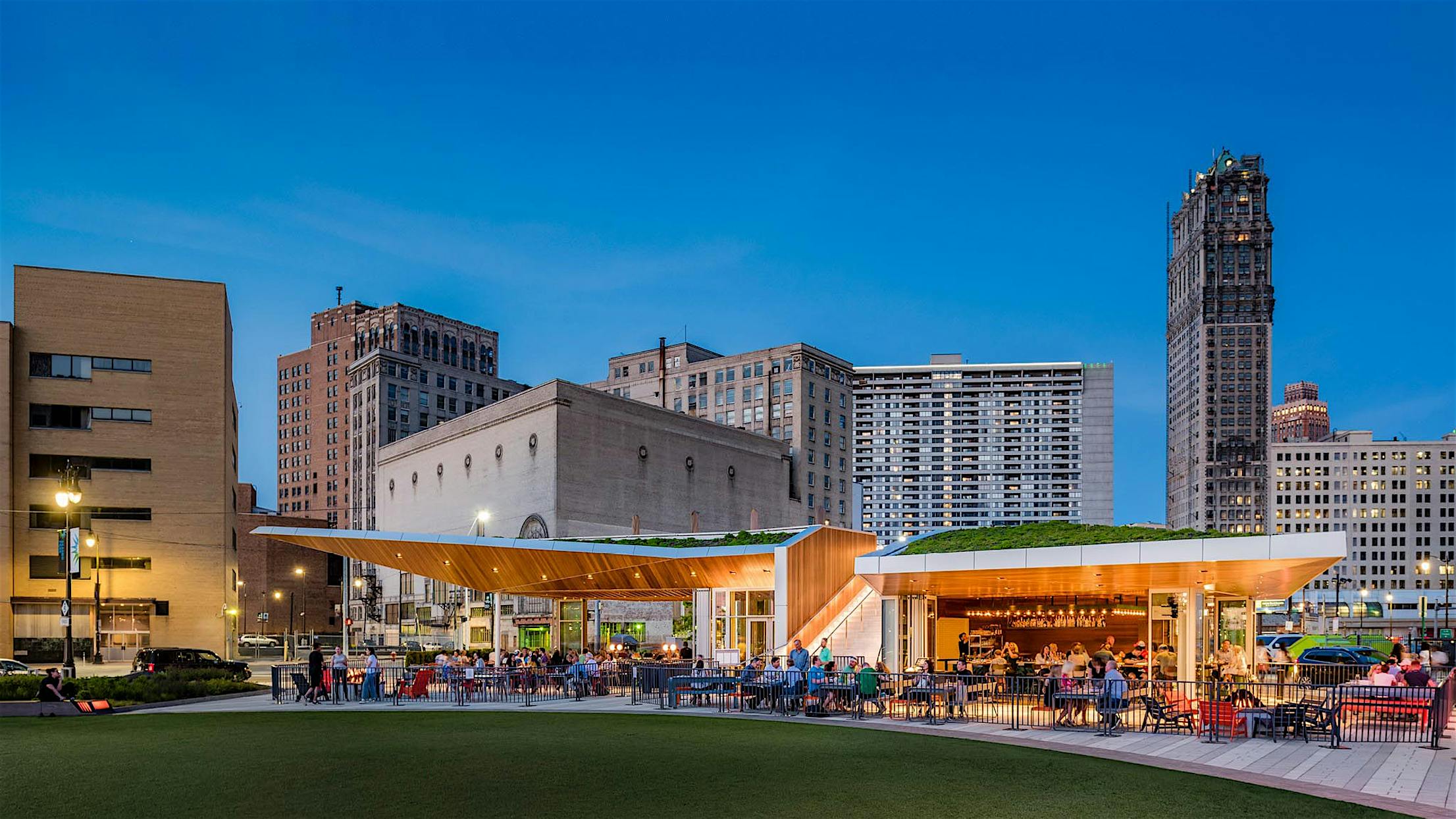 The owner, DTE Energy, a diversified energy company that is, among other things, the electric and natural gas utility for the region, has its roots in Detroit going back to 1849. DTE’s CEO Gerry Anderson had a vision of a great public space in the empty lot facing the company’s headquarters, and he made it happen. The result was Beacon Park, designed by landscape architect livingLAB (Detroit MI), which opened in July 2017, anchored by the Lumen restaurant building.