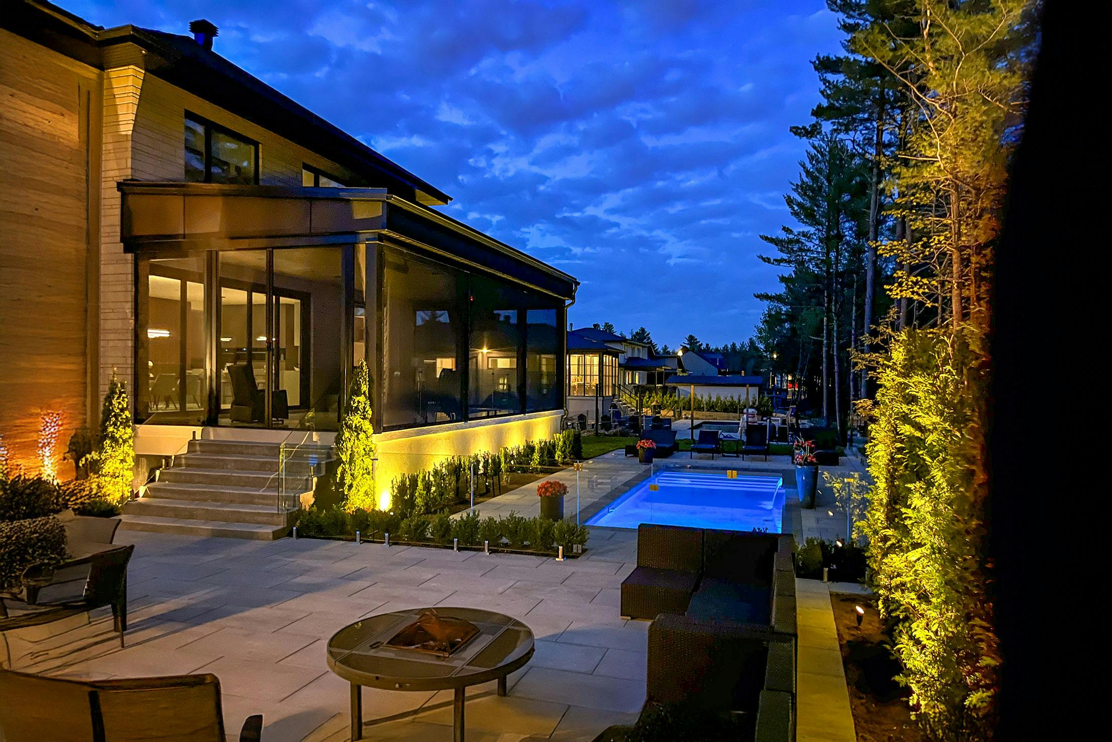 The four-season open-air porch was designed to maximize views of the lake, yet the tightly sealed operable glass walls keep the interior warm and draft-free in the winter. In the summer, NanaScreen protects against mosquitoes and moths.