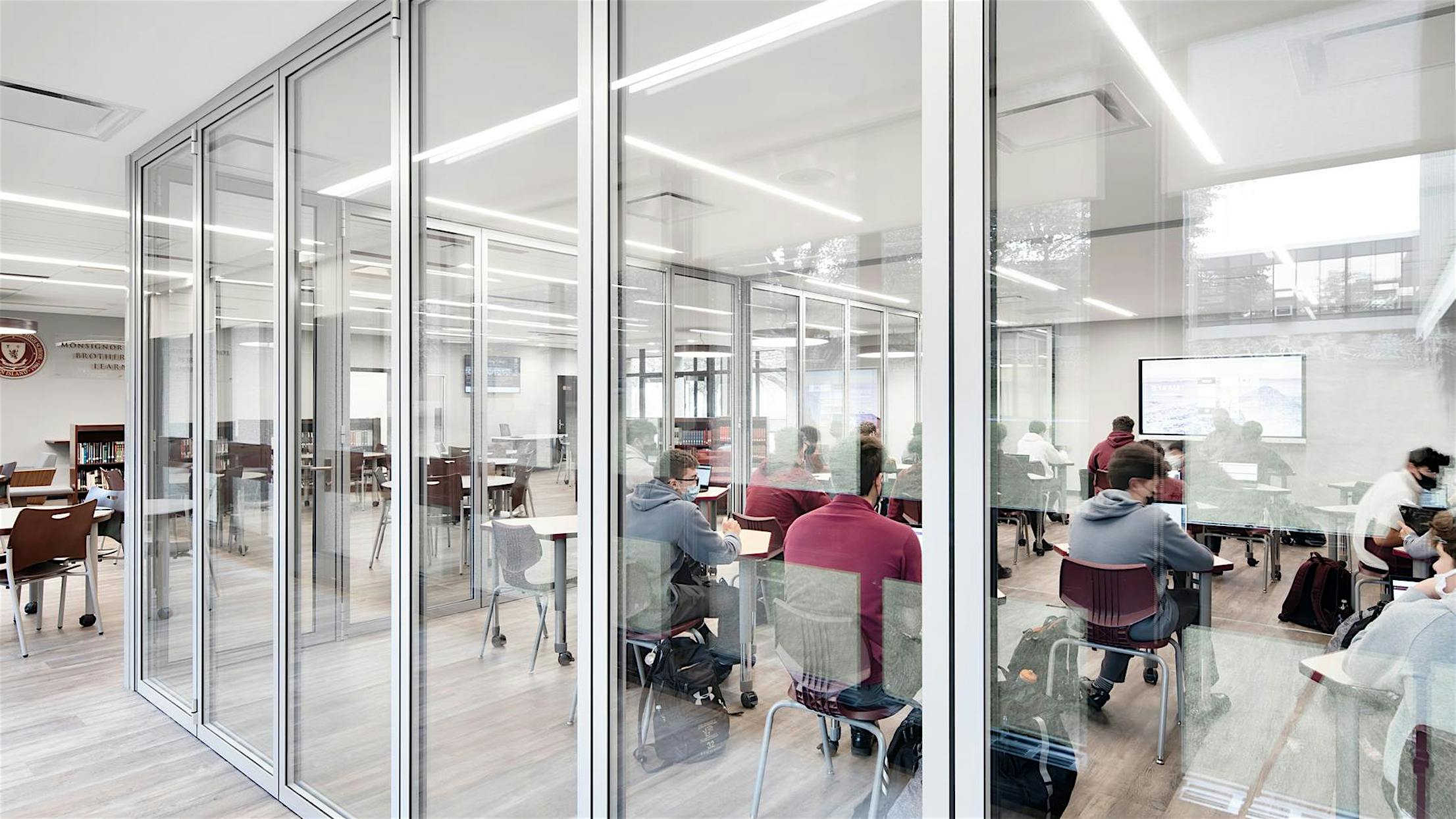 Monsignor Farrell High School, situated in New York City’s southernmost borough of Staten Island, is one of the many schools adapting 21st Century learning spaces within their campus with acoustic glass wall systems. Opened in 1961, the all-boys Catholic school’s primary mission is to provide quality education for its students while challenging them to develop their talents and ideas. Part of their strategy involved adopting 21st Century school standards with forward-thinking classroom design and sustainable building materials. Their first endeavor—reimagining the library into what is now the Learning Commons, a multi-use, flexible learning area for teachers and students alike.