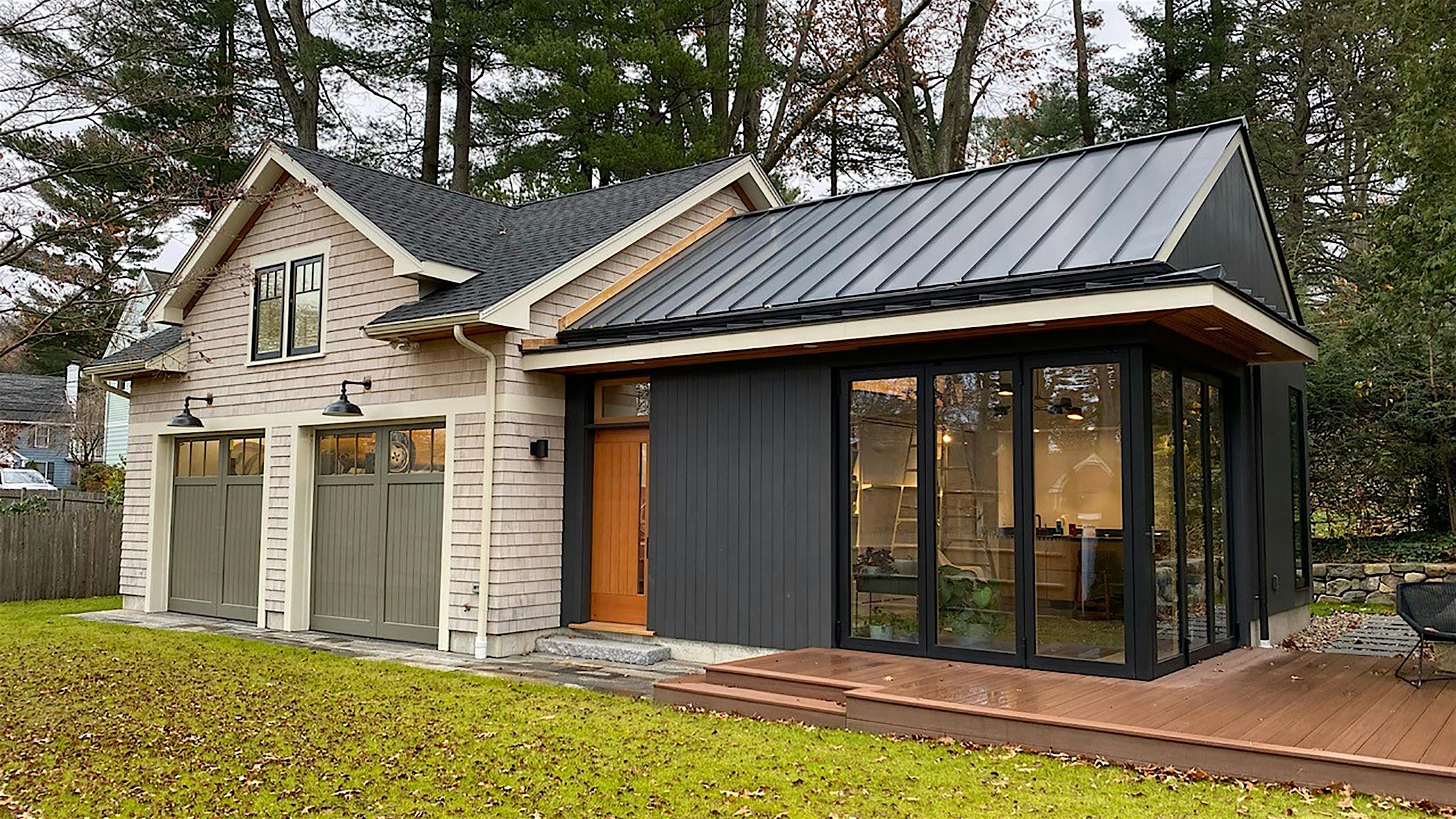 As we came to love about Europe, the house had a set of doors that opened on the corner onto a deck where we were able to enjoy the most beautiful sunsets without interruption. Having no corner post was so fantastic that when we began our own project for a garage/art studio, we knew we had to figure out a way to engineer it into our plans.