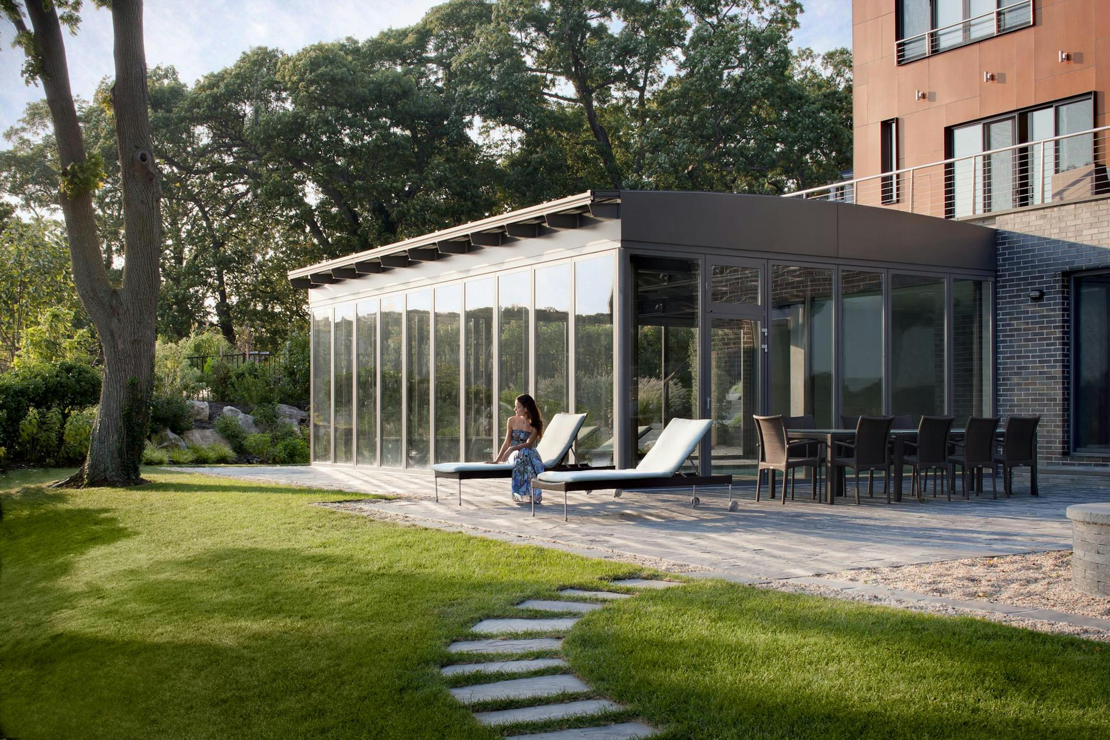 One of the many reasons Winter loves NanaWall is that the product allowed him so many practical and aesthetic options. He was able to use very thin panels, yet they are extremely weather resistant; the thin glass withstood Hurricane Sandy’s onslaught, he reports. In addition, NanaWall offered Winter different width options, which was essential so that his design “would not become boring ” .