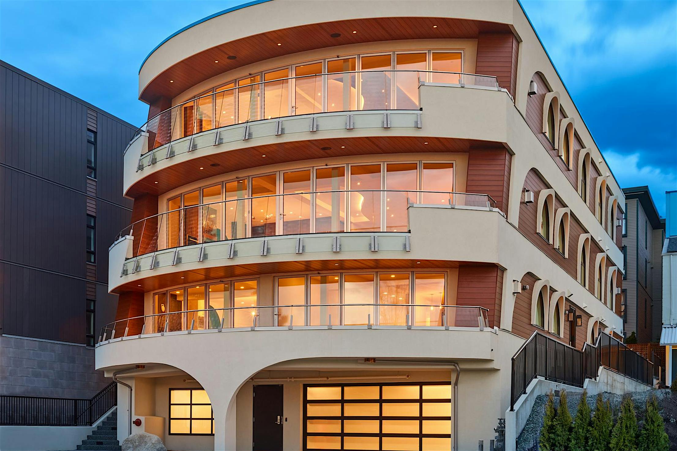 The lower 3 floors include commercial, retail, and office space, with Nanawall systems blending indoor-outdoor spaces for the daycare and fitness centers located on the ground floor.