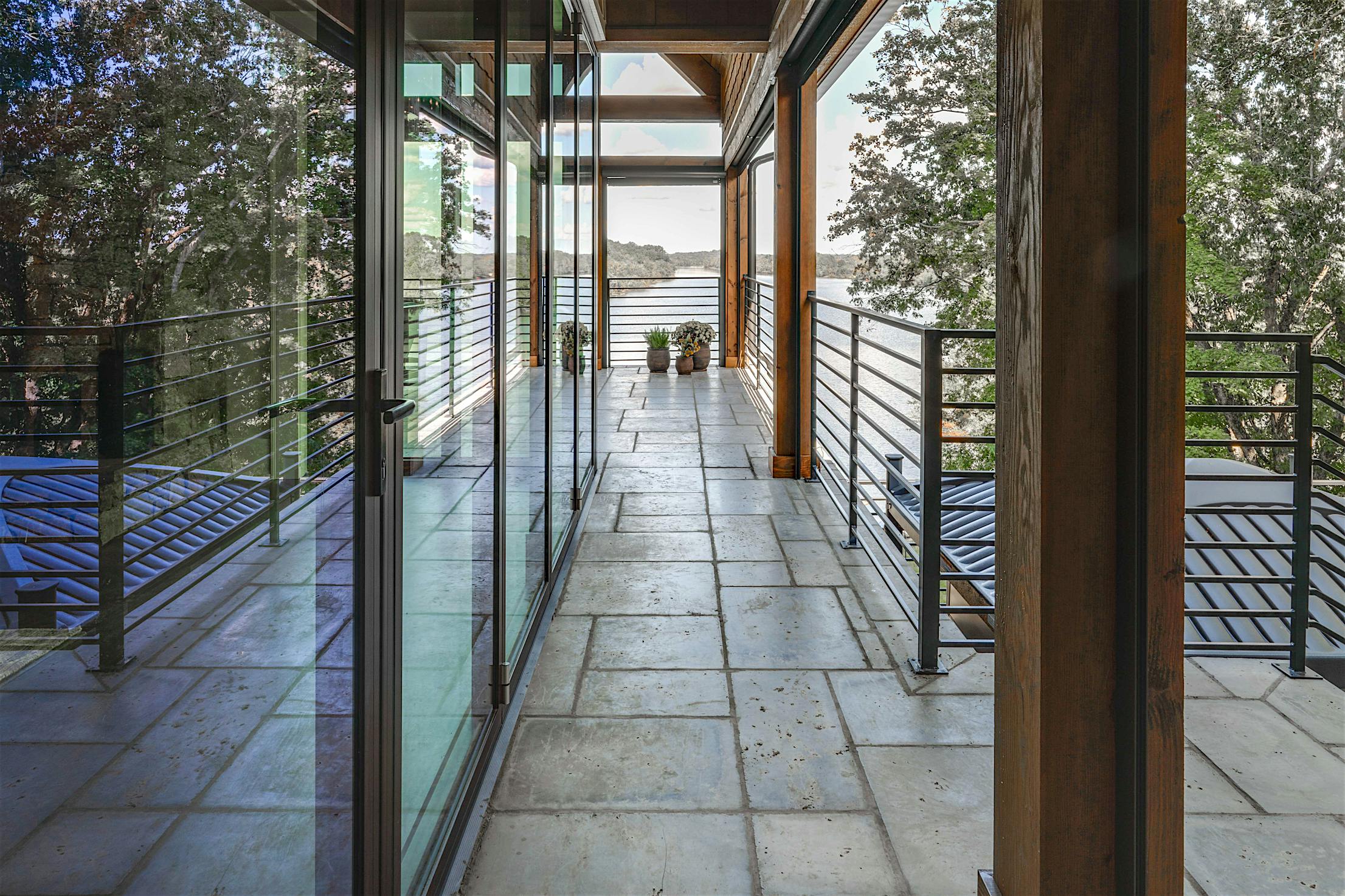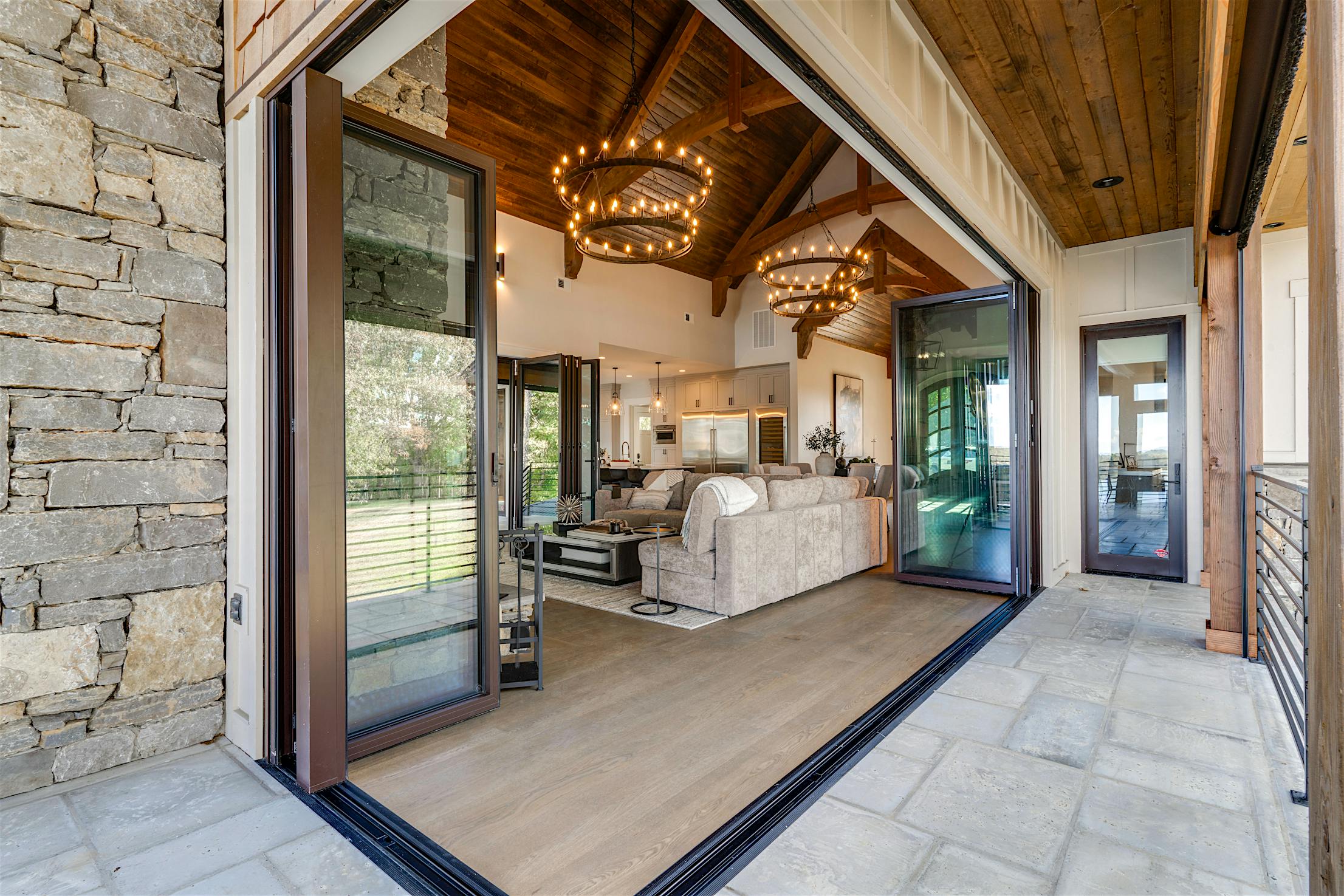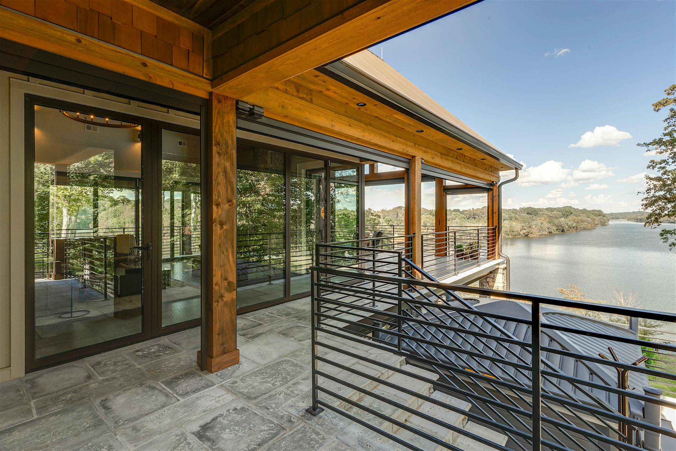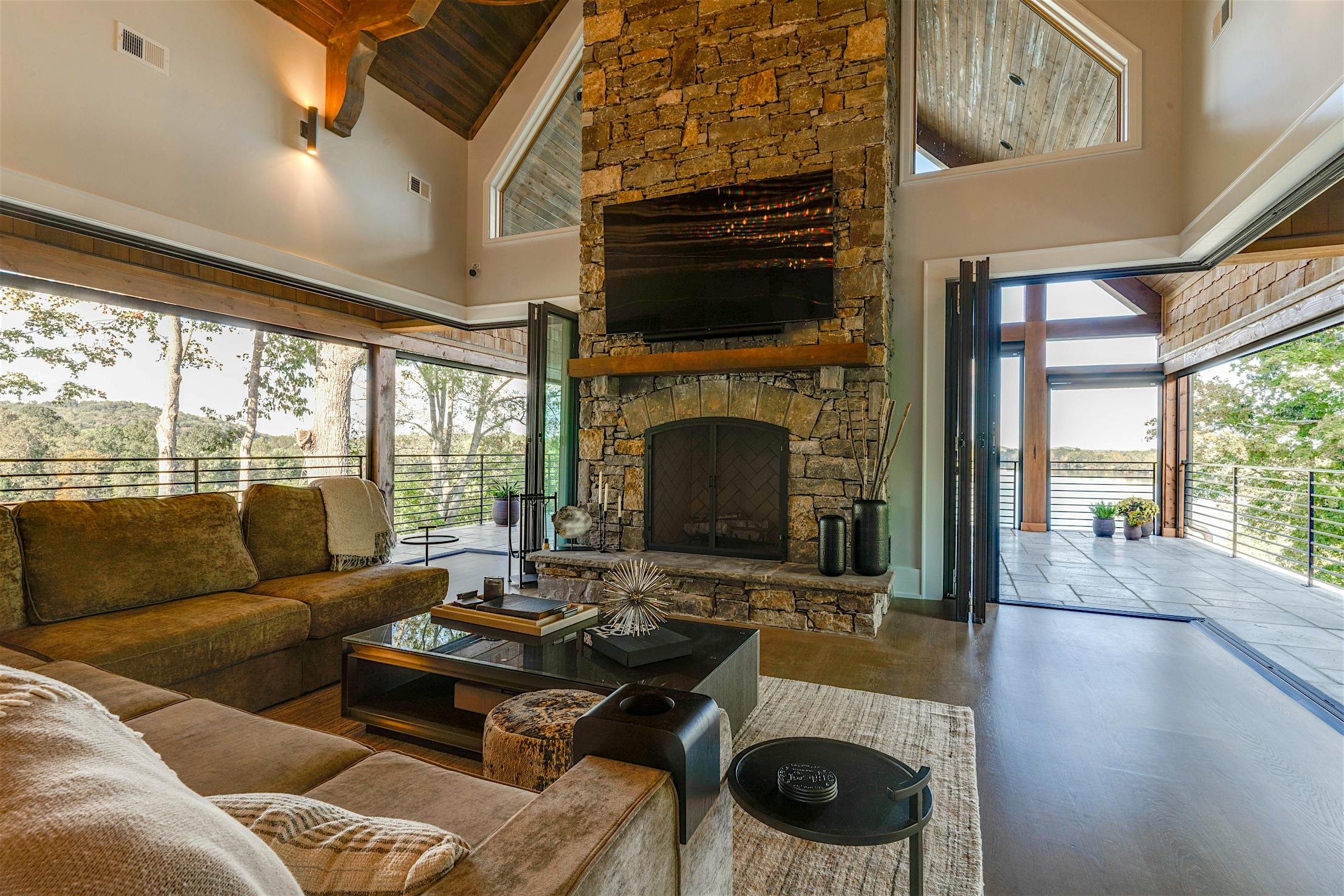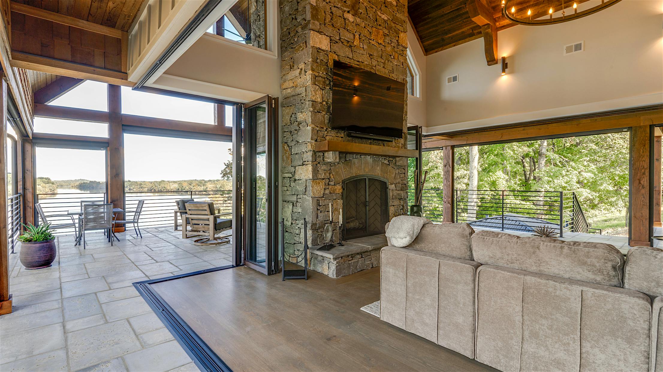 Perched on a spectacular lakeside site, this Lebanon, TN, residence was envisioned as a timeless retreat that celebrates its surroundings while fostering connection and comfort. The team at Home Design Works set out to dissolve the boundary between indoors and out, taking full advantage of the site’s panoramic views. In the living room, rustic yet charming architecture invites laid-back relaxation while enjoying the calming sounds of the river below, with two disappearing NanaWall open corner bifold glass doors that merge the interiors with the outdoor living spaces.