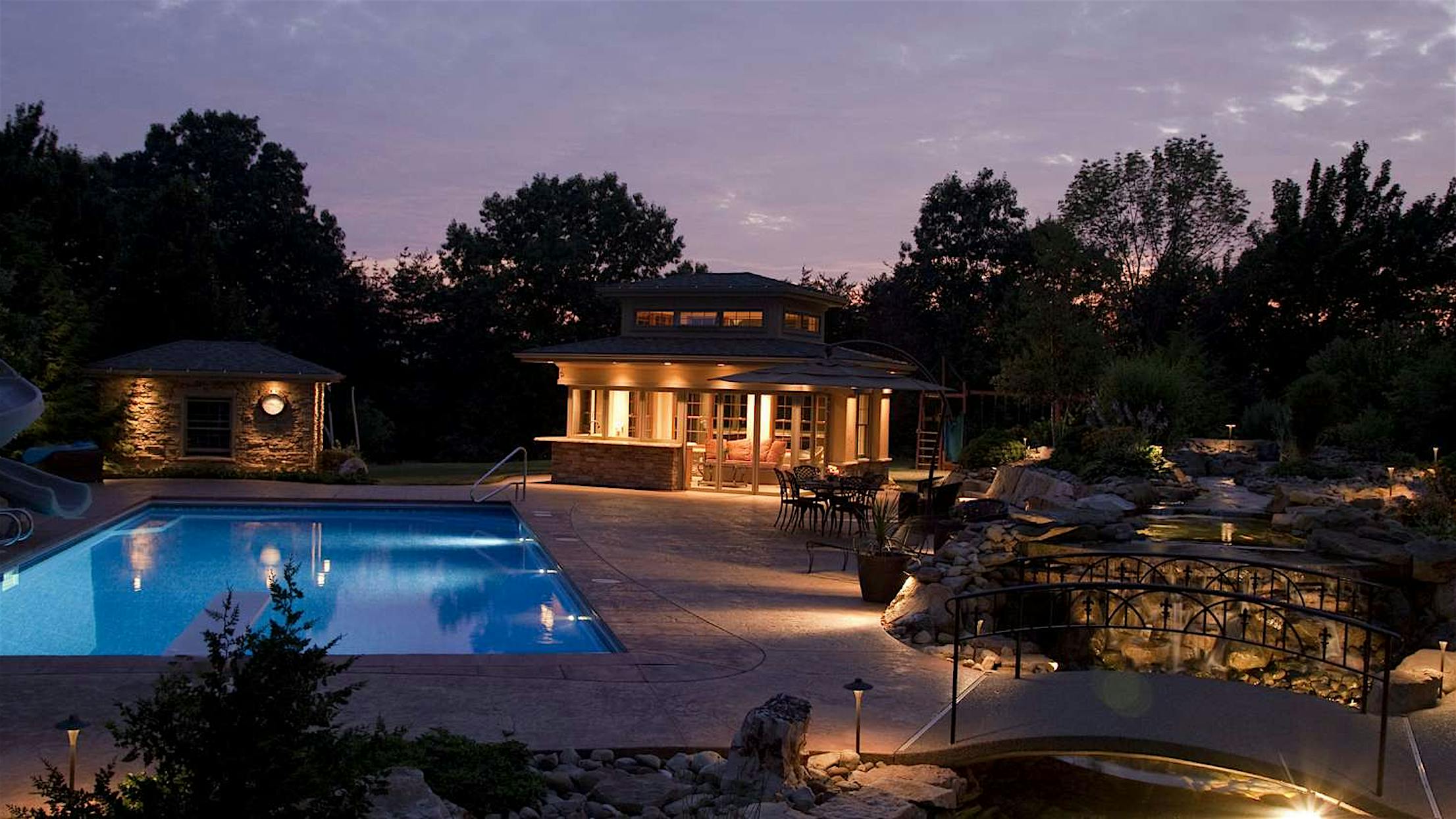 Separating the pool area from the main house is the spectacular stream, layered like a canal past a footbridge. At night, landscape lighting shimmers onto the waterfalls, stones and fish.