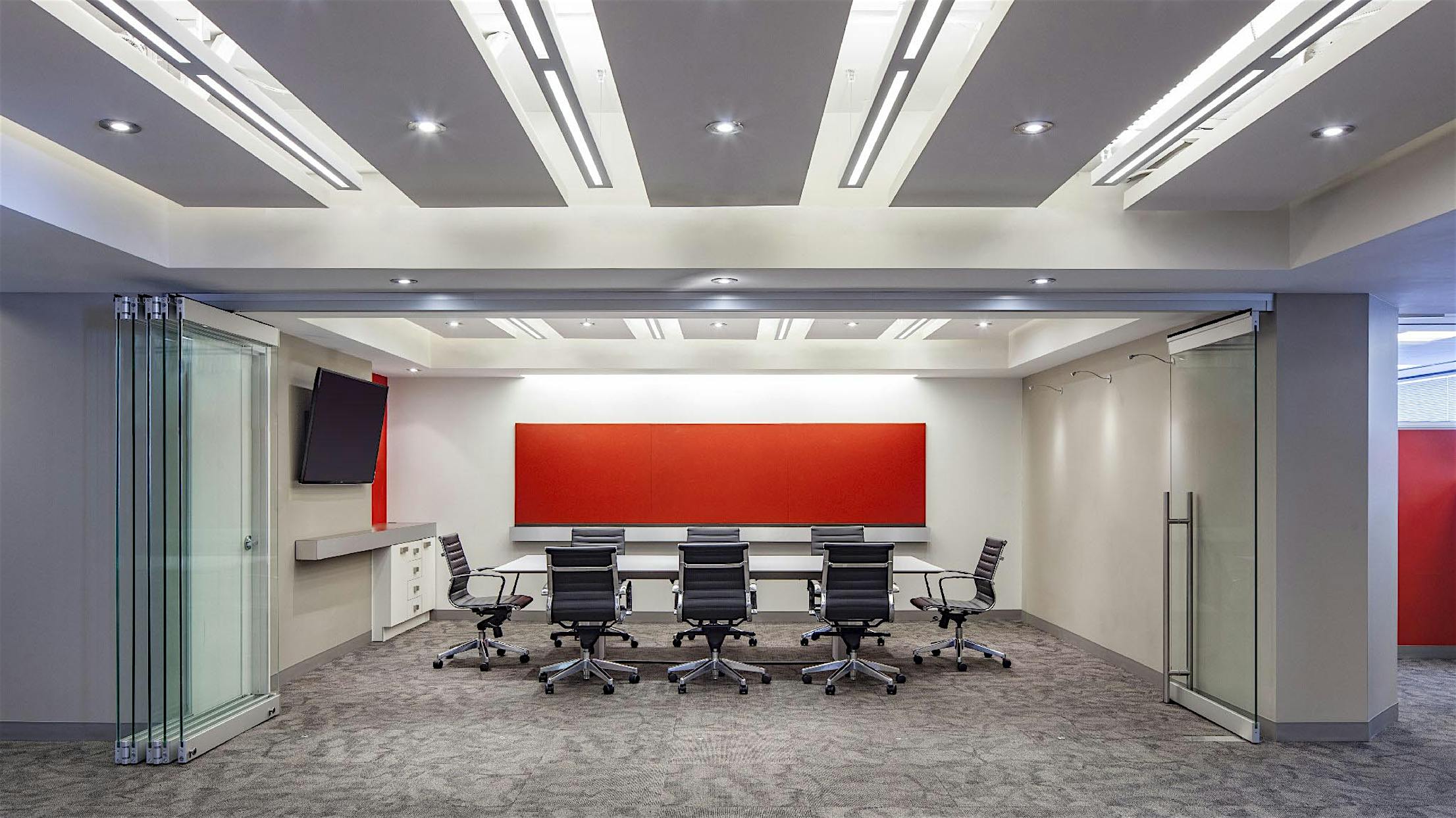 The existing lobby was, according to MV+A senior architectural designer Lynn Murphy, dark and dingy. “It felt like a cave.” To transform it into a welcoming place and visually unify it with the conference room, MV+A designed a lighting scheme that focused and enhanced the linearity of the existing hanging LED strips, using bars of light to emphasize the extension of one room into the other.