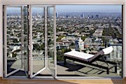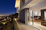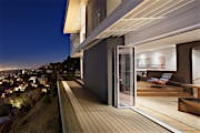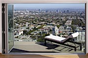 “The deck area in front of the house is limited, because of the steep slope," says Boutry, in reference to the location on the incline of the Hollywood steep outcroppings. Boutry decided after brief contemplation to recommend 11 panels of NanaWall's SL45 Aluminum Framed Folding System. The glass doors would occupy the three openings his design would create, a vast opening to the views.