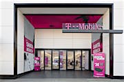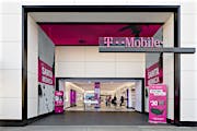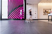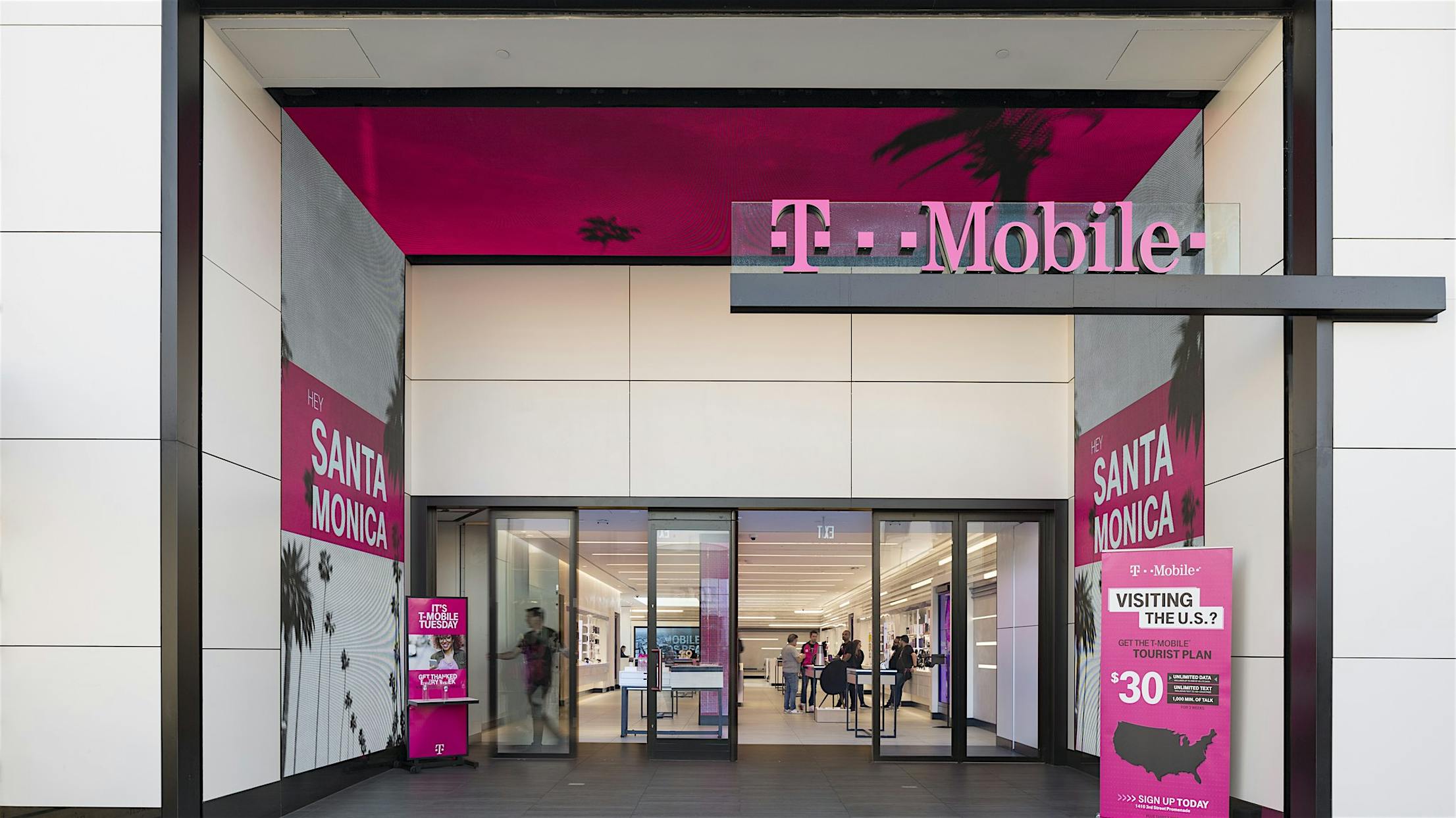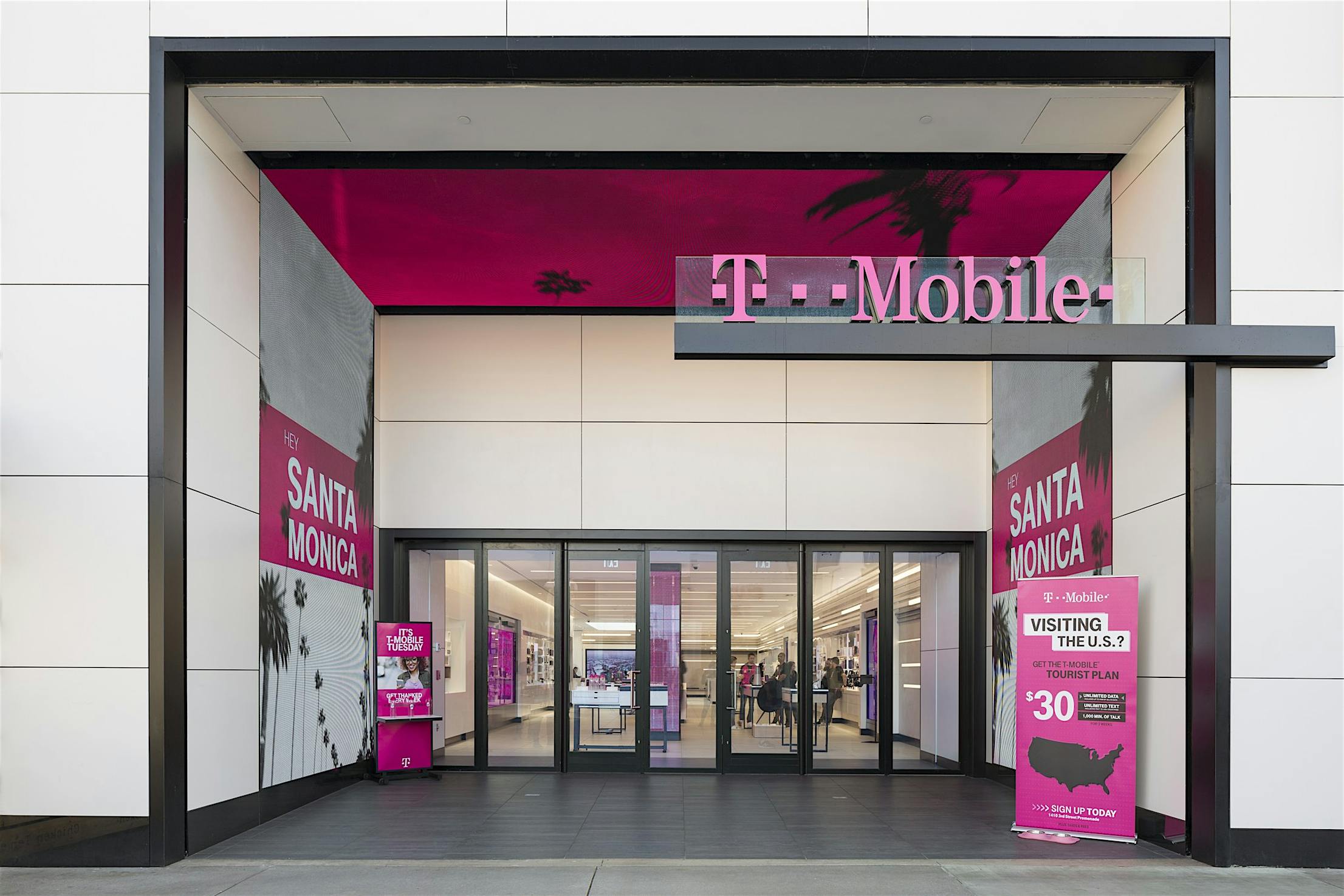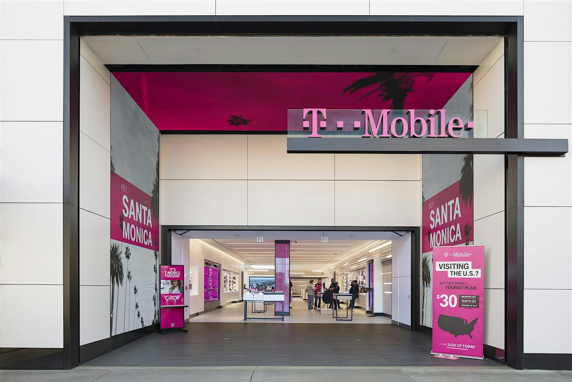 Located in Santa Monica California, this T-Mobile store takes advantage of its prime location. The grand entry is framed by a design element within the building which gives a picture-like effect to the entrance. Passerby are lured in by eye catching pink signage and a large inviting transparent opening that allows for a peek inside the mobile retailer.