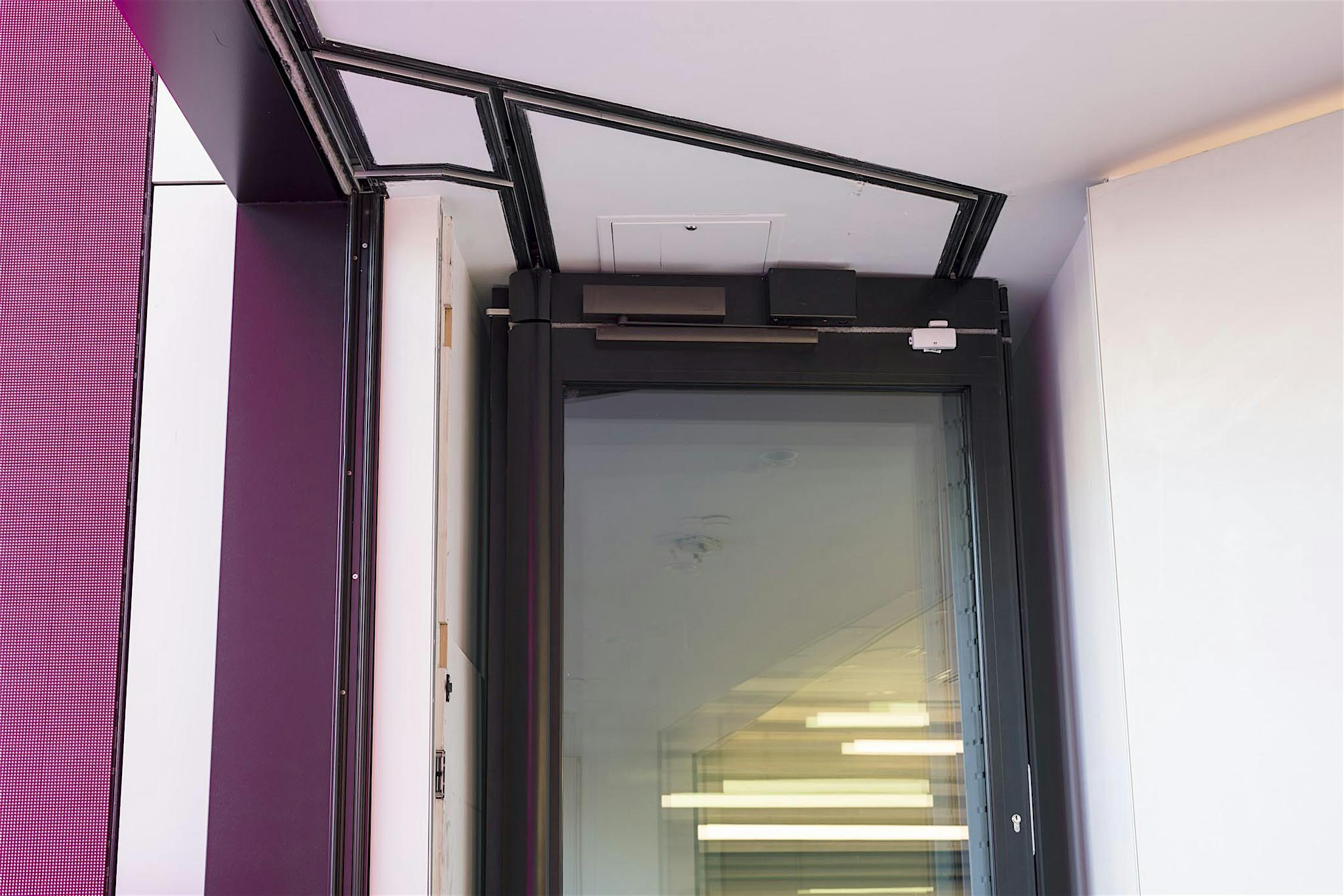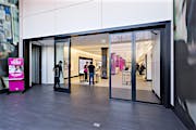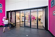 NanaWall HSW60’s multiple configuration options offered this T-Mobile retailer the ability to incorporate swing panels where needed within the system. The ability to design the location of the swing panels where needed aids in the control of traffic when entering and exiting the store. “The opening allows our salespeople to move out into the promenade and directly engage customers beyond the entrance of the store,” says T-Mobile General Manager. “This facilitates them to hand off the customer to an associate inside the store.” The storefront design uses two swing doors positioned with a sliding panel in between them to keep patrons from coming into close contact with each other and maintain social distancing. The design smartly allows for one door to primarily serve as entry and the other as exit. The HSW system is a top-hung system that features an enhanced intelligent horizontal roller and guide track technology—allowing each individual panel to move effortlessly around corners and posts if necessary.