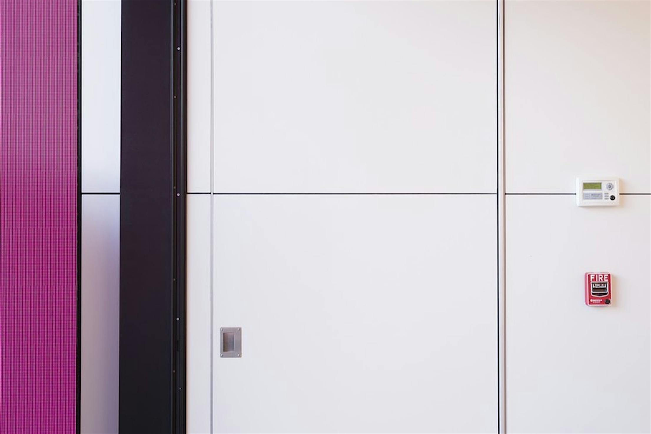 This HSW60 system fully eliminates barriers and achieves ADA compliance with its lack of floor track. With the option of no floor track with this single track sliding system, each individual panel locks securely into recessed floor sockets within the finished flooring. When closed, two incorporated swing doors outfitted with kickplates provide easy ingress and egress and can convert back into sliding panels to be stored away when needed. Transparent glass offers clean unobstructed views to the inside as if no walls existed at all. The minimal black finished frames further enhance the aesthetic to match the framed edges of the overall façade.