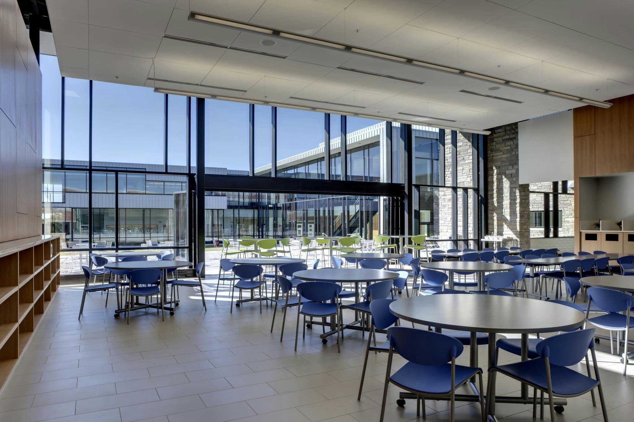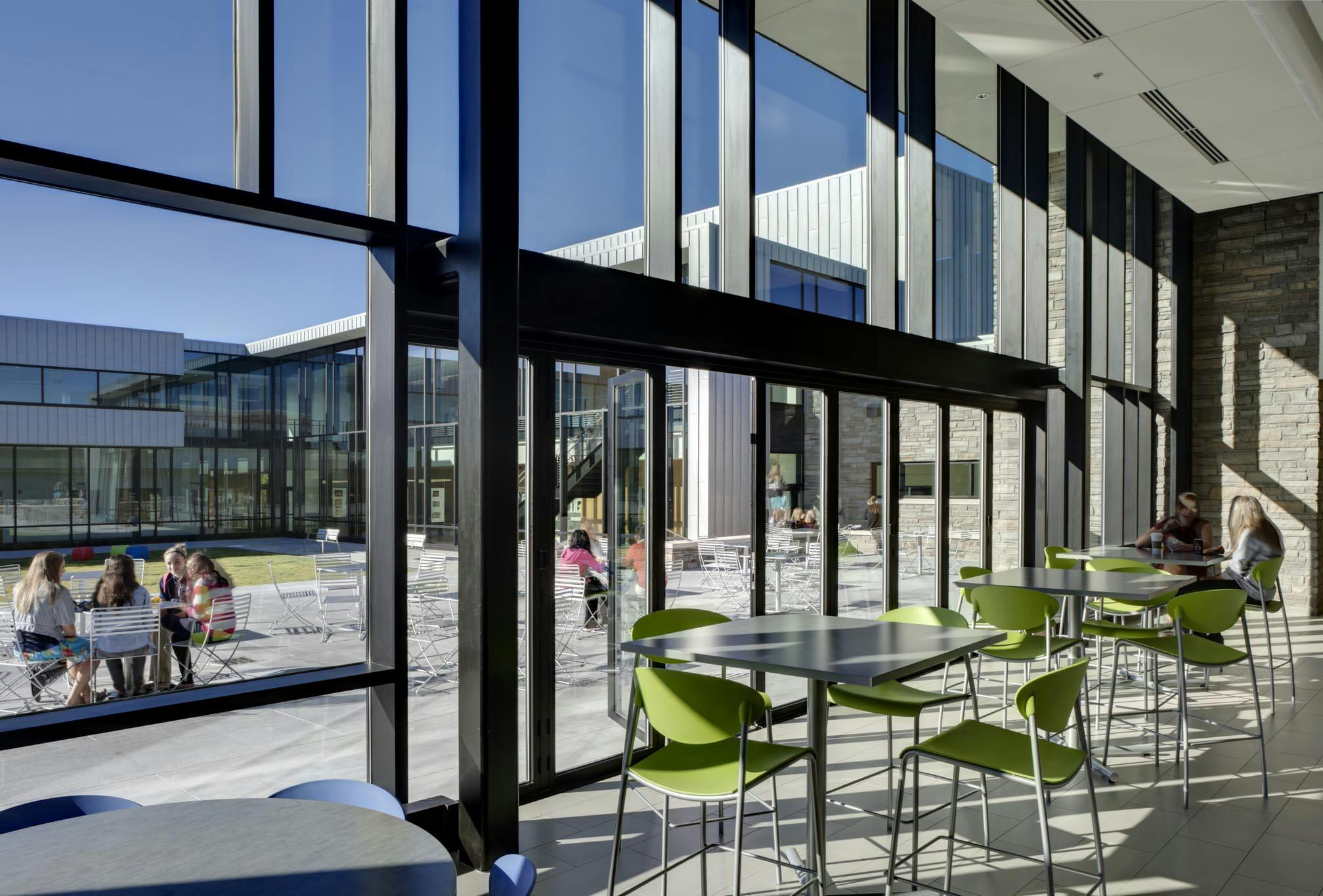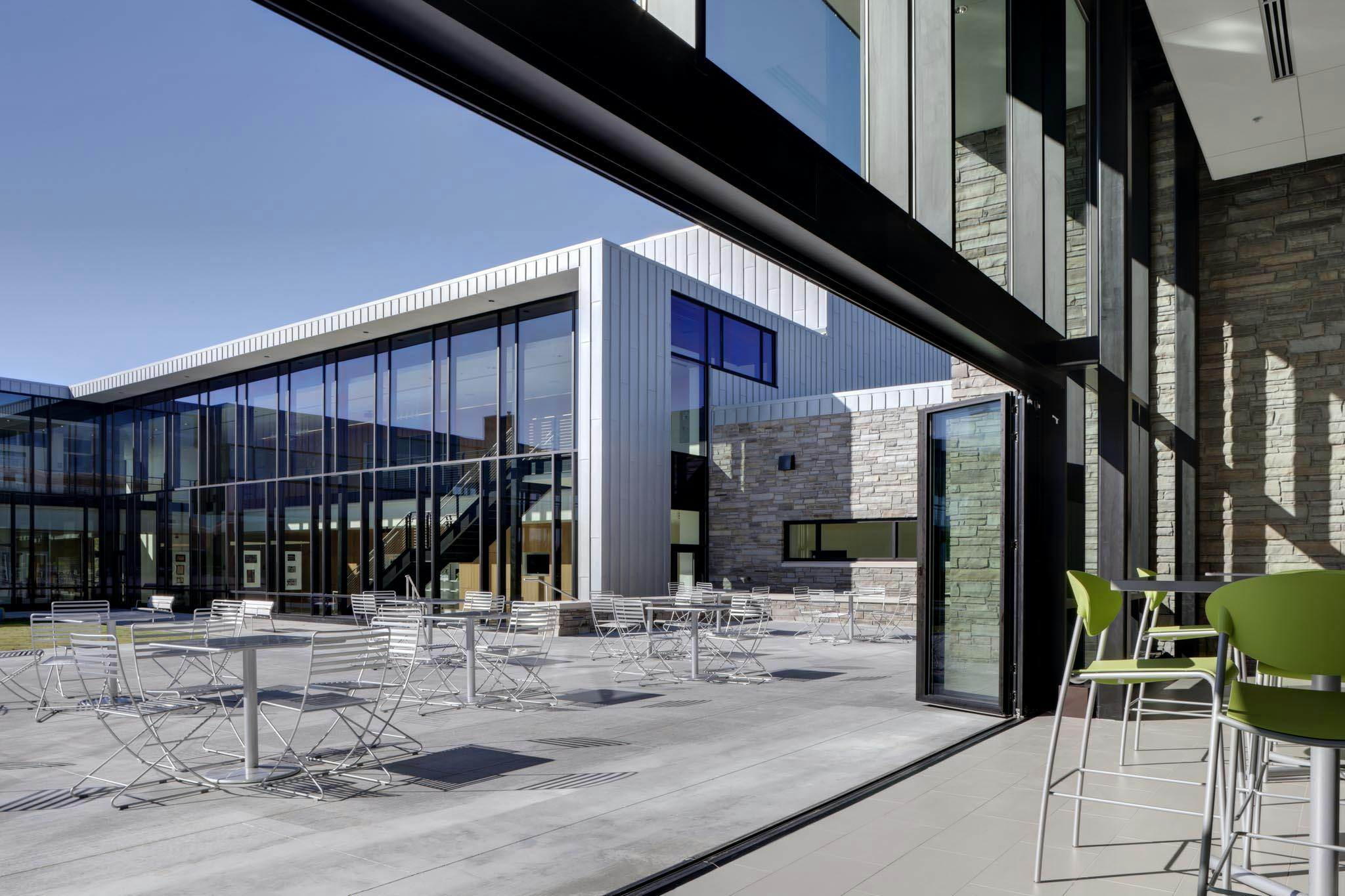 Although the school’s original vision included fixed metal and glass walls that would form two separate classrooms, the architect proposed a more dynamic design with acoustic glass wall systems to provide maximum flexibility of space.