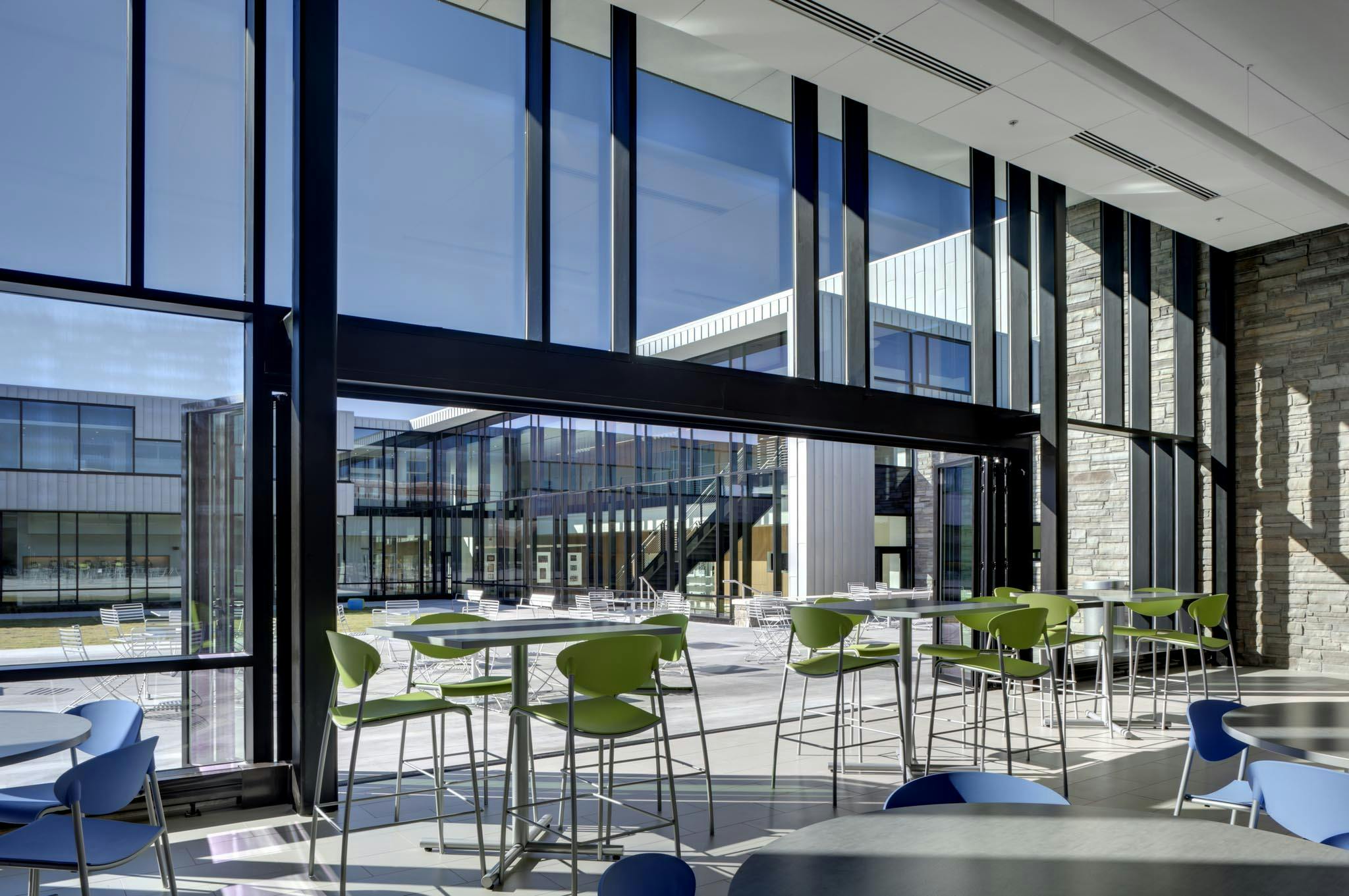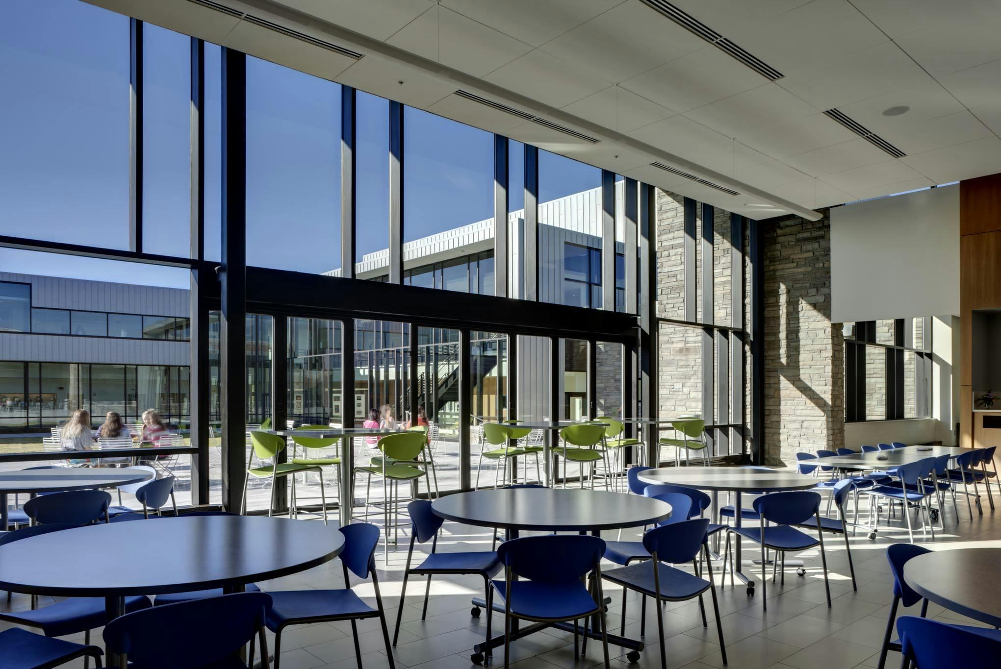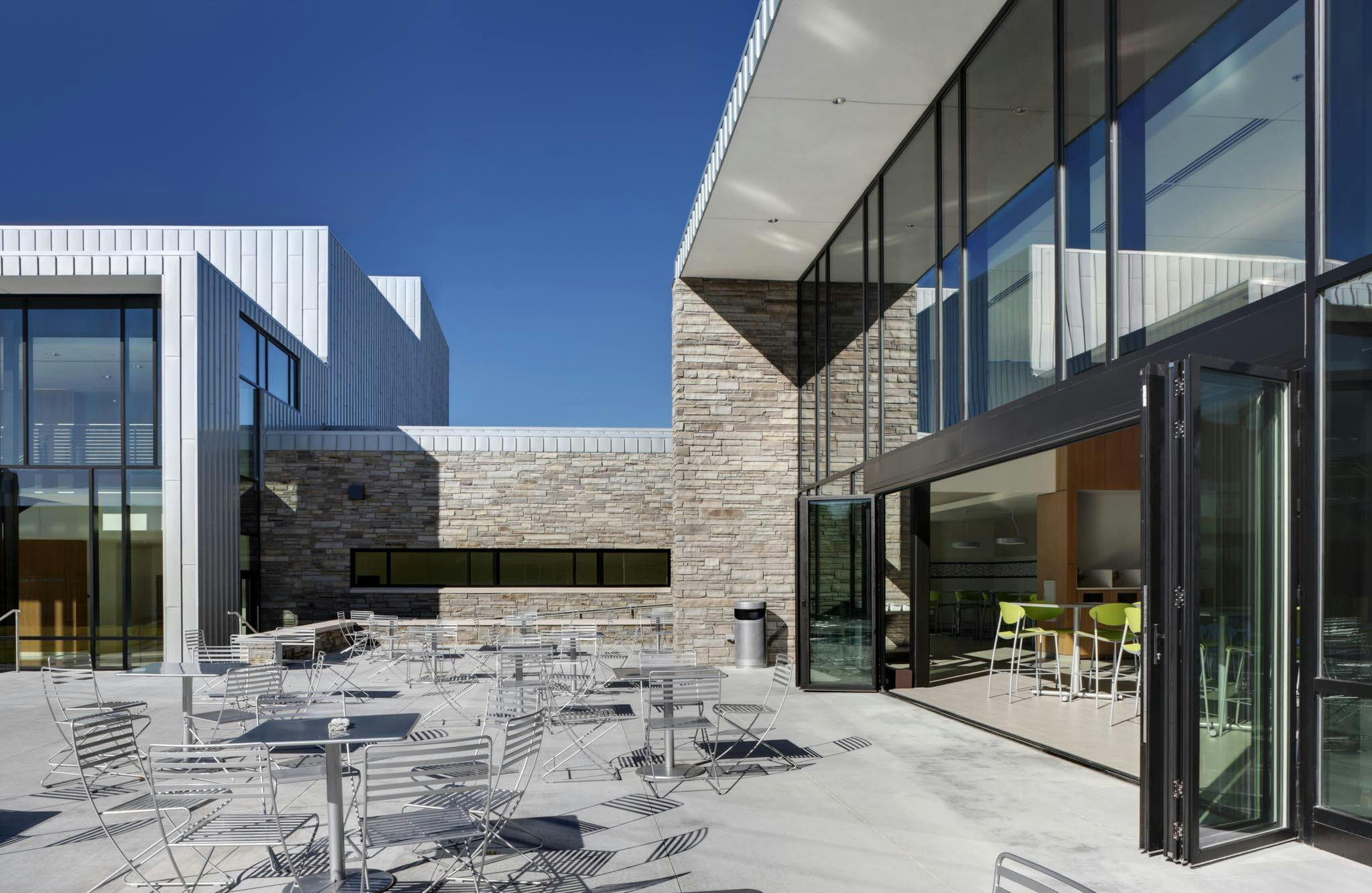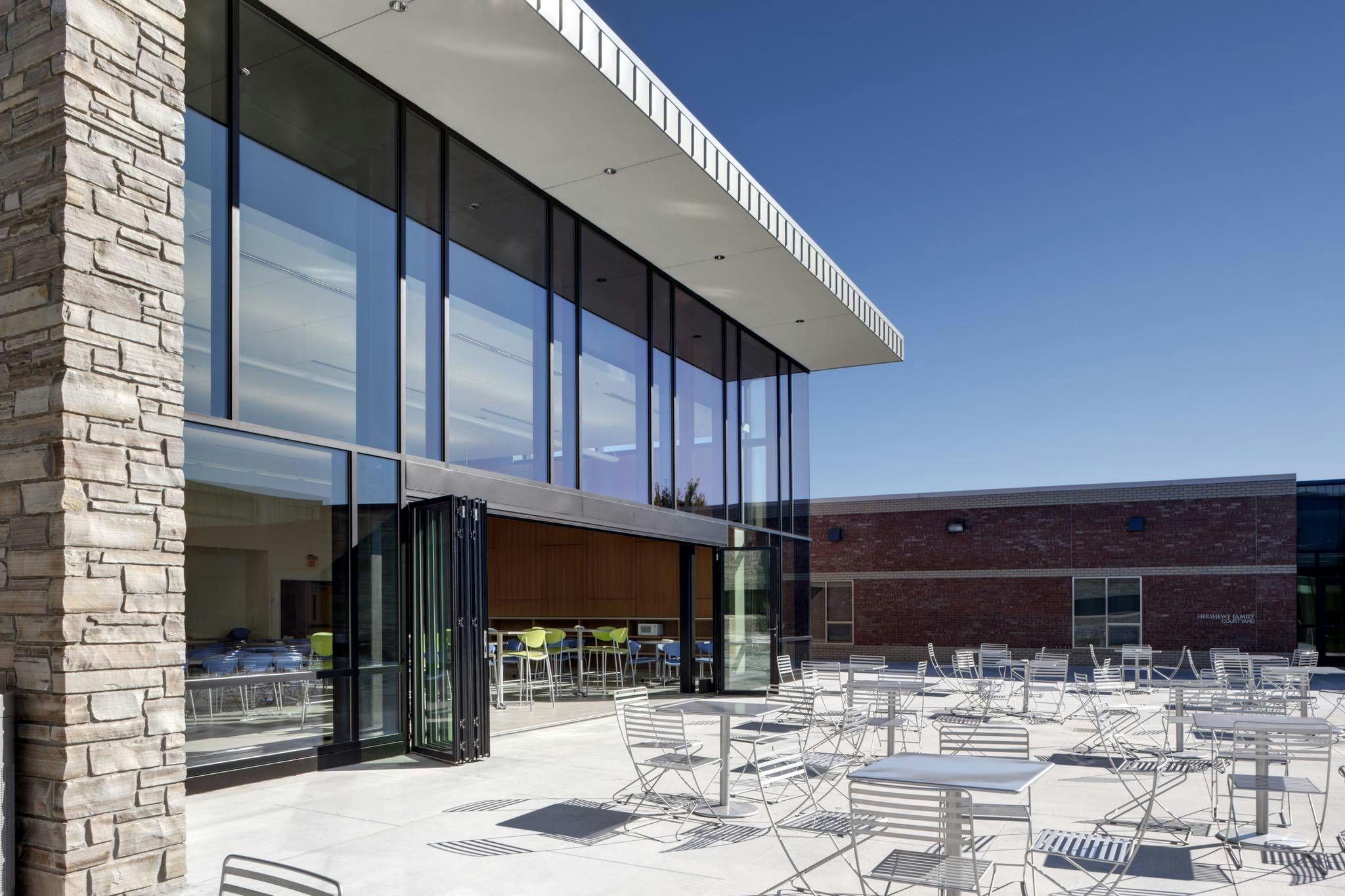 Although the school’s original vision included fixed metal and glass walls that would form two separate classrooms, the architect proposed a more dynamic design with acoustic glass wall systems to provide maximum flexibility of space.