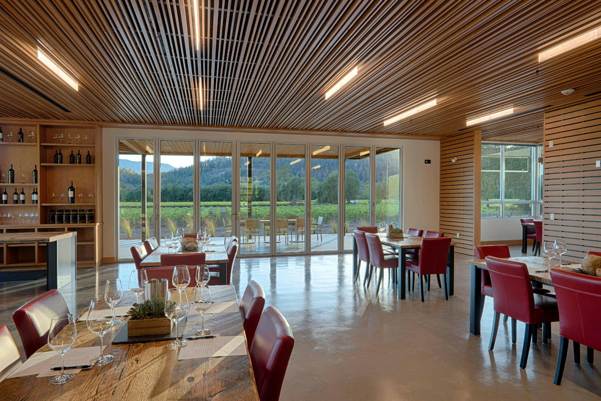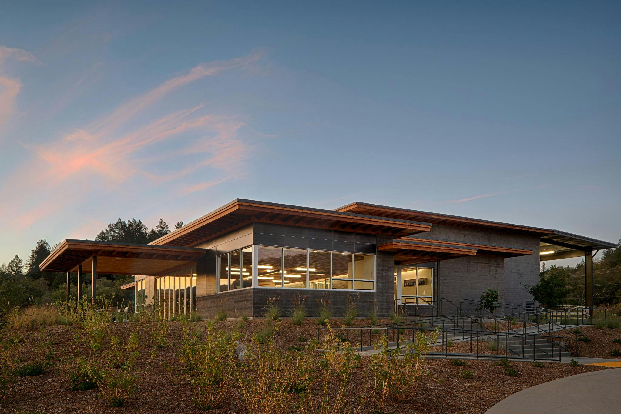 At Wellfield Botanic Gardens, Arkos Design created a biophilic visitor center where frameless bifold doors provide 180-degree garden views.