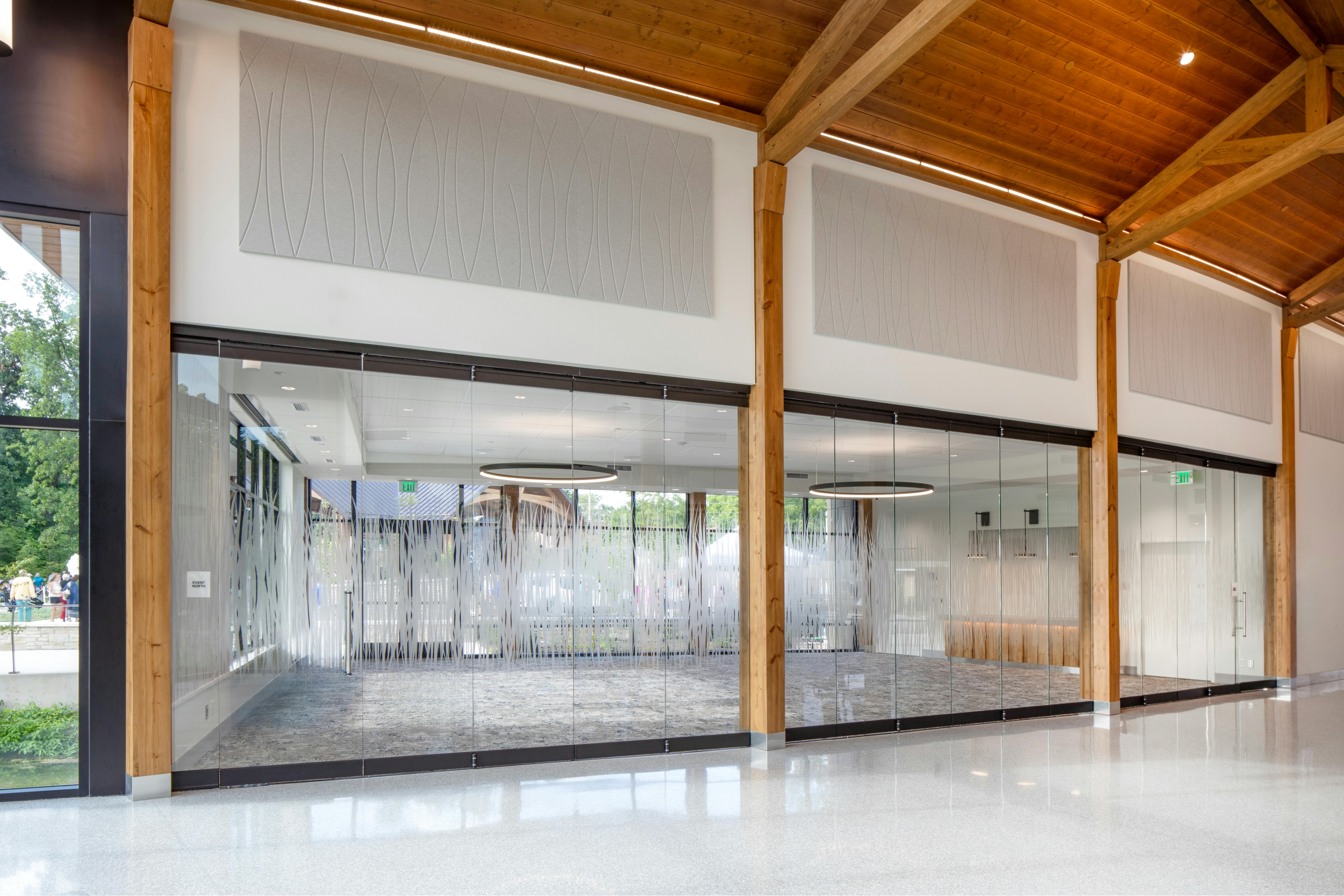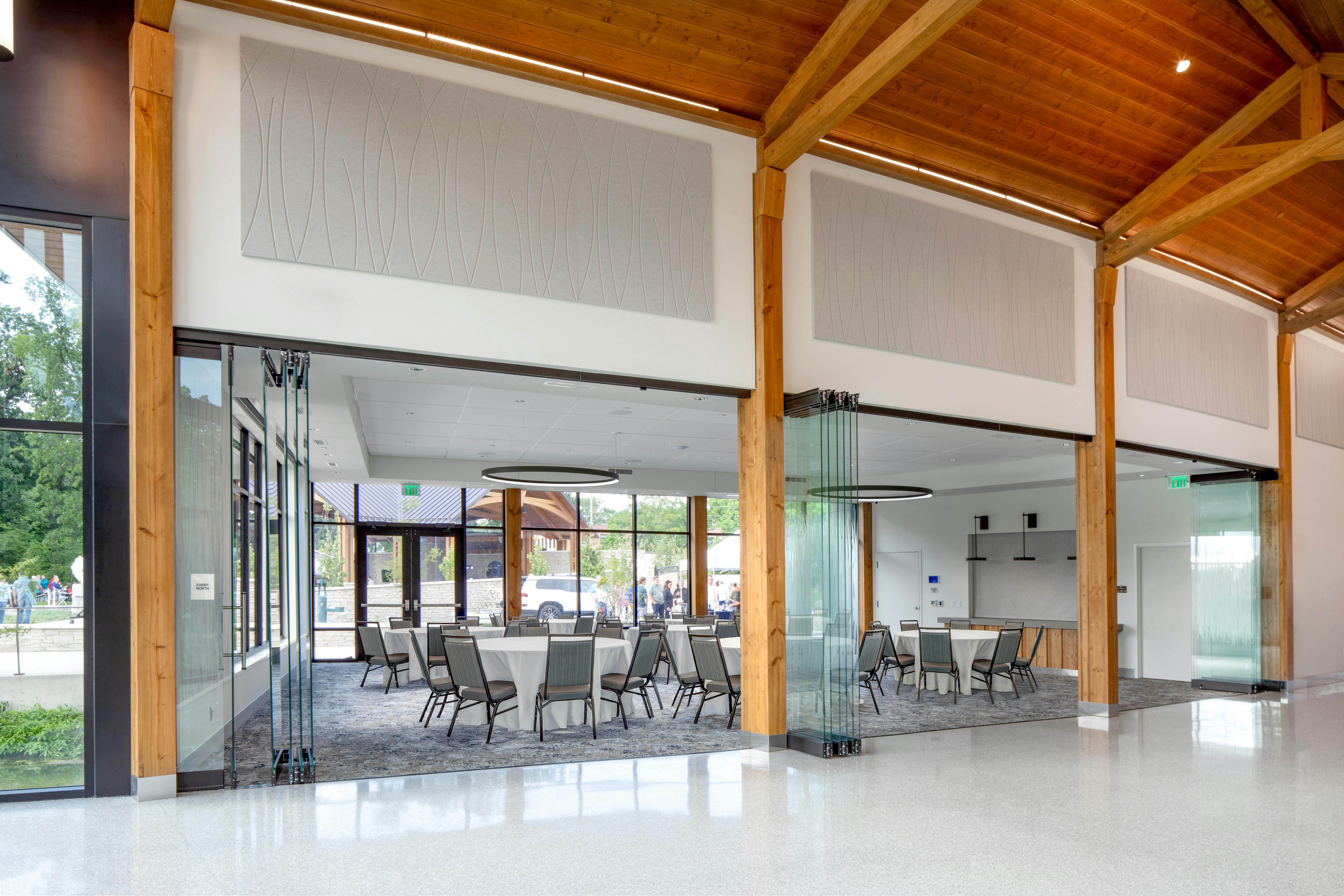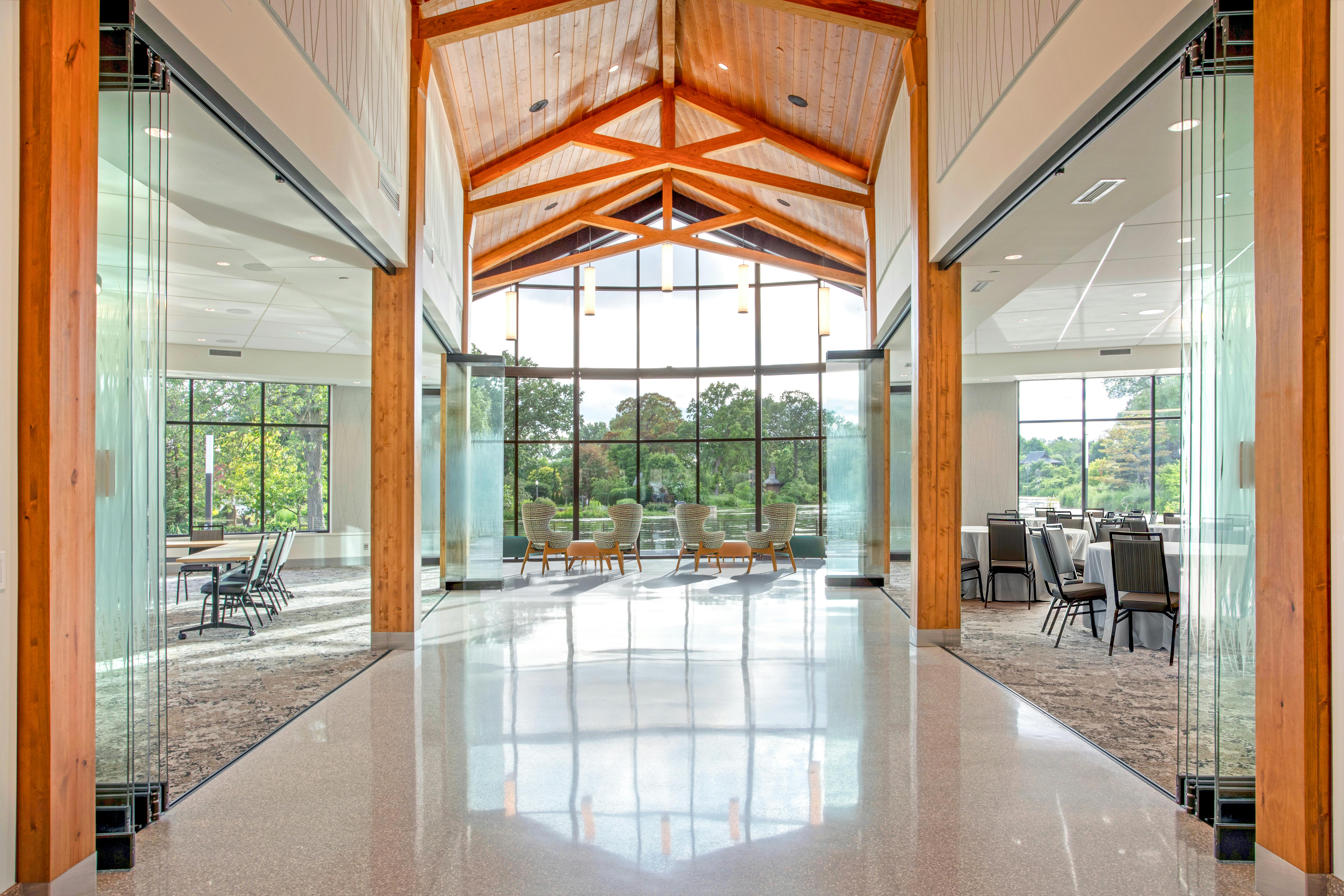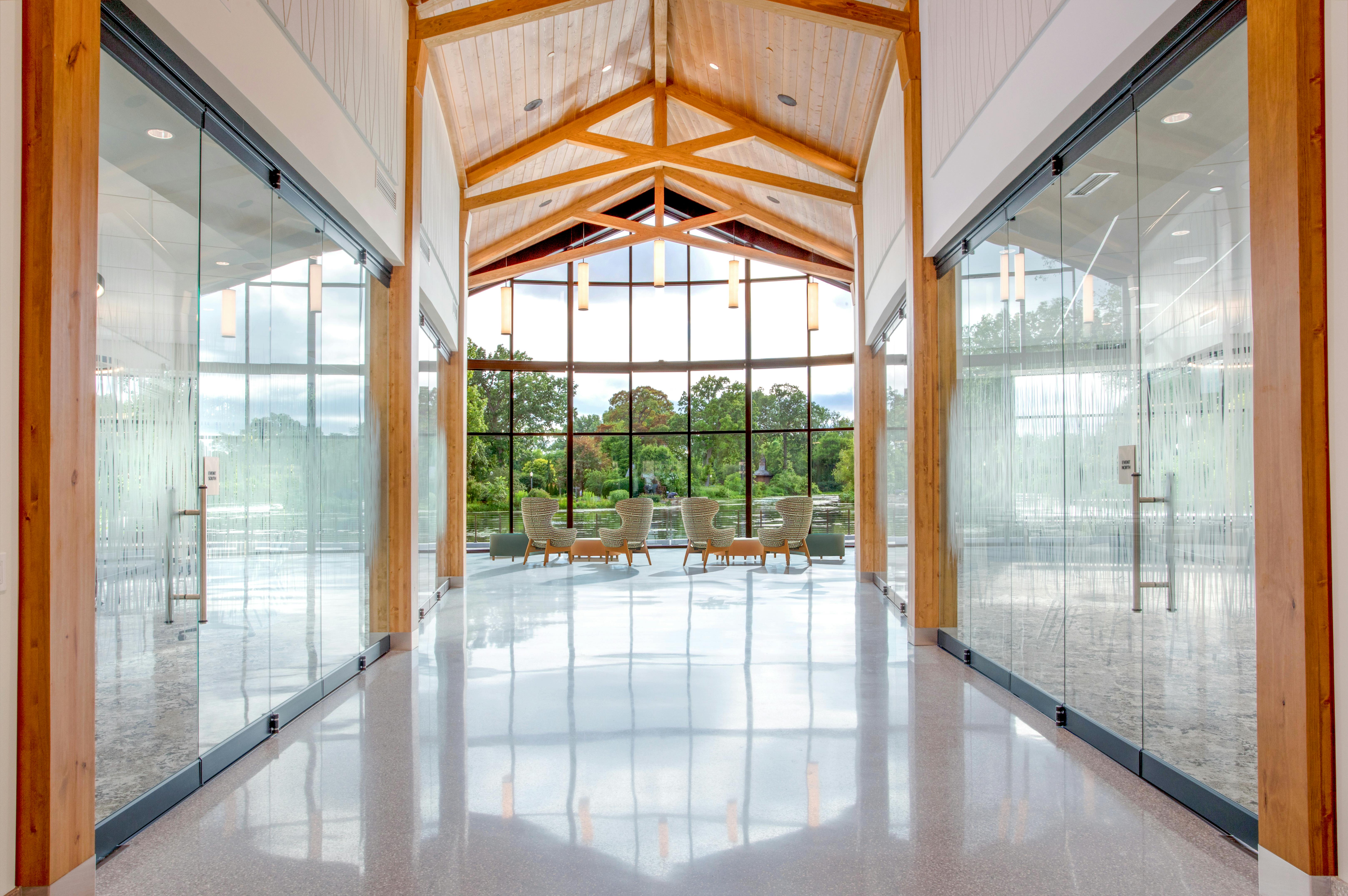 At Wellfield Botanic Gardens, Arkos Design created a biophilic visitor center where frameless bifold doors provide 180-degree garden views.