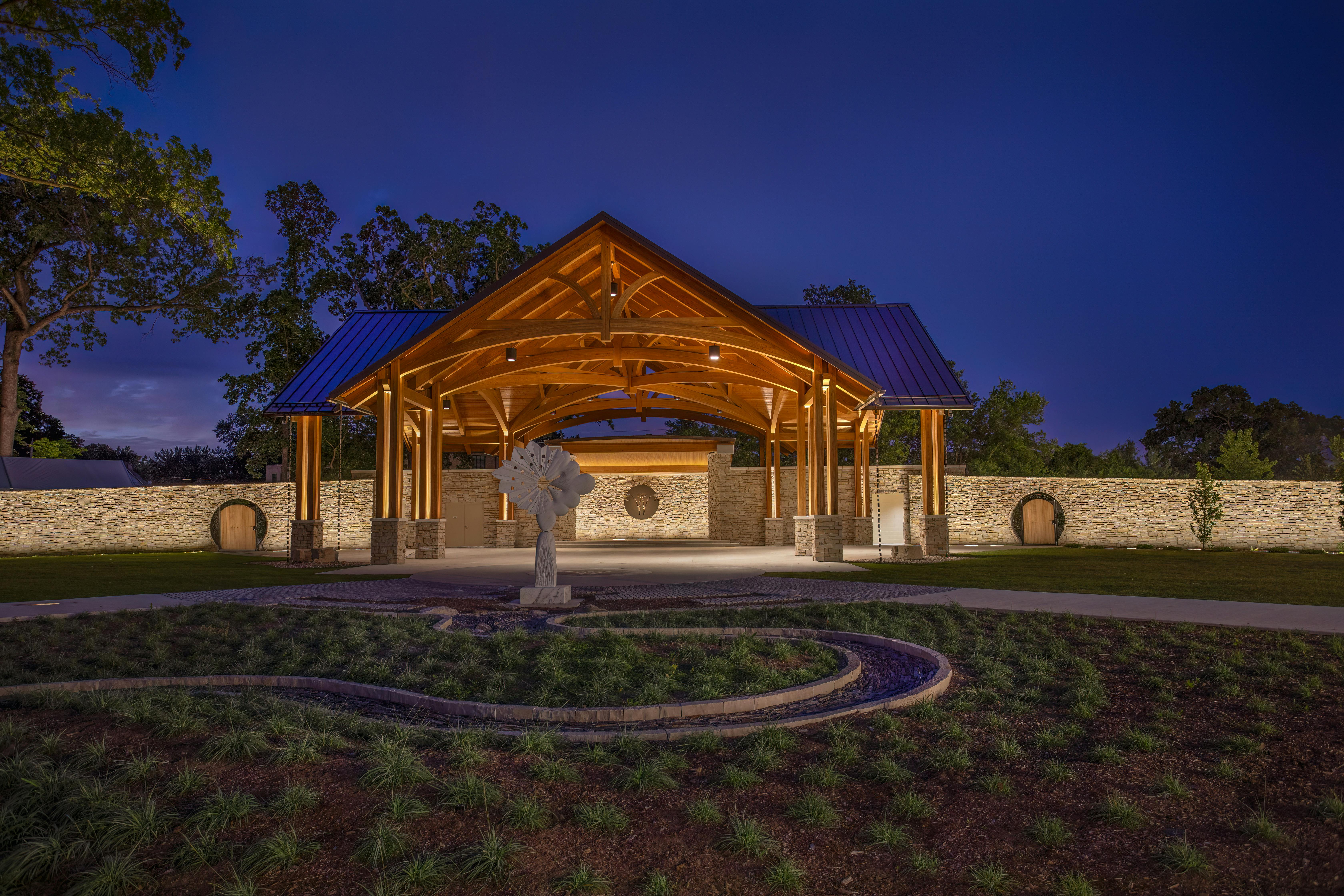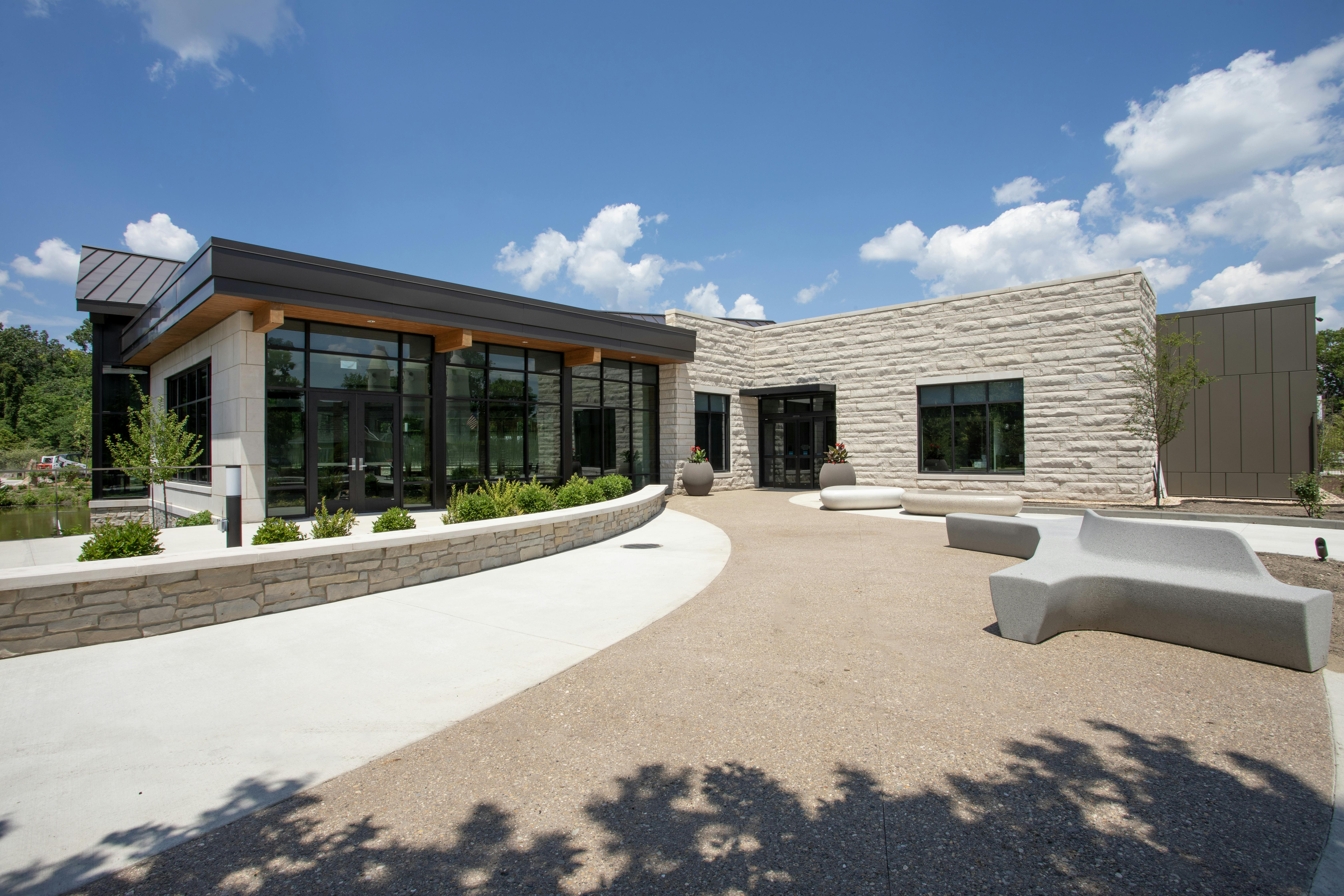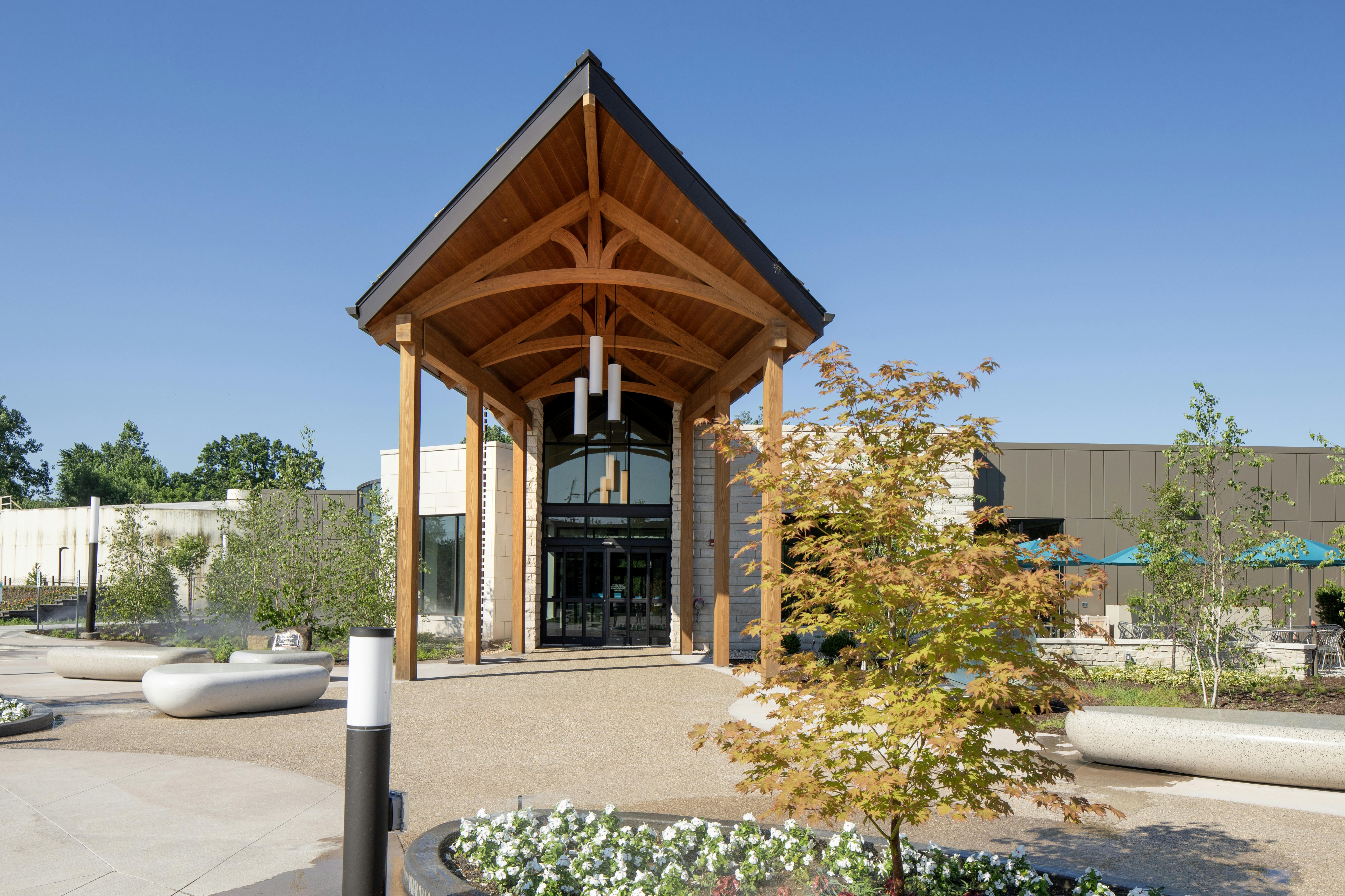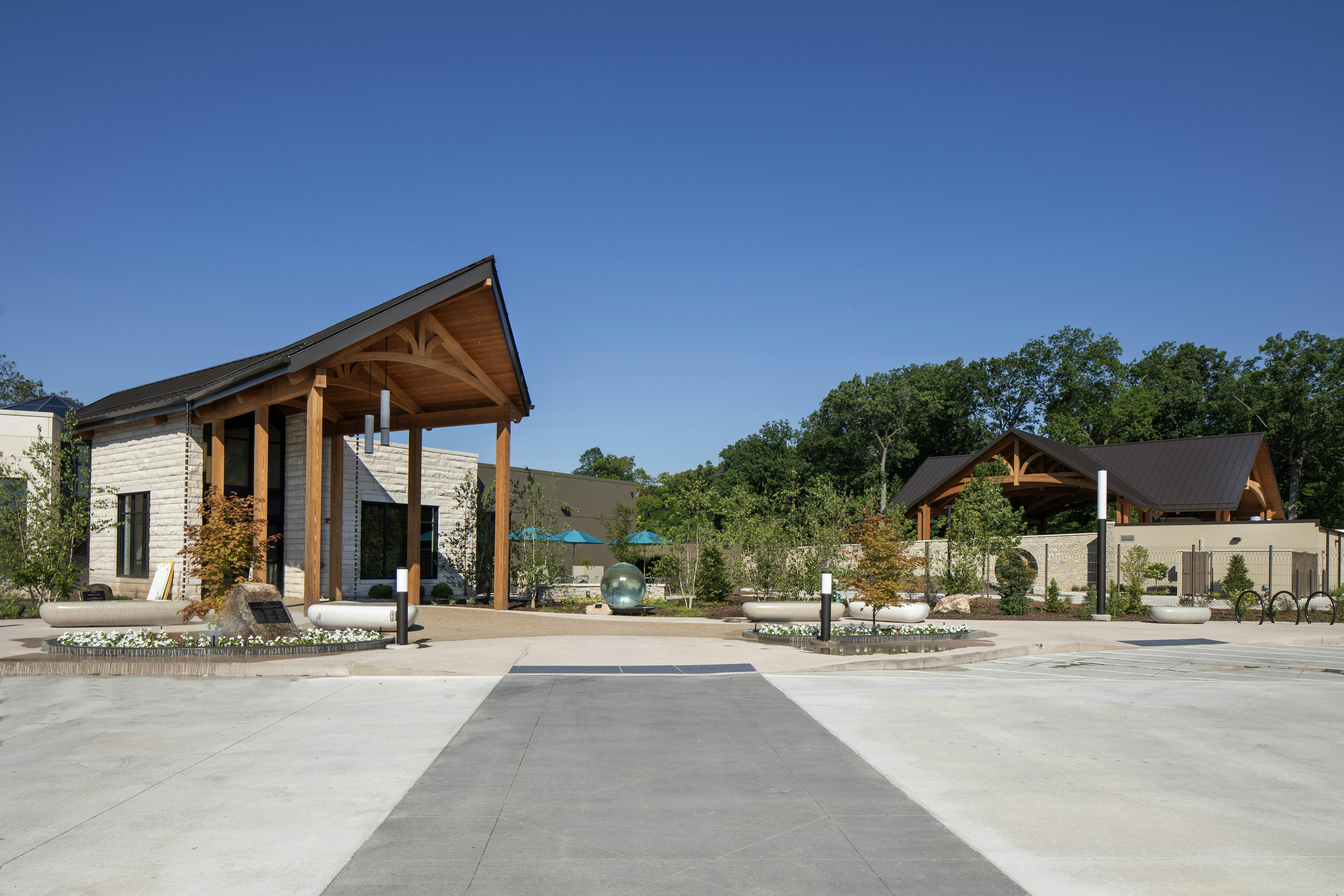 At Wellfield Botanic Gardens, Arkos Design created a biophilic visitor center where frameless bifold doors provide 180-degree garden views.