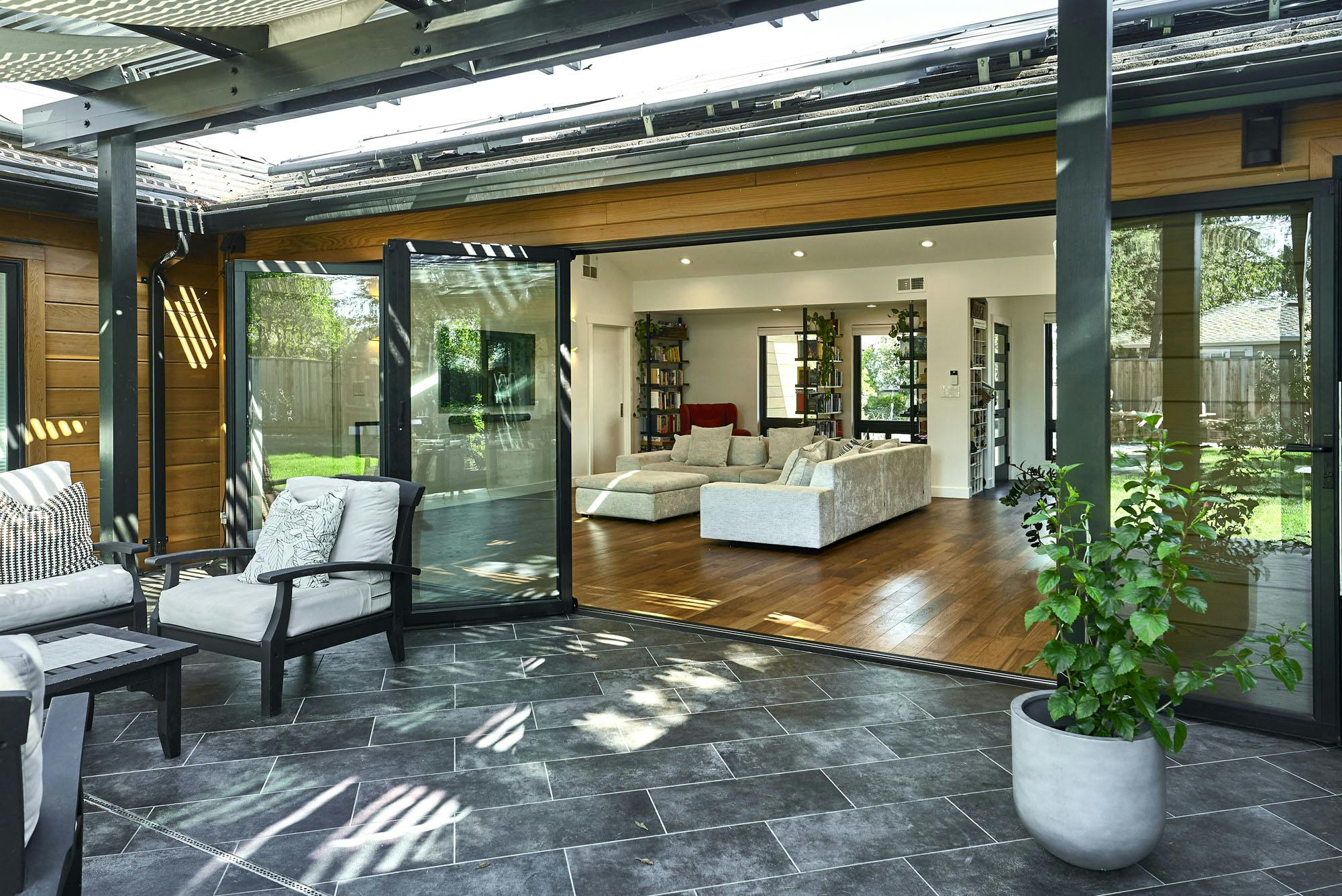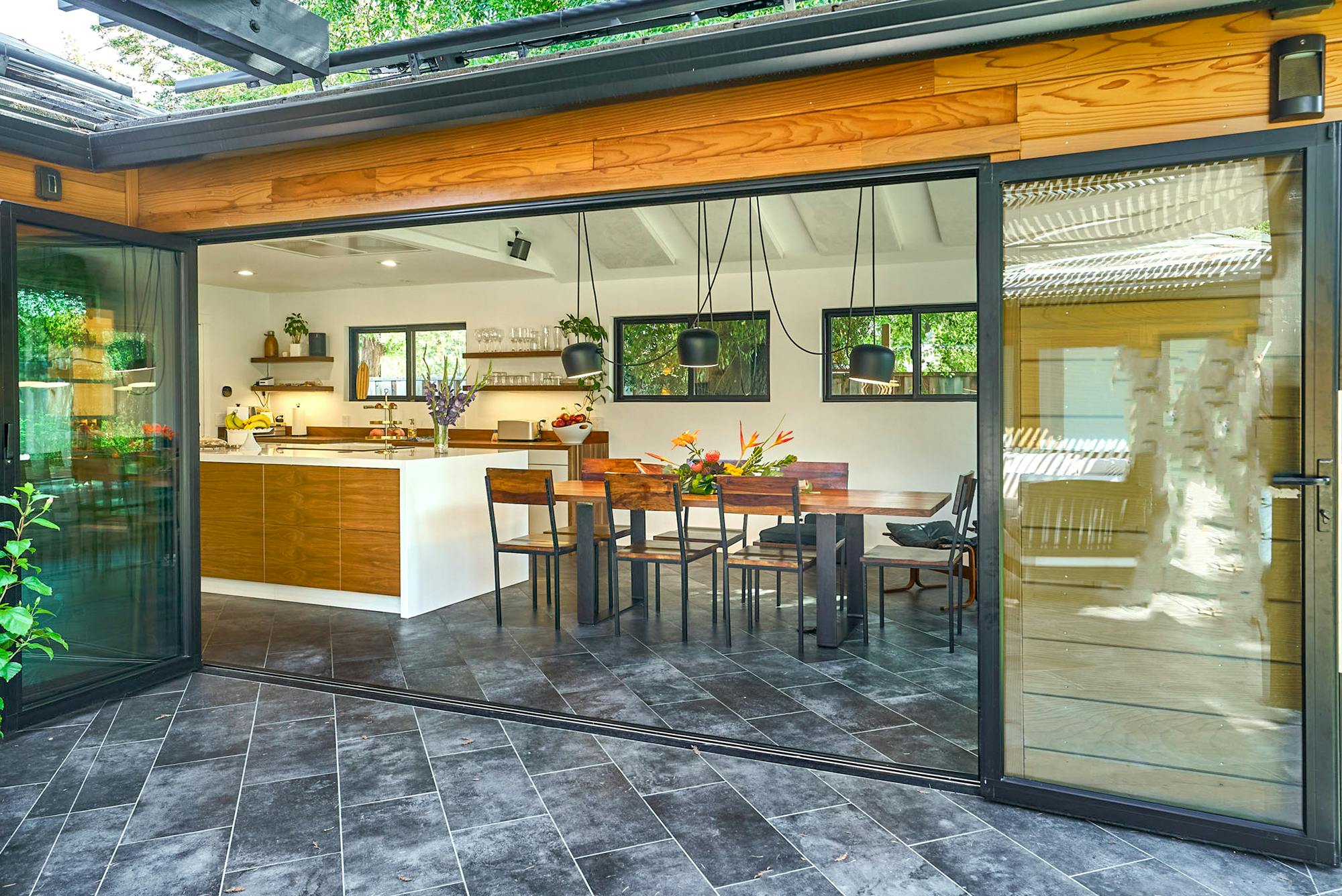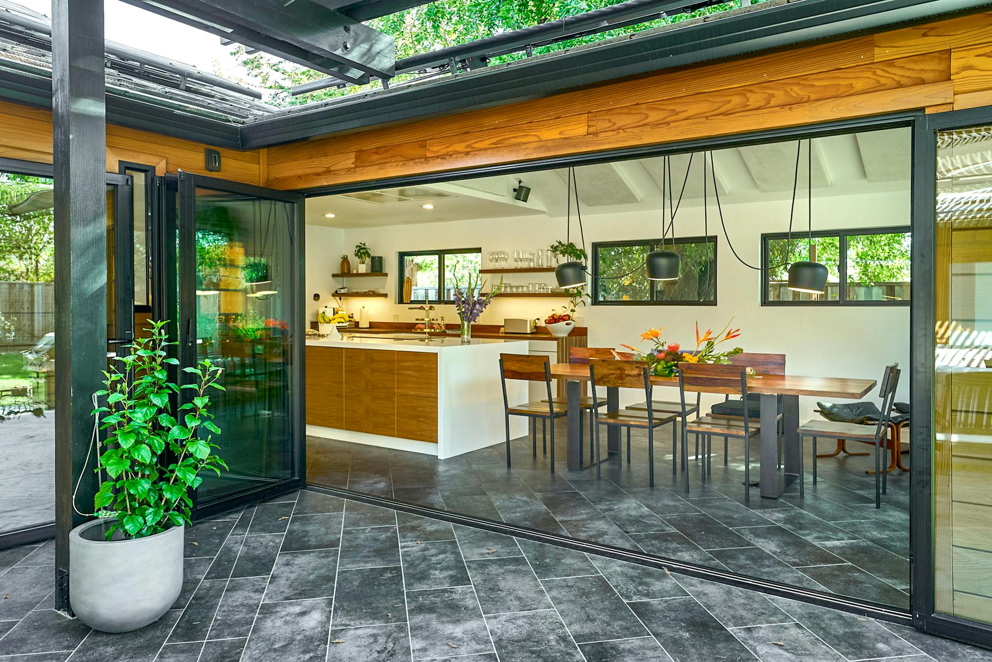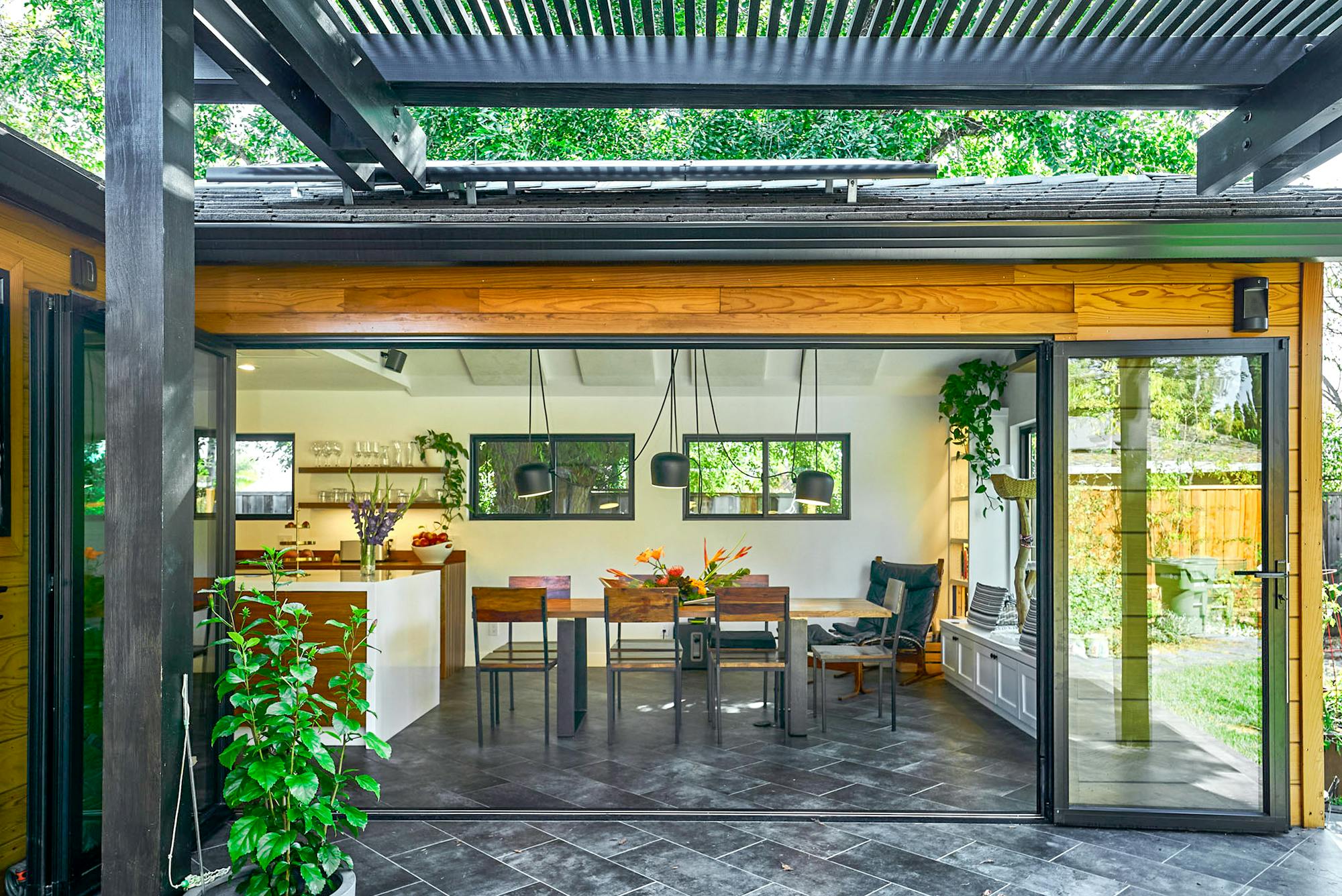 When the folding glass doors at this California home open, the outdoor living space effortlessly becomes an extension of the home. Designed by Brad Cox Architect, the opening also enhanced the mood and comfort of the dining room and kitchen.