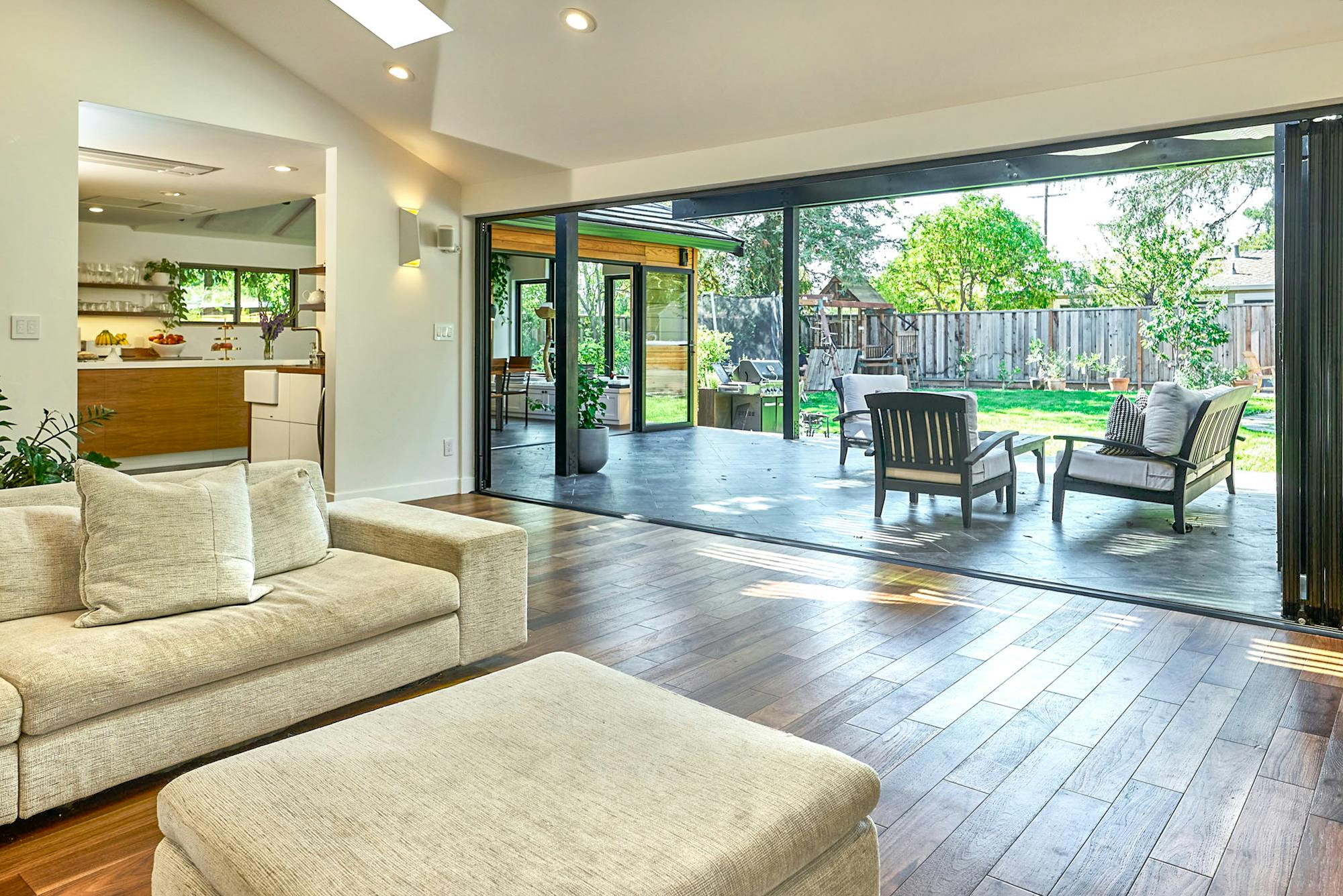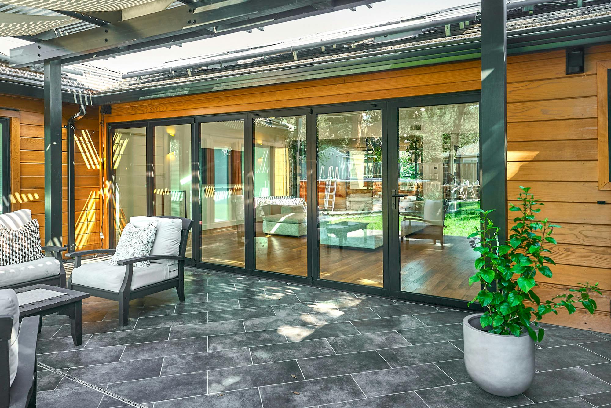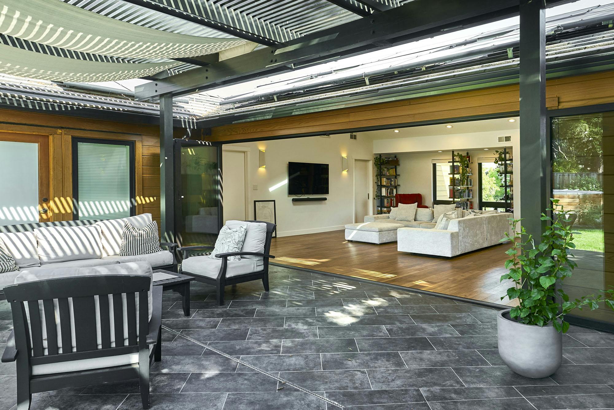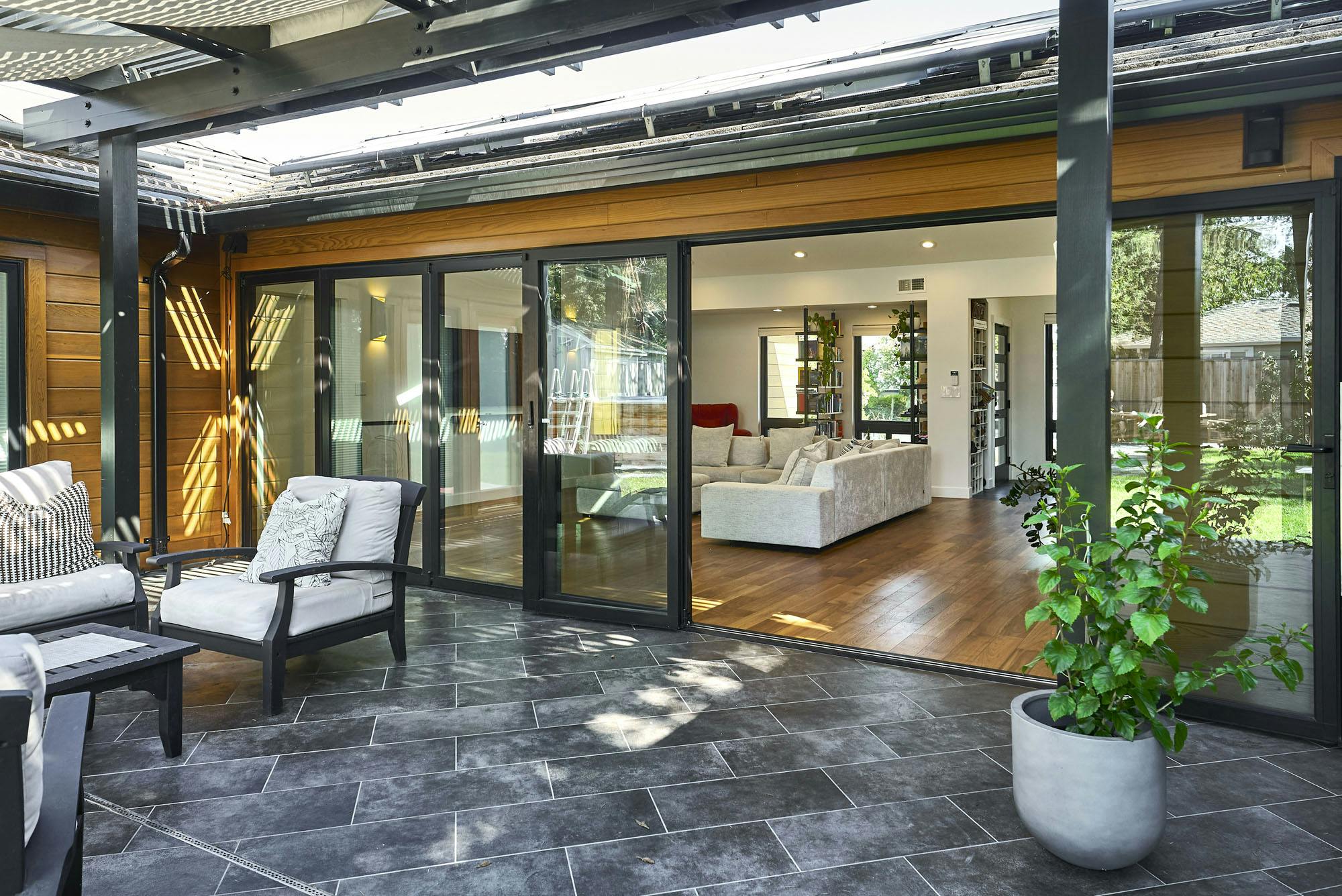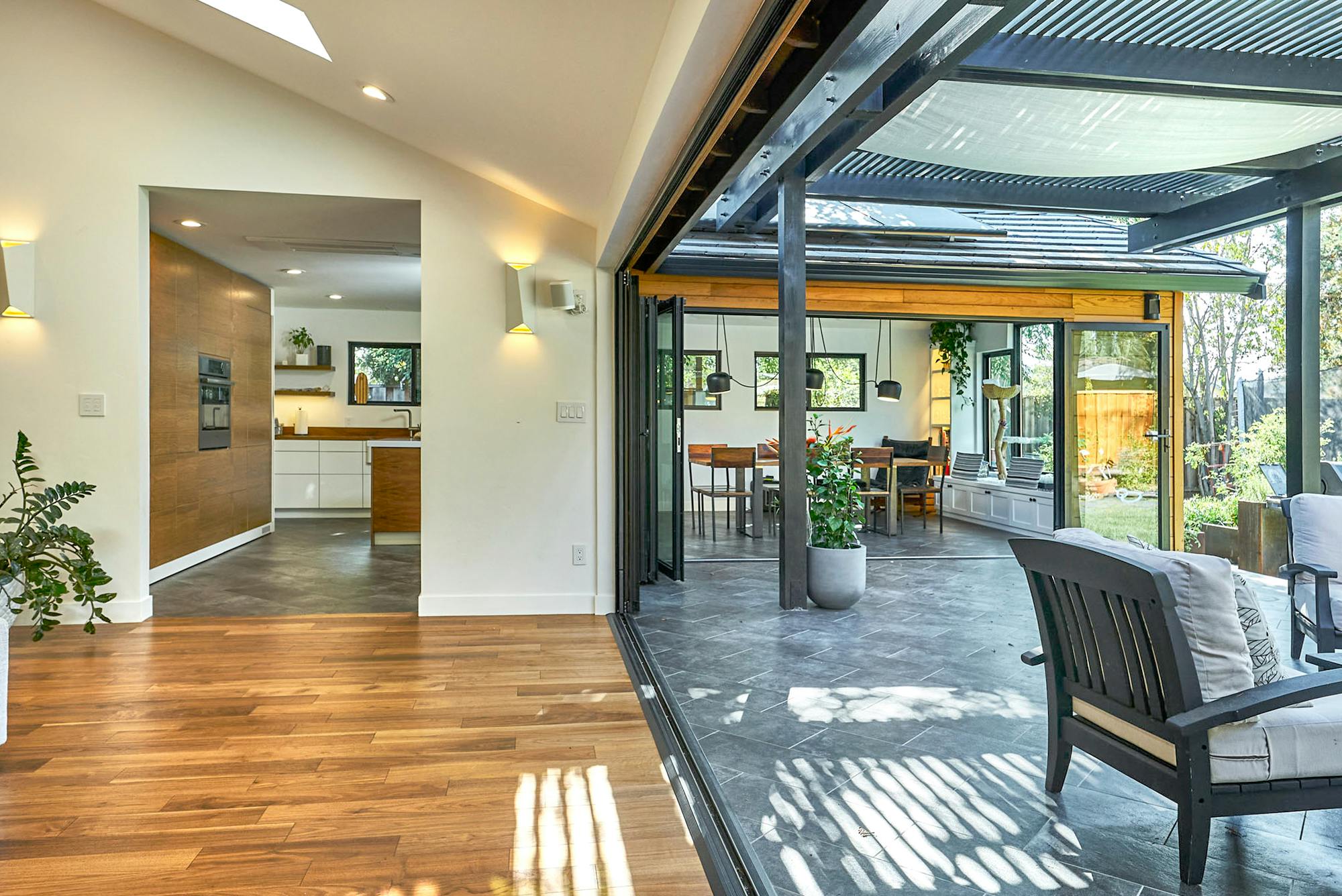 When the folding glass doors at this California home open, the outdoor living space effortlessly becomes an extension of the home. Designed by Brad Cox Architect, the opening also enhanced the mood and comfort of the dining room and kitchen.