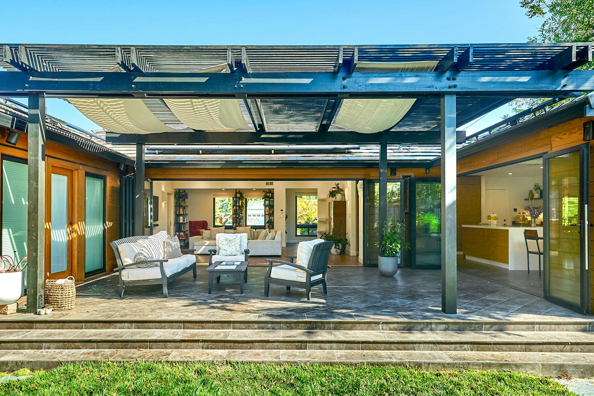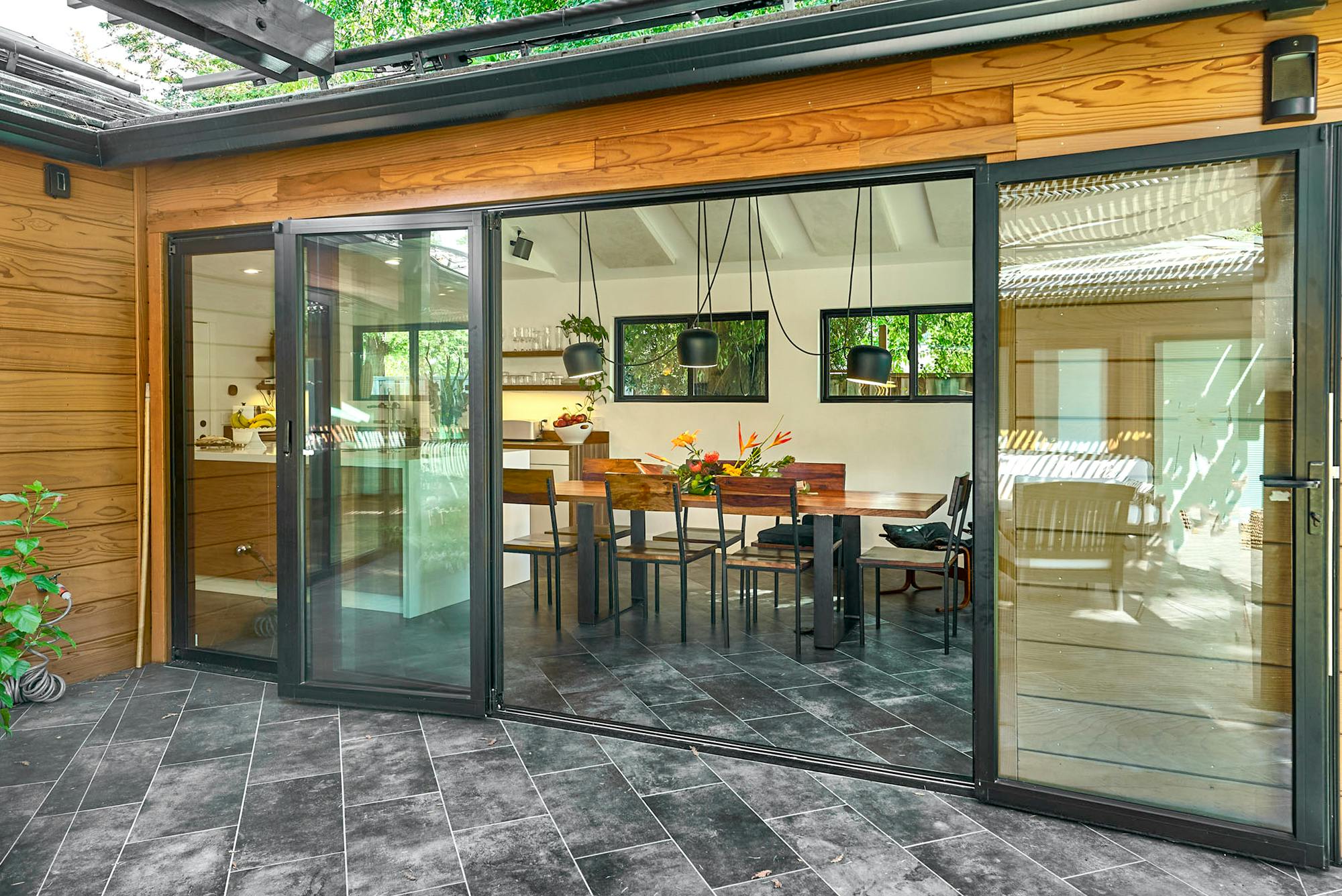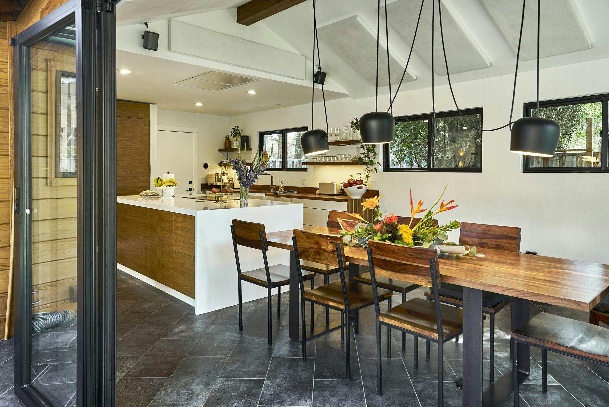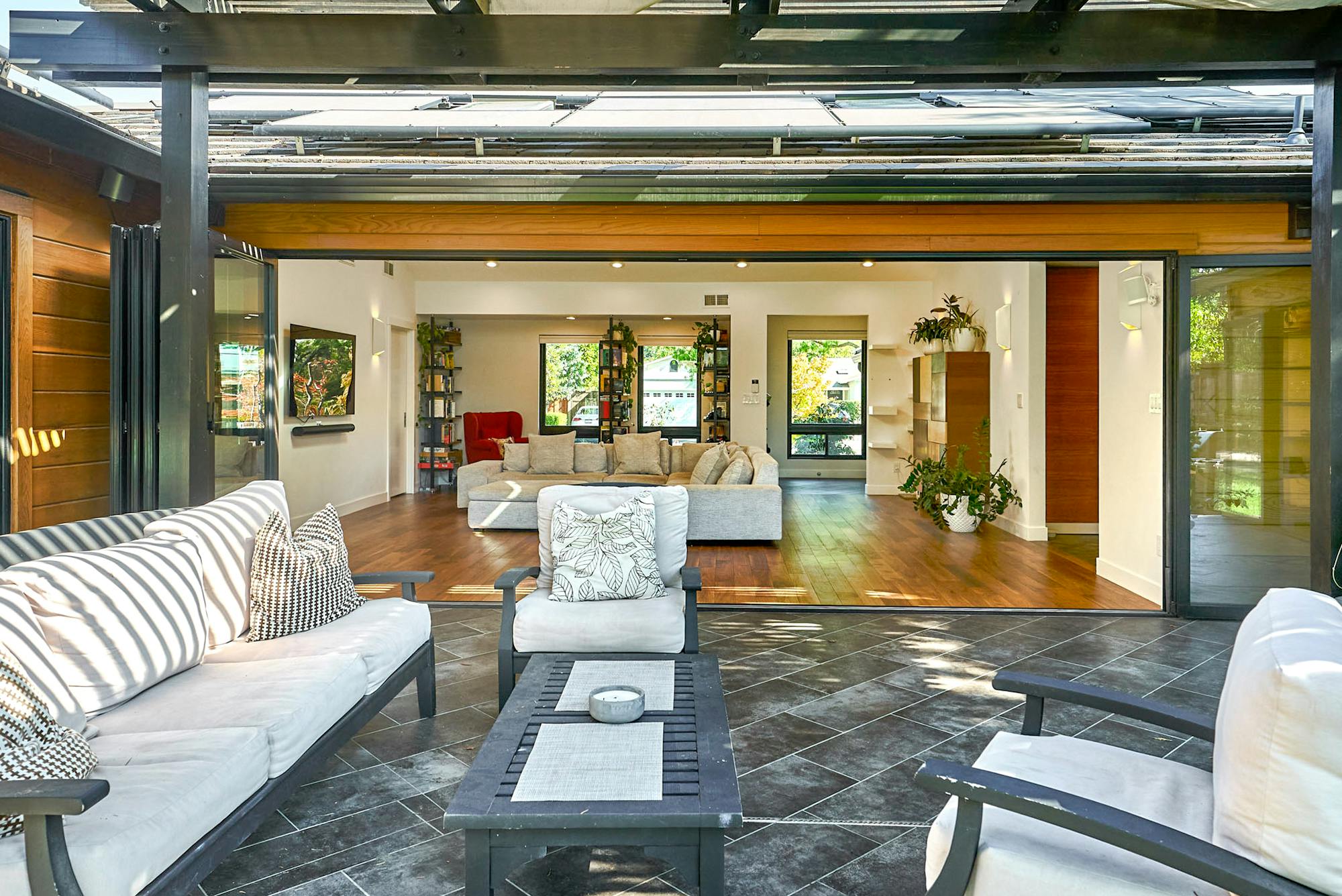 When the folding glass doors at this California home open, the outdoor living space effortlessly becomes an extension of the home. Designed by Brad Cox Architect, the opening also enhanced the mood and comfort of the dining room and kitchen.
