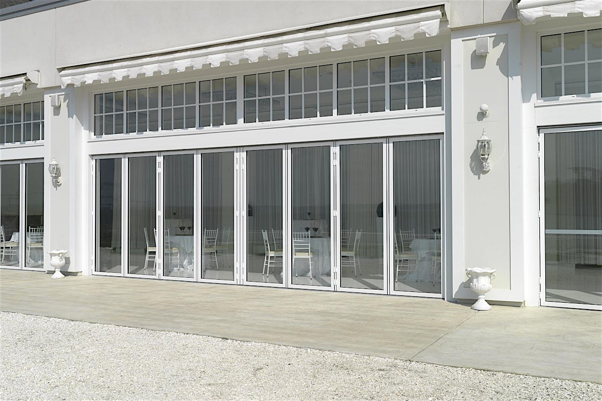 When fully open, the 31 sliding panels disappear into NanaWall's proprietary parking bays, eradicating the division between indoors and out. When closed, the view of the golf course and surrounding hills remains panoramic and nearly unobstructed. The system incorporated a custom glazing requested by the owners, attenuating noise levels and providing a buffer between scheduled gatherings and casual patrons.