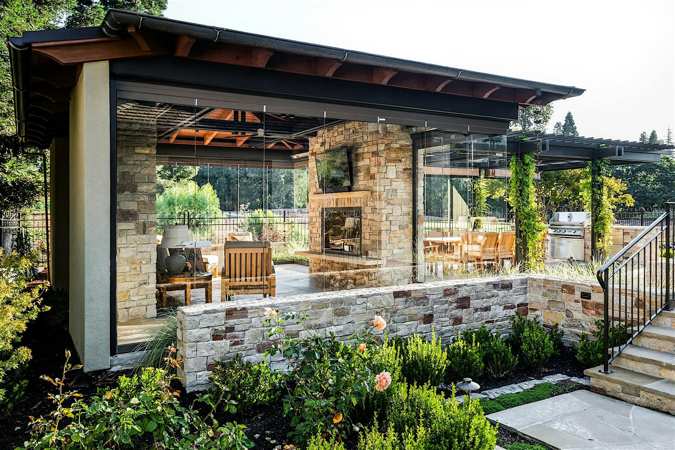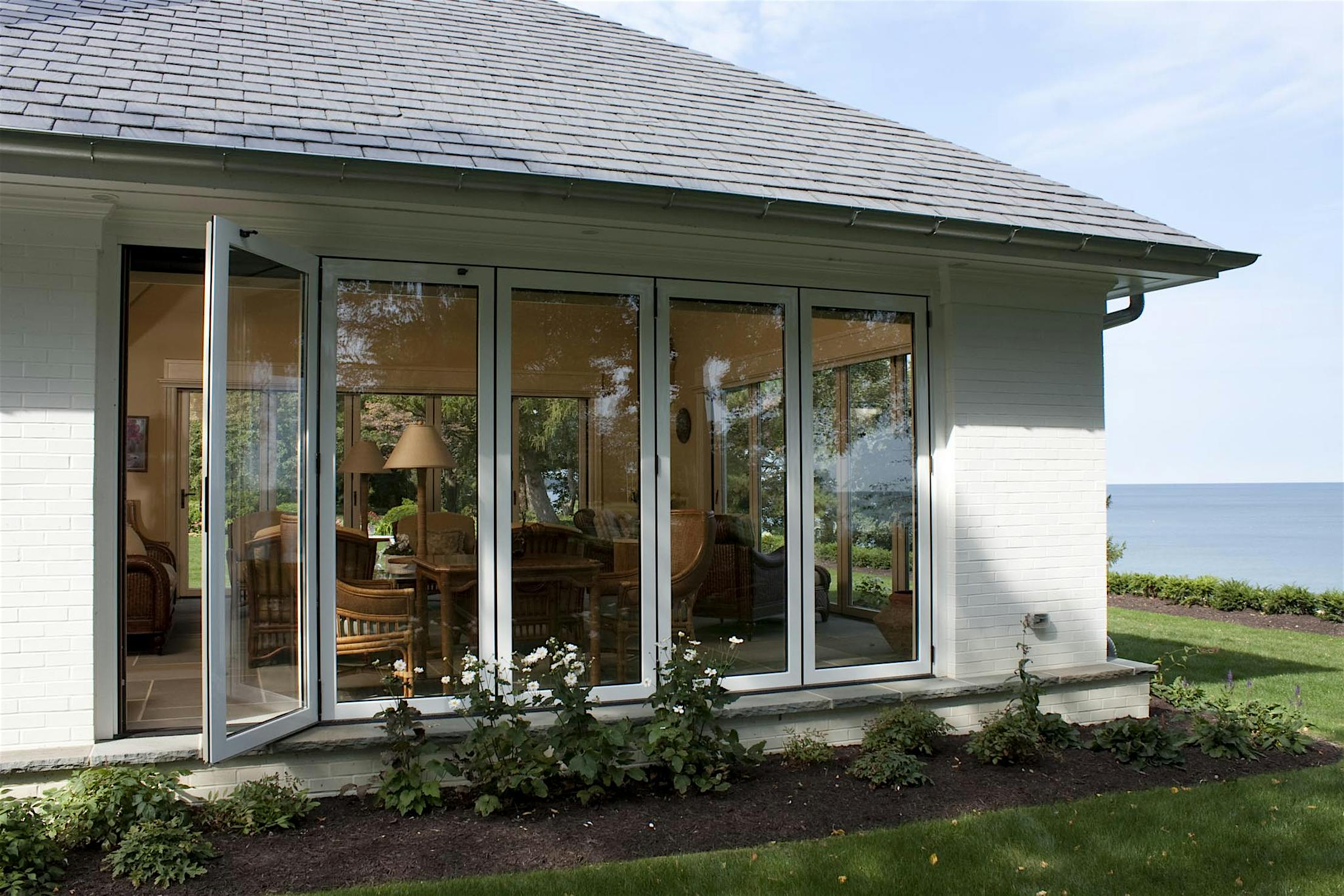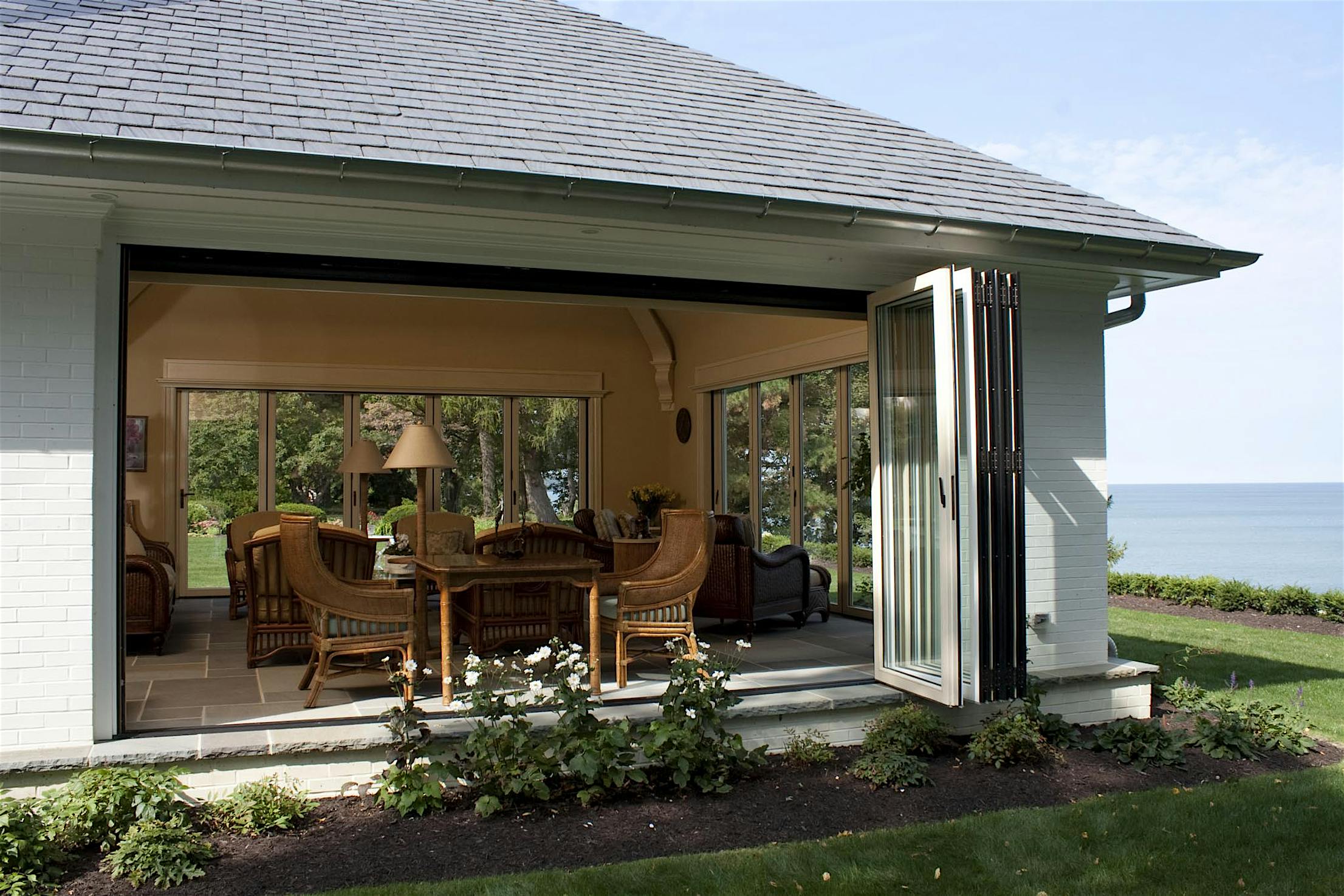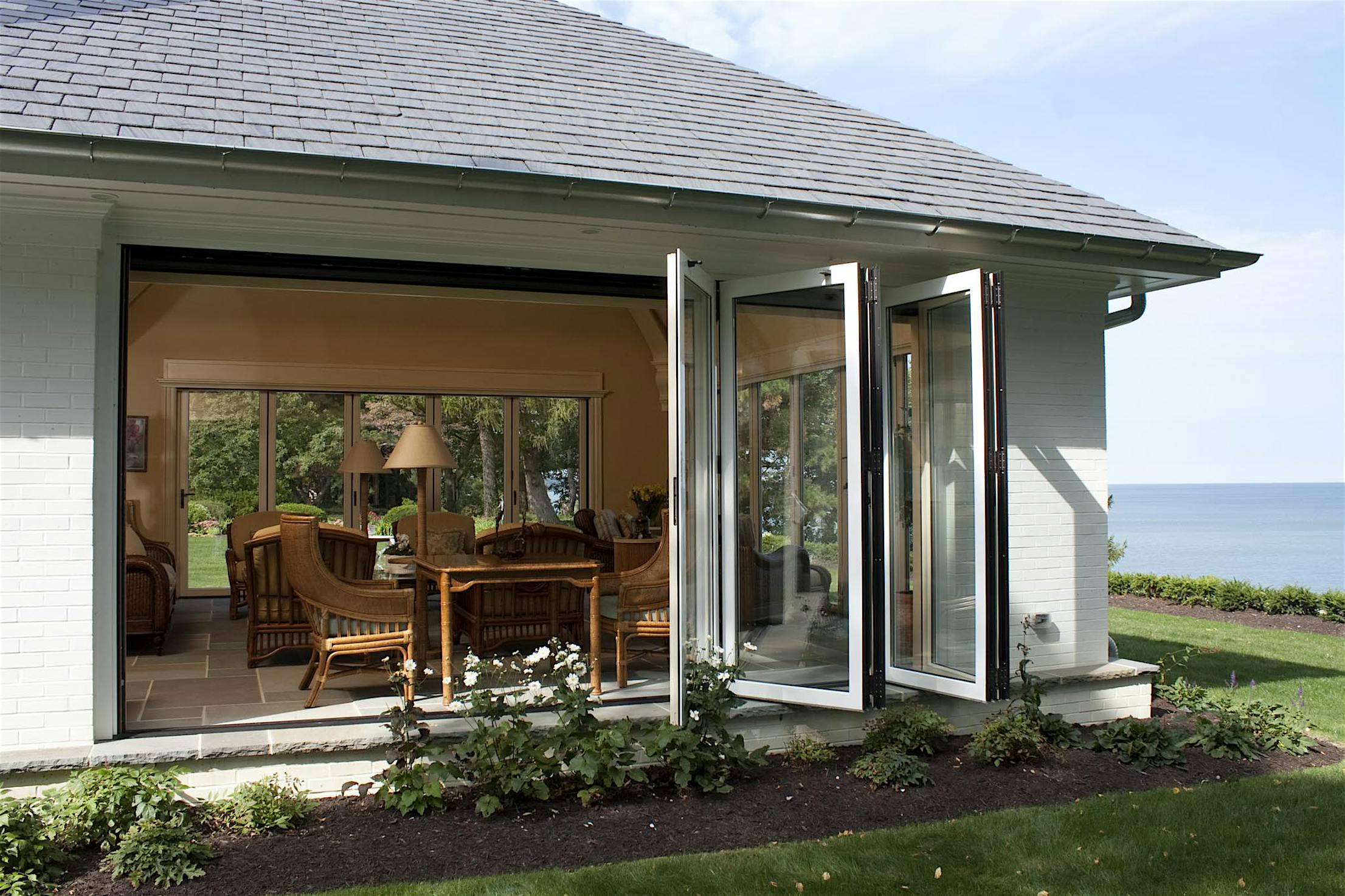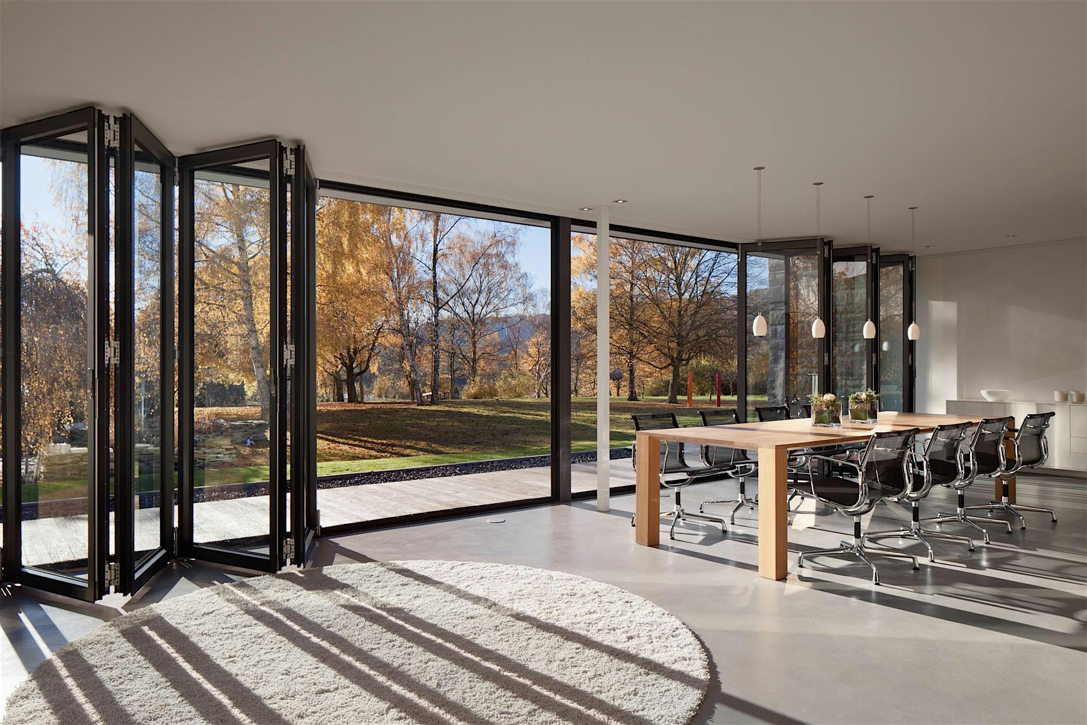 Each panel of the glass wall system is connected together along a single track and folds unto itself to create wide, unobstructed openings.