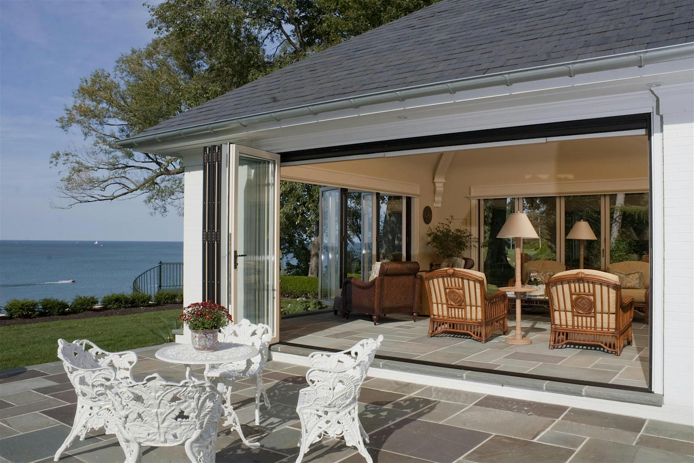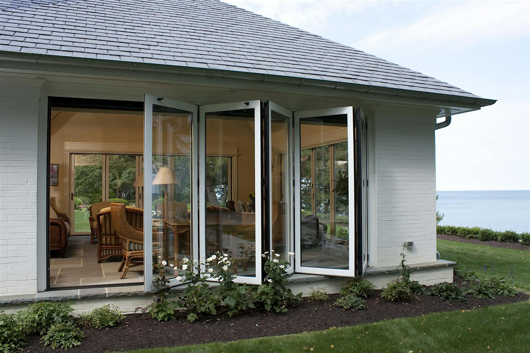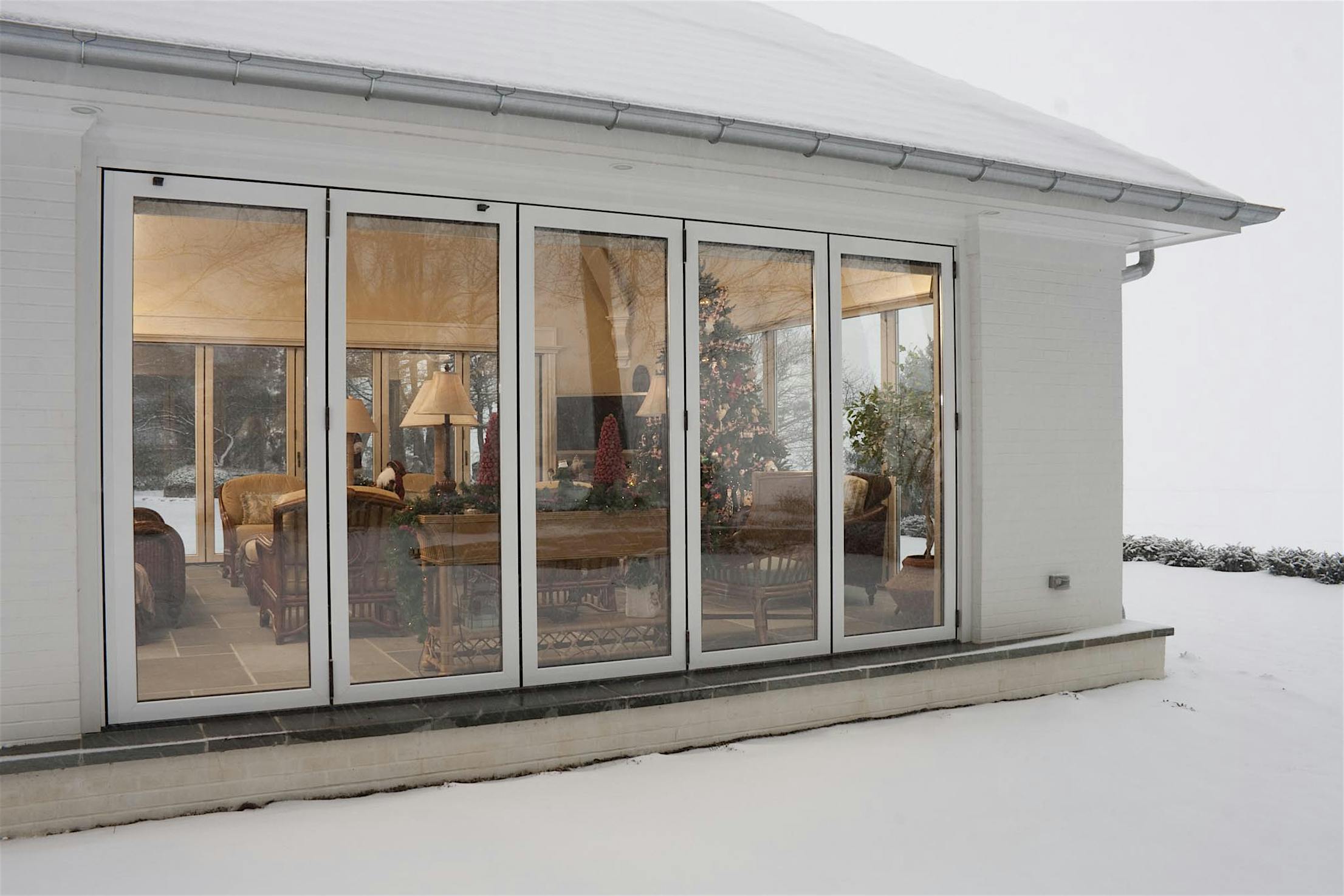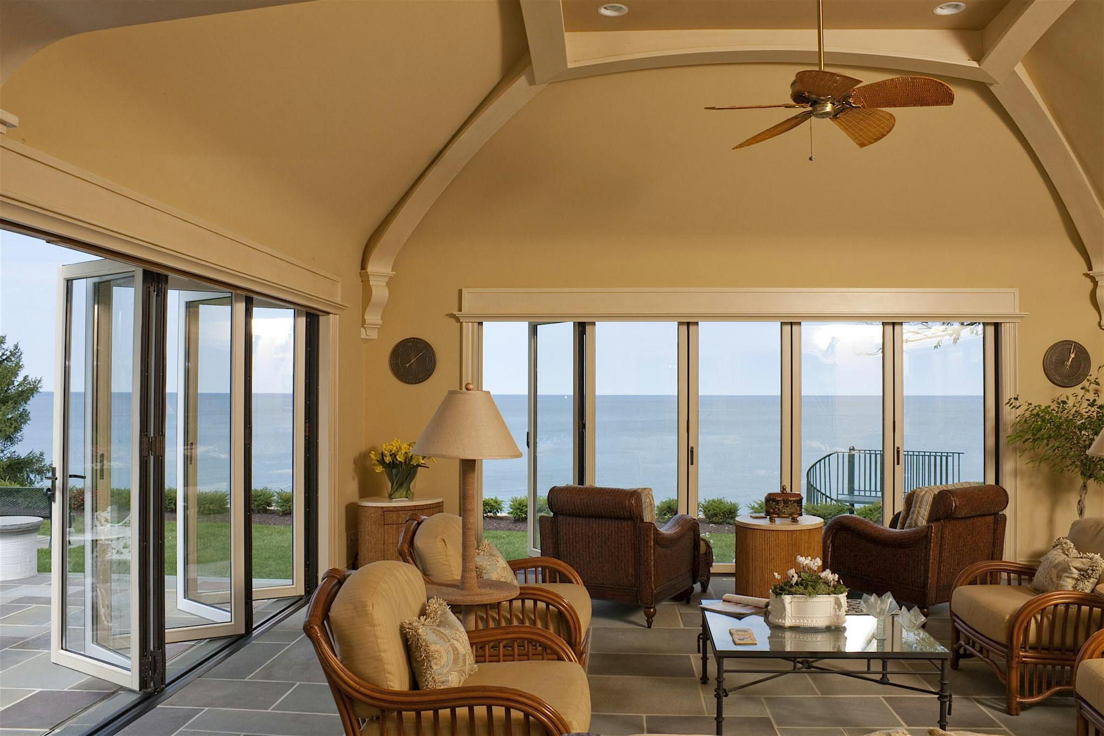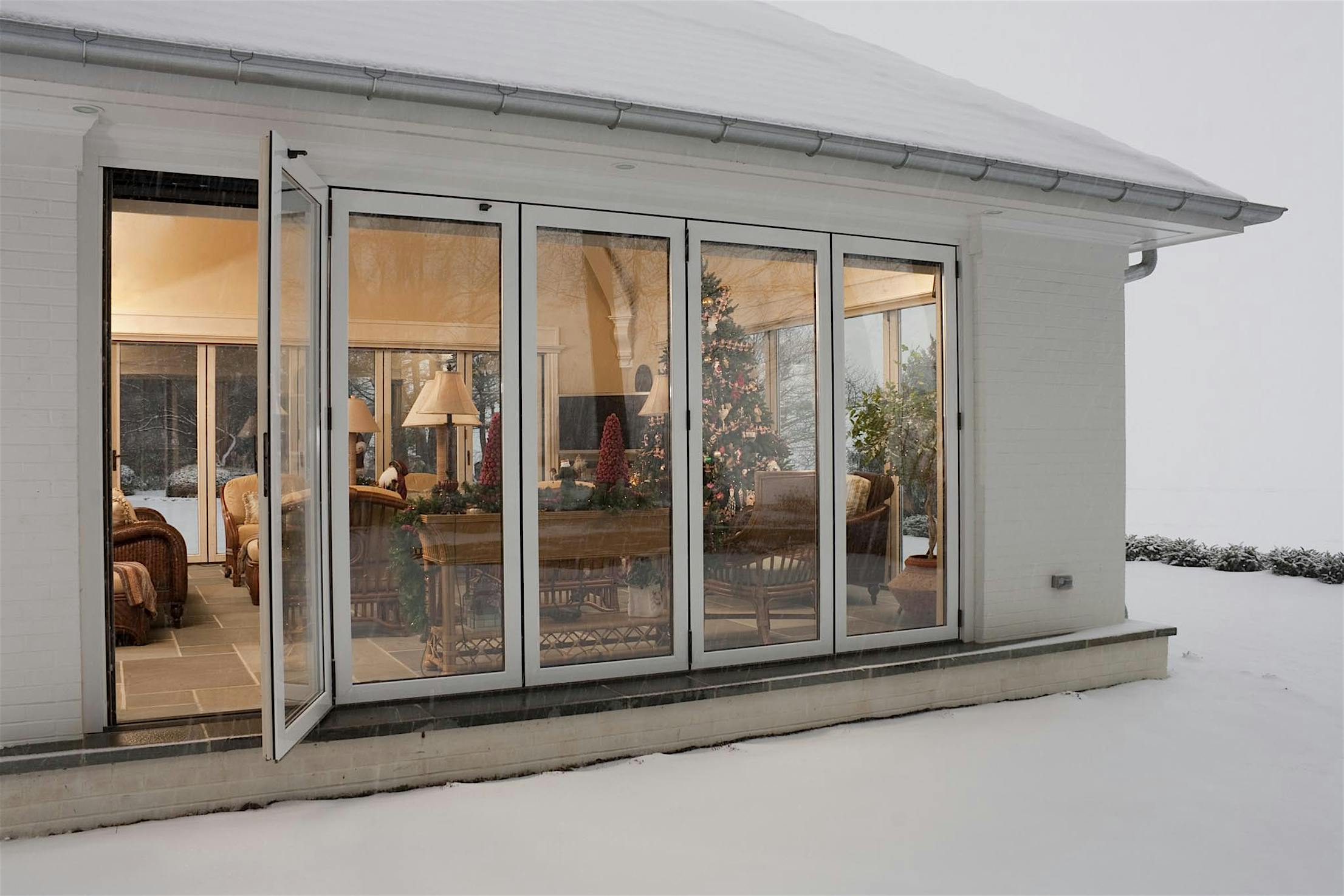 Each panel of the glass wall system is connected together along a single track and folds unto itself to create wide, unobstructed openings.