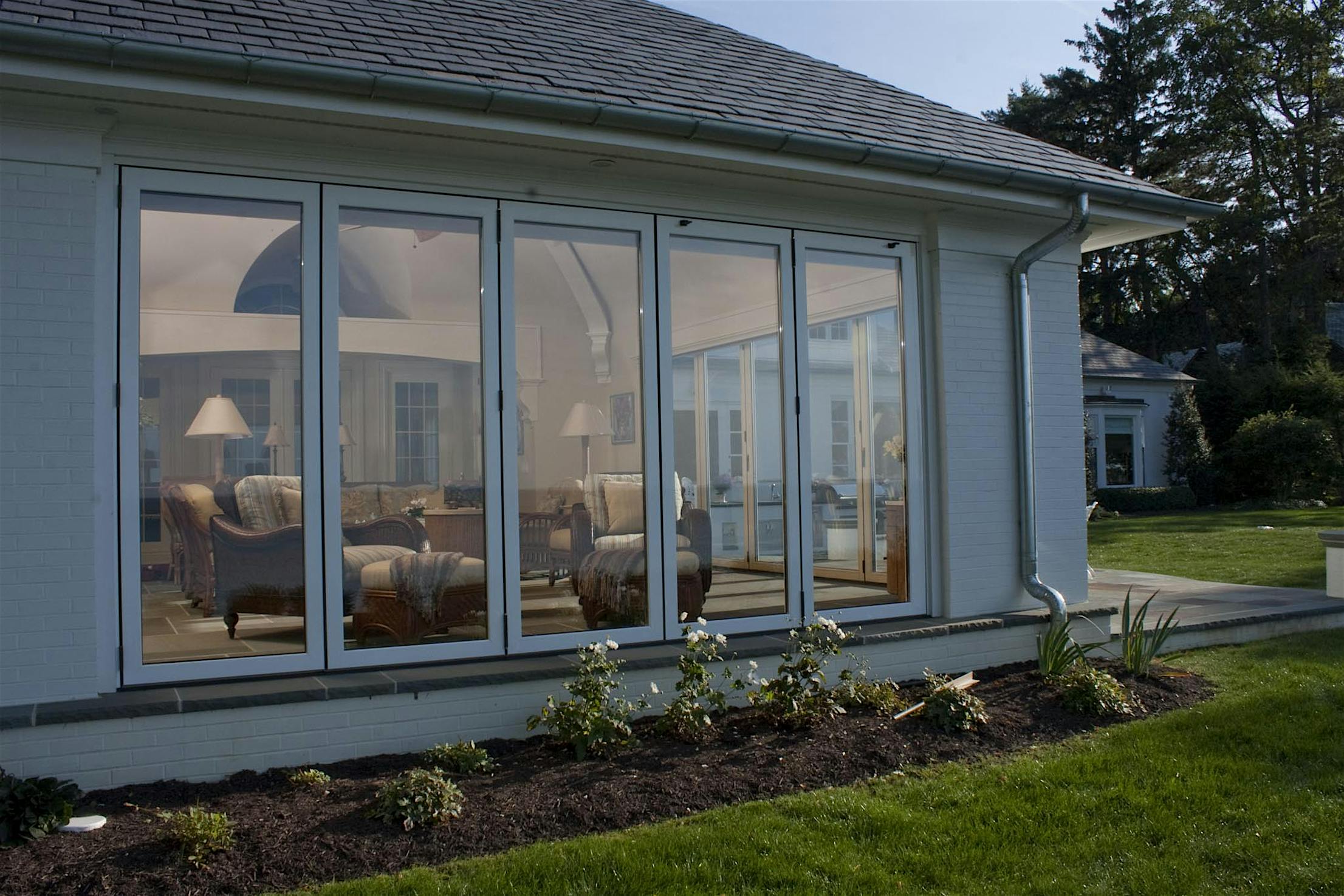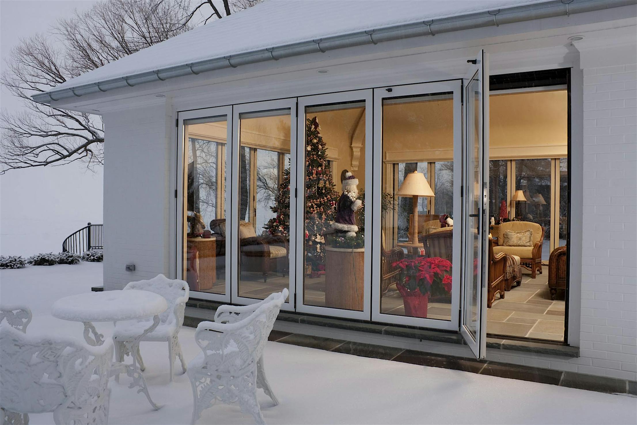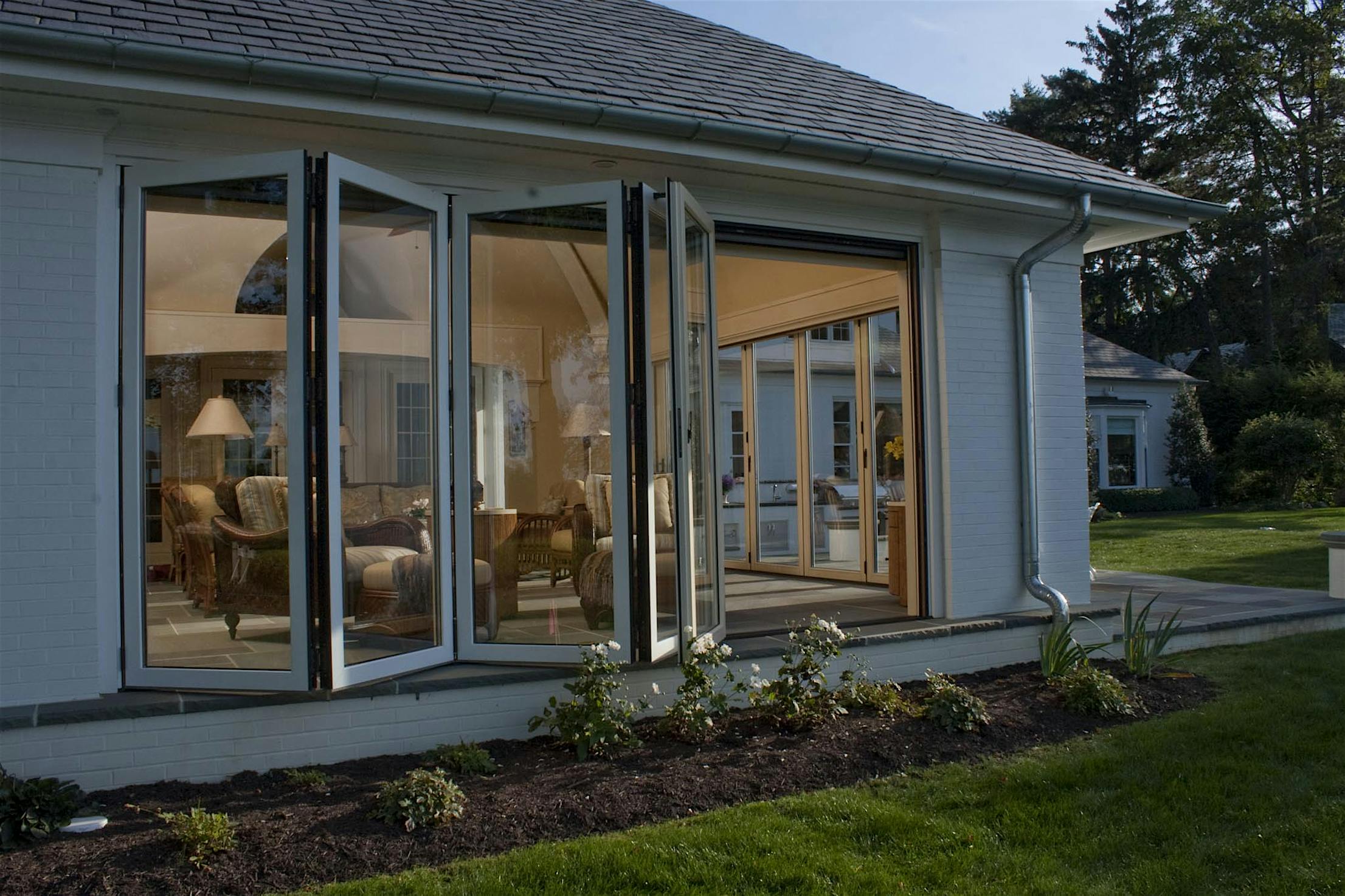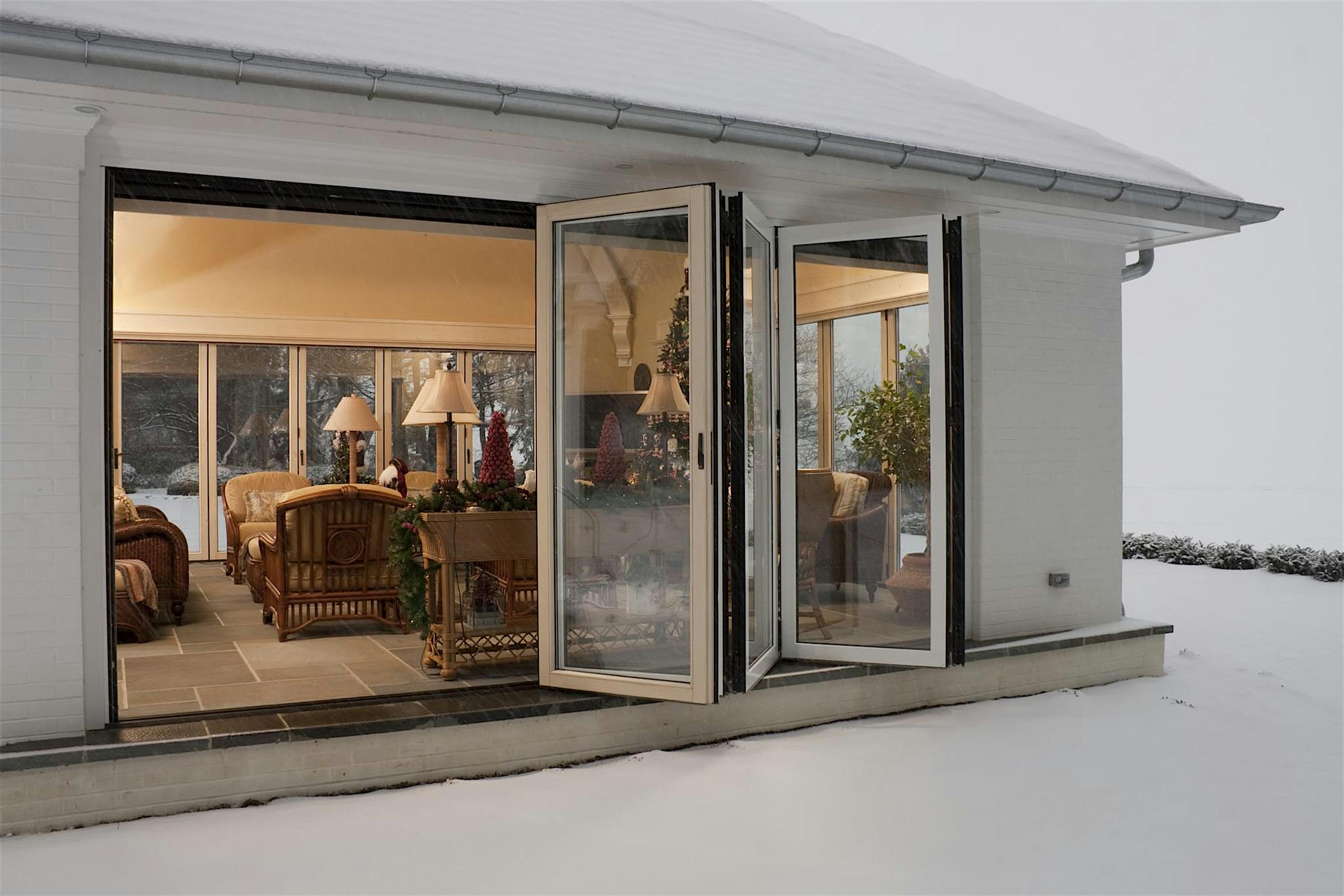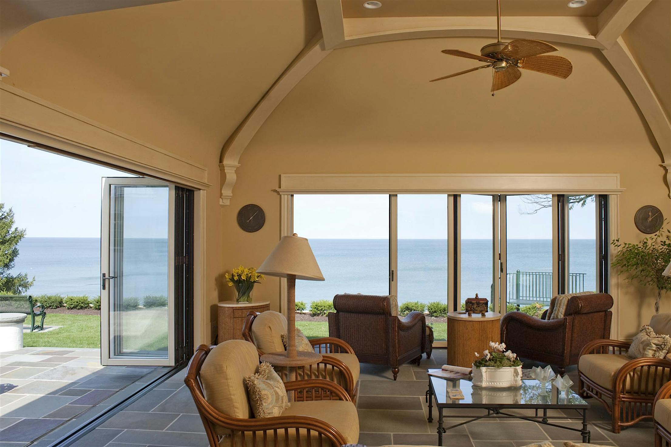 Each panel of the glass wall system is connected together along a single track and folds unto itself to create wide, unobstructed openings.