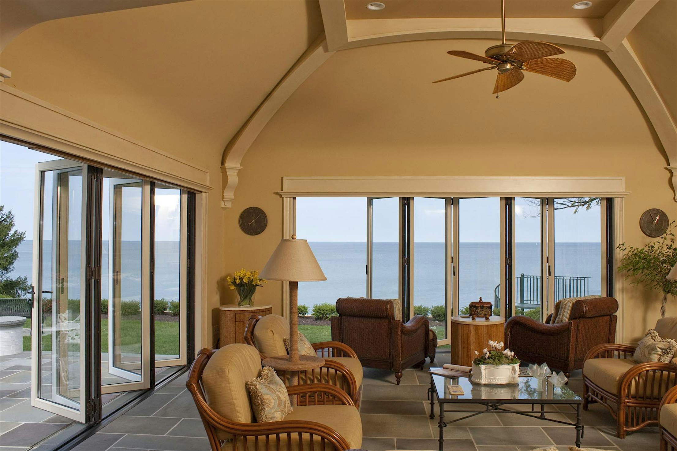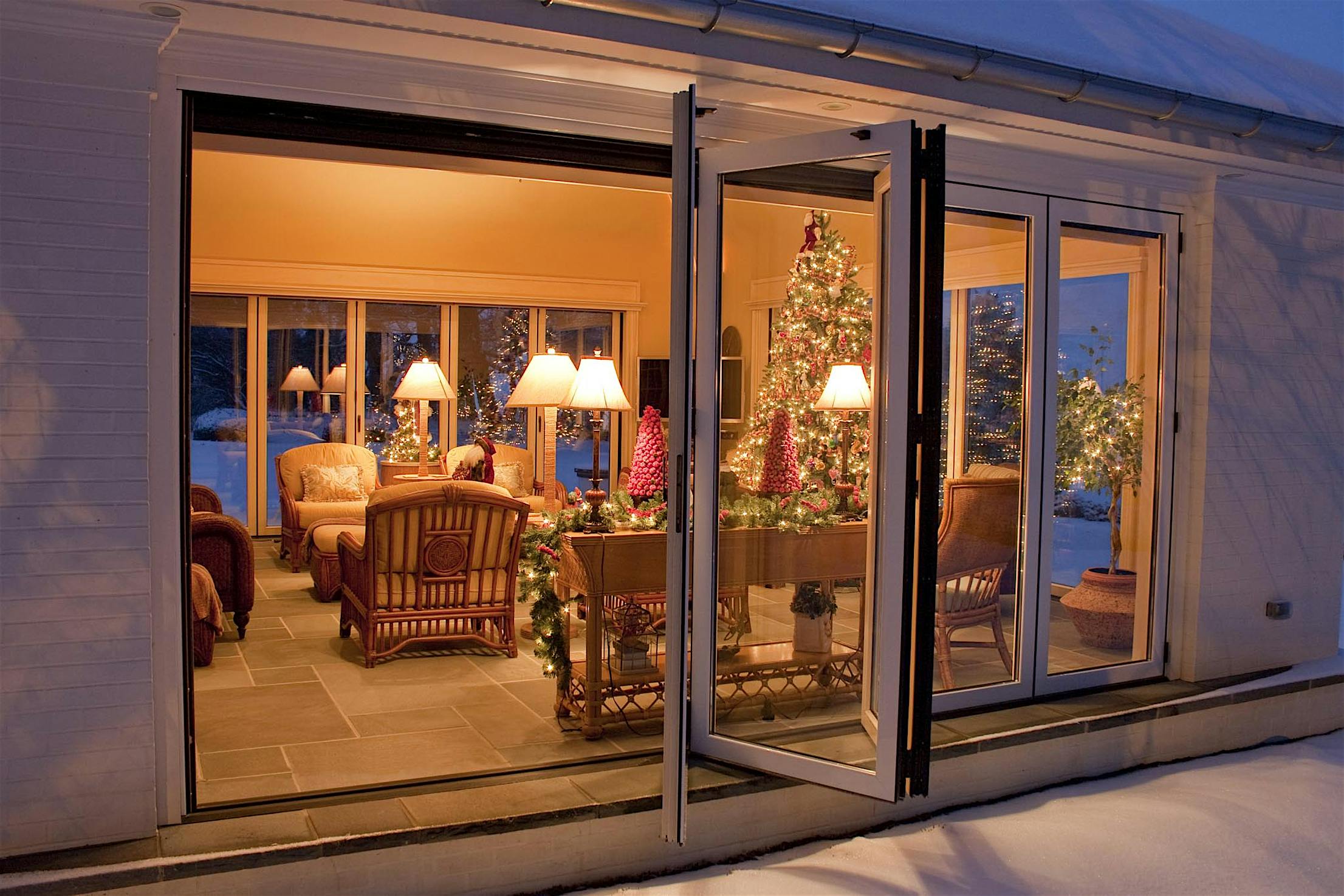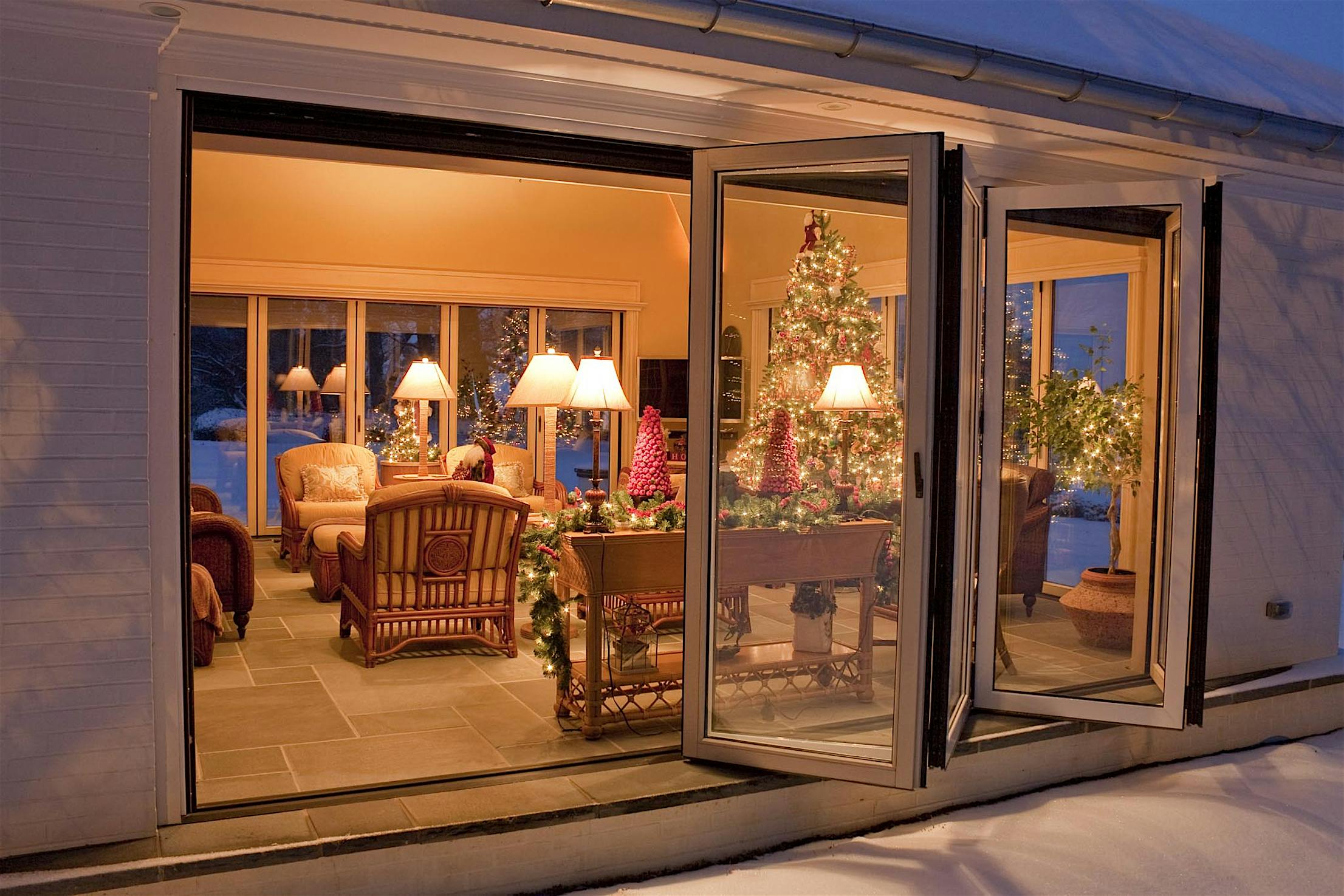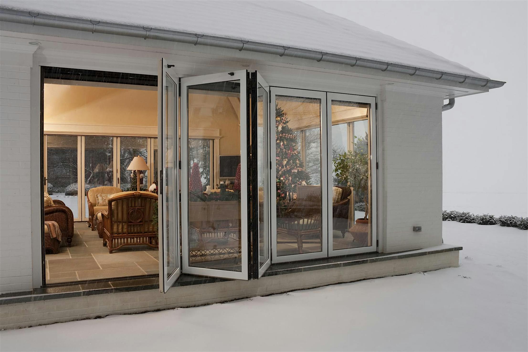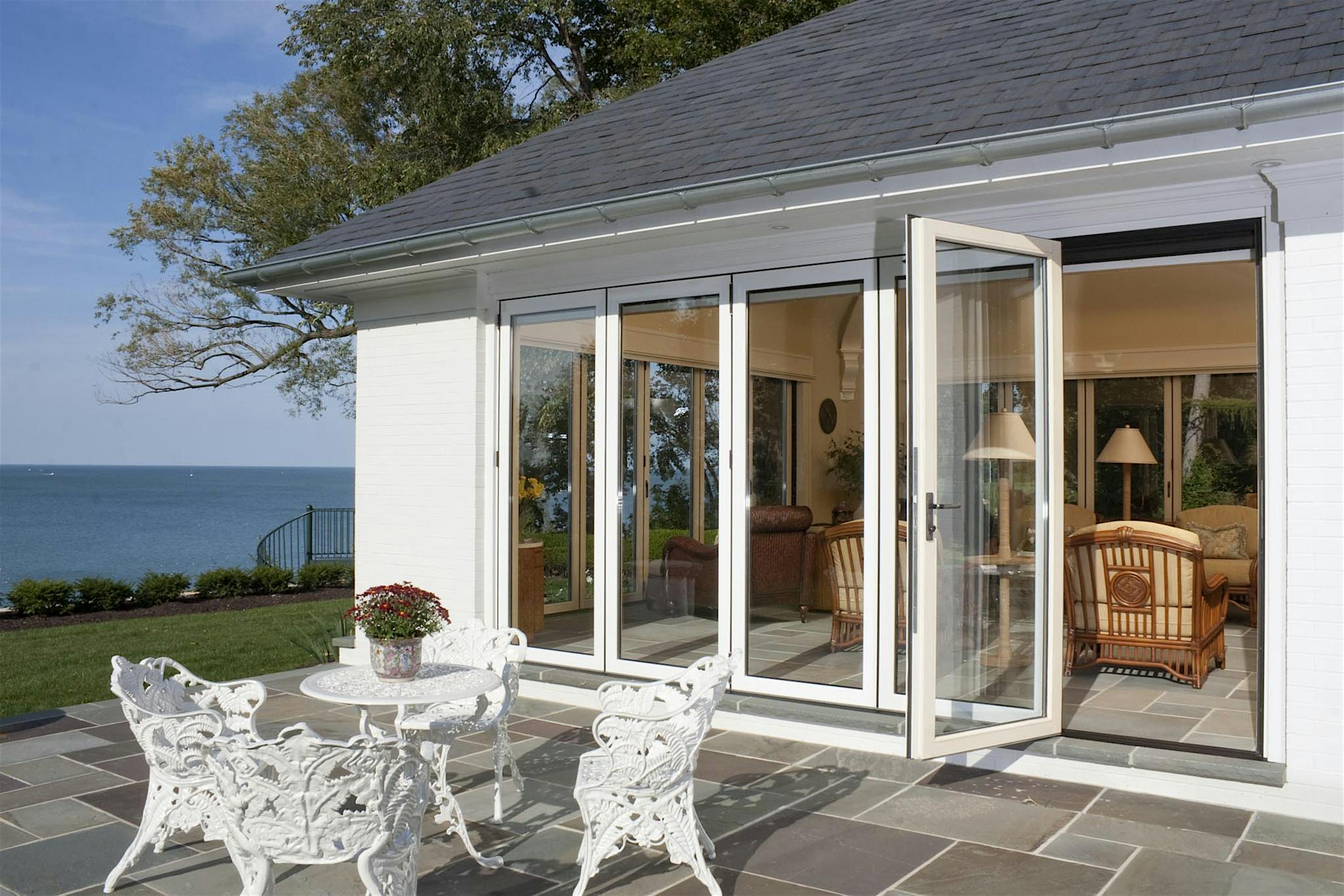 Each panel of the glass wall system is connected together along a single track and folds unto itself to create wide, unobstructed openings.