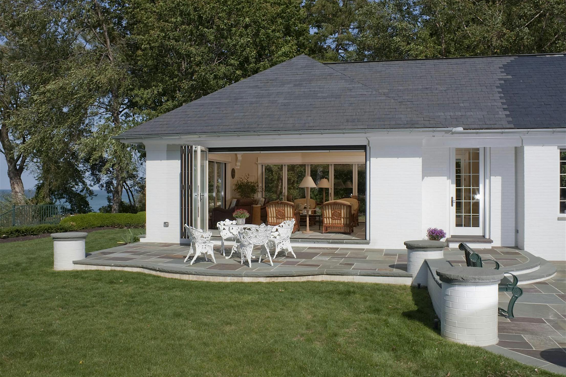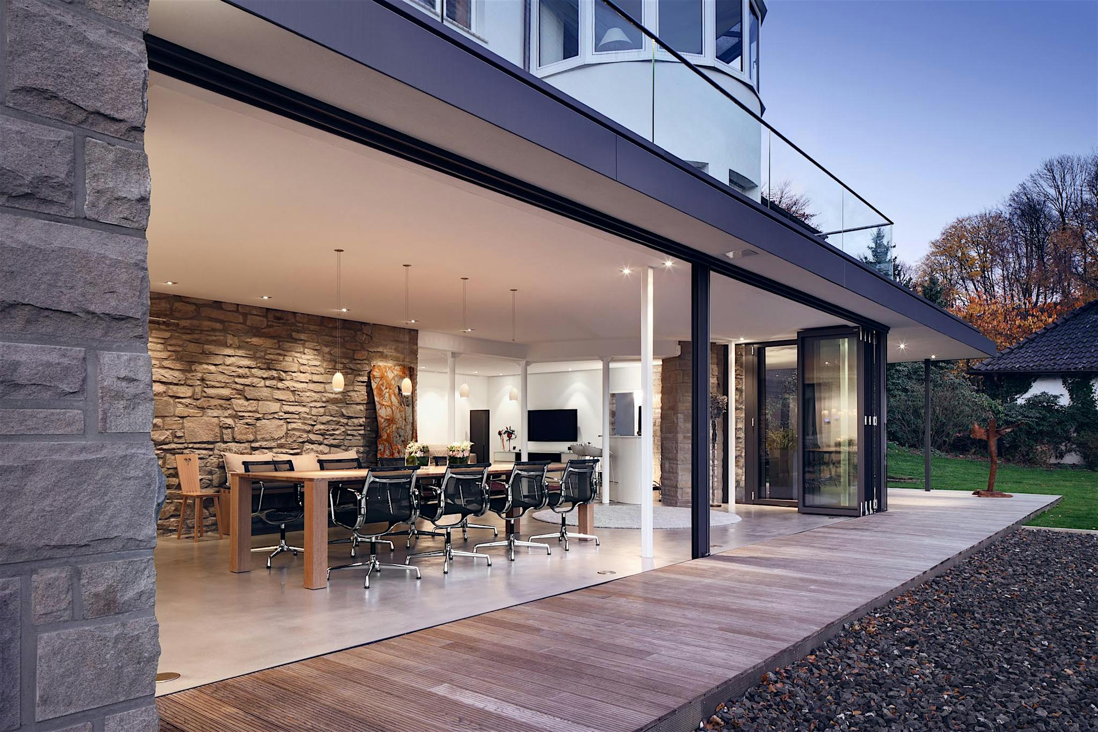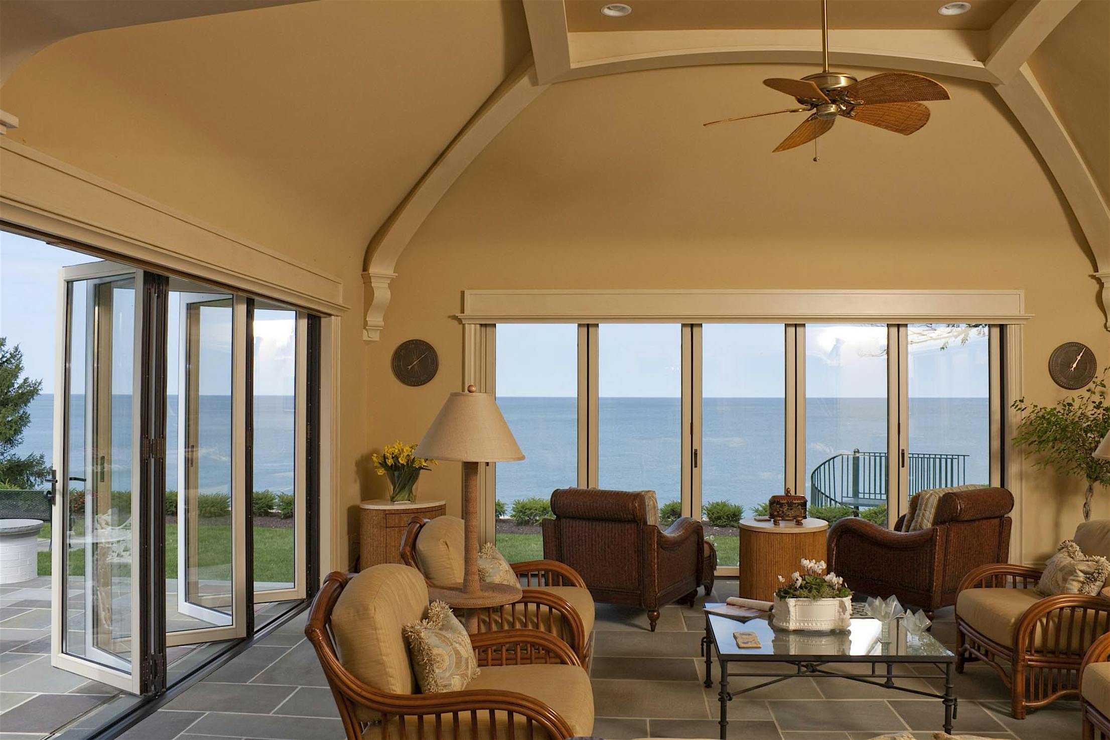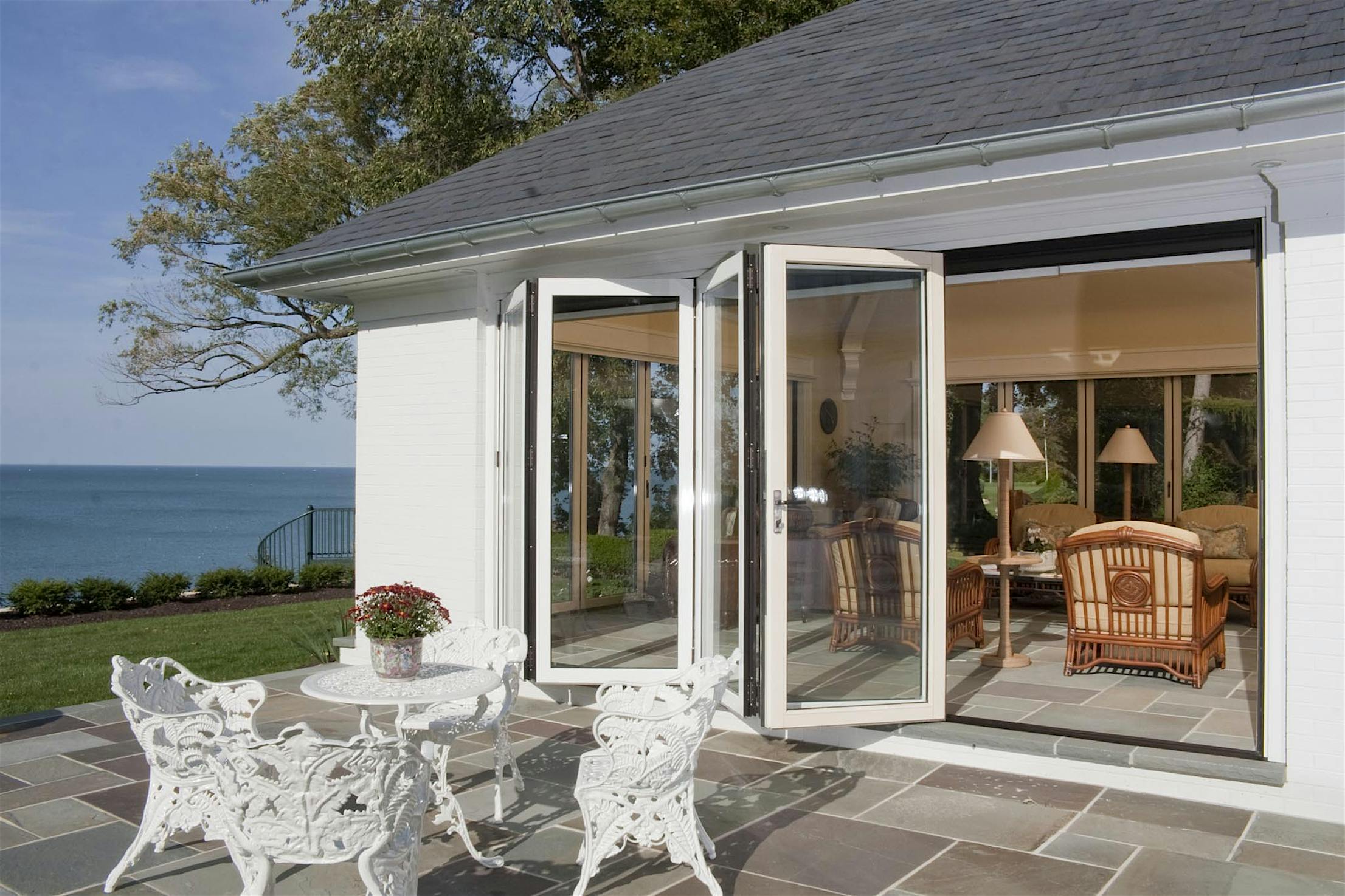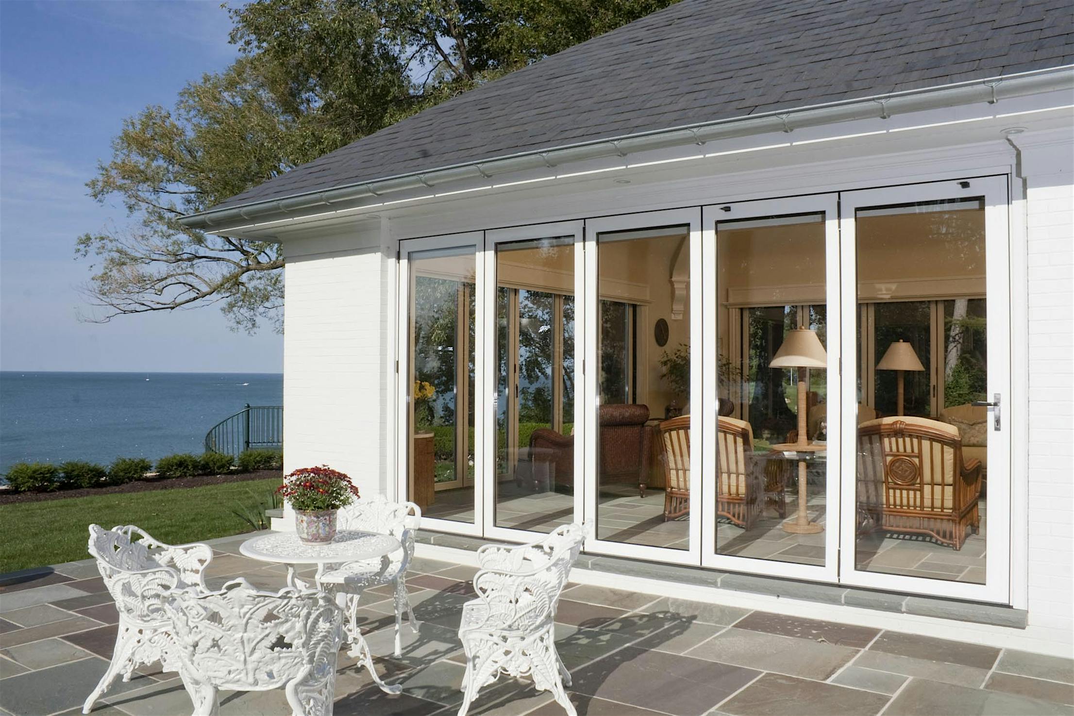 Each panel of the glass wall system is connected together along a single track and folds unto itself to create wide, unobstructed openings.