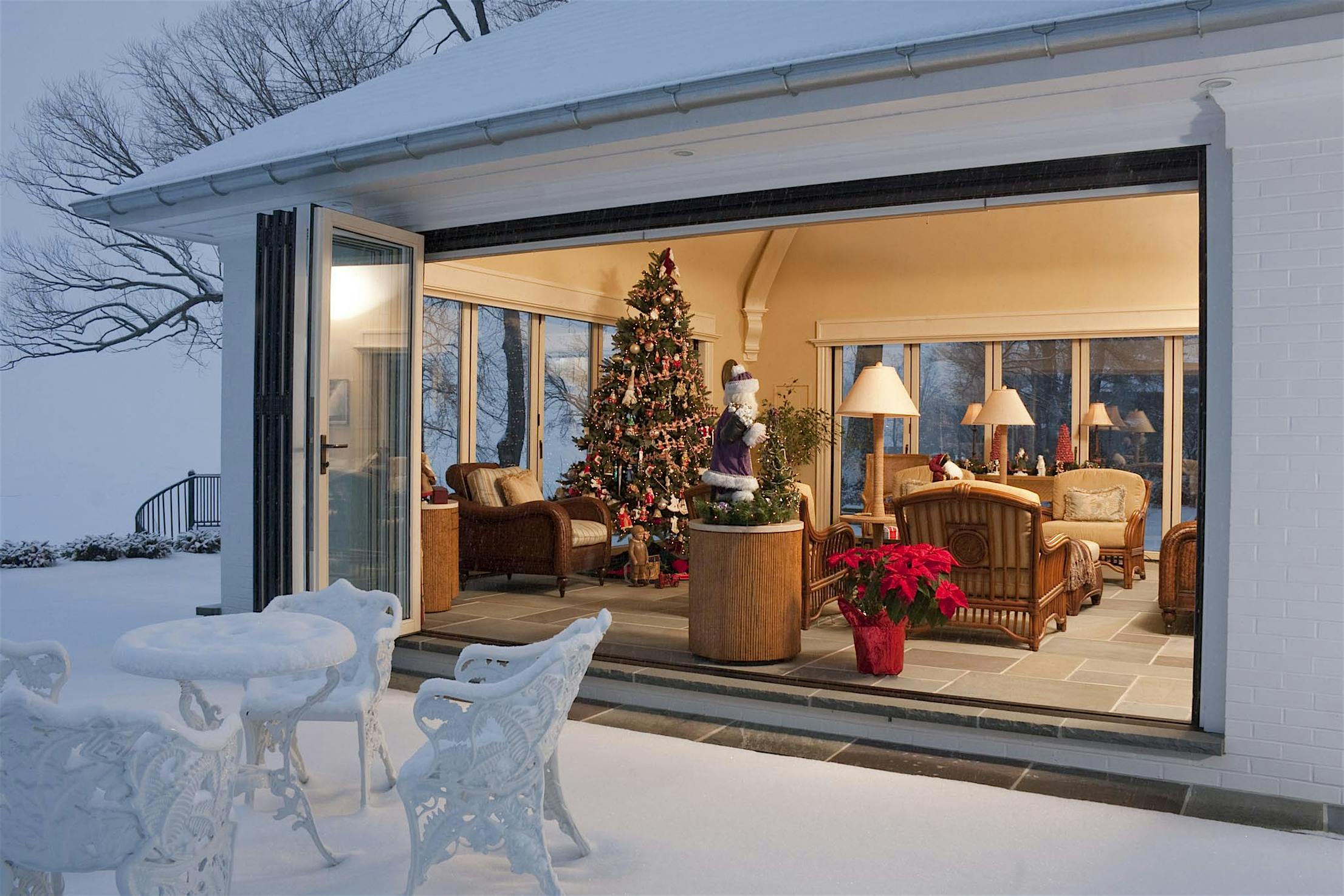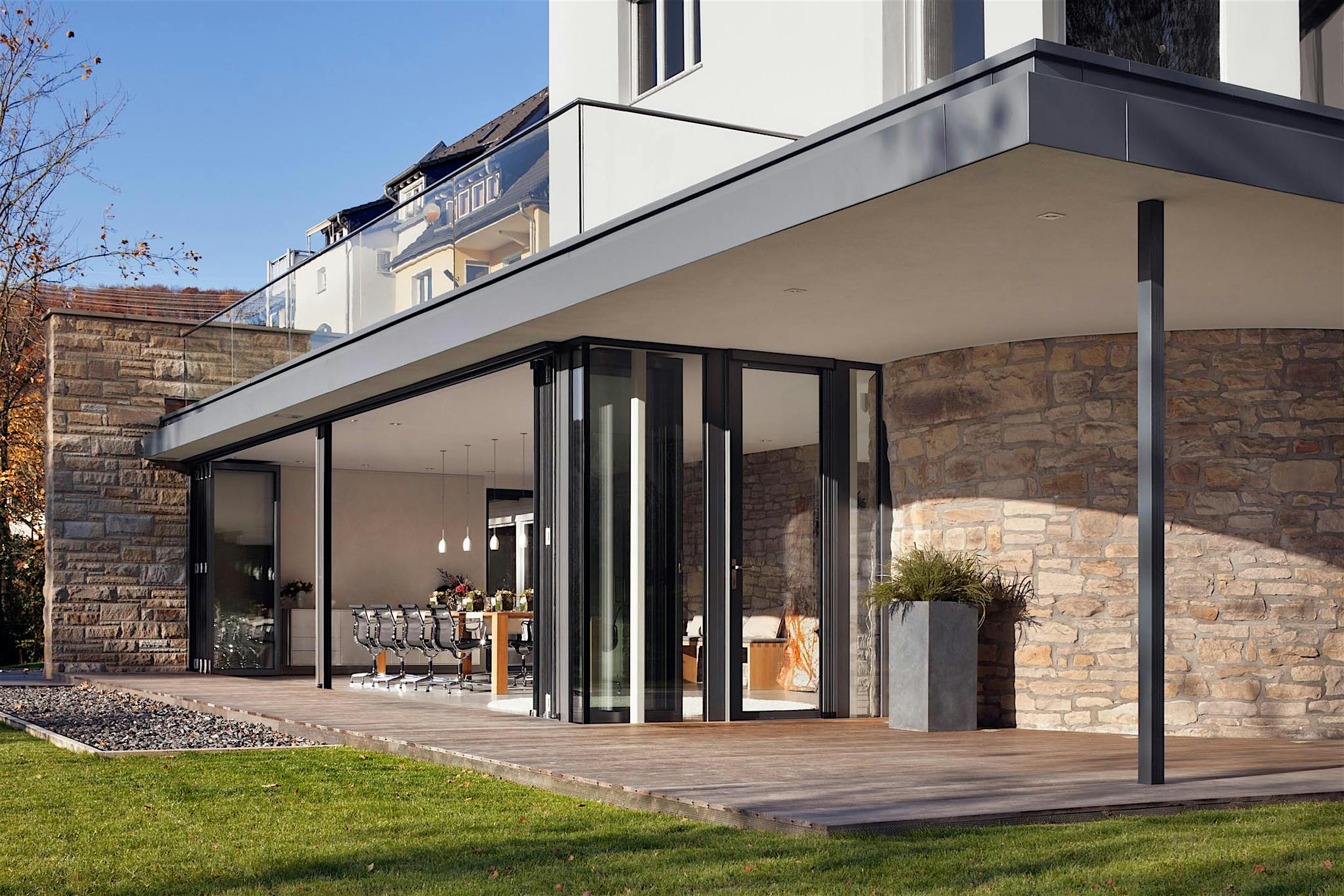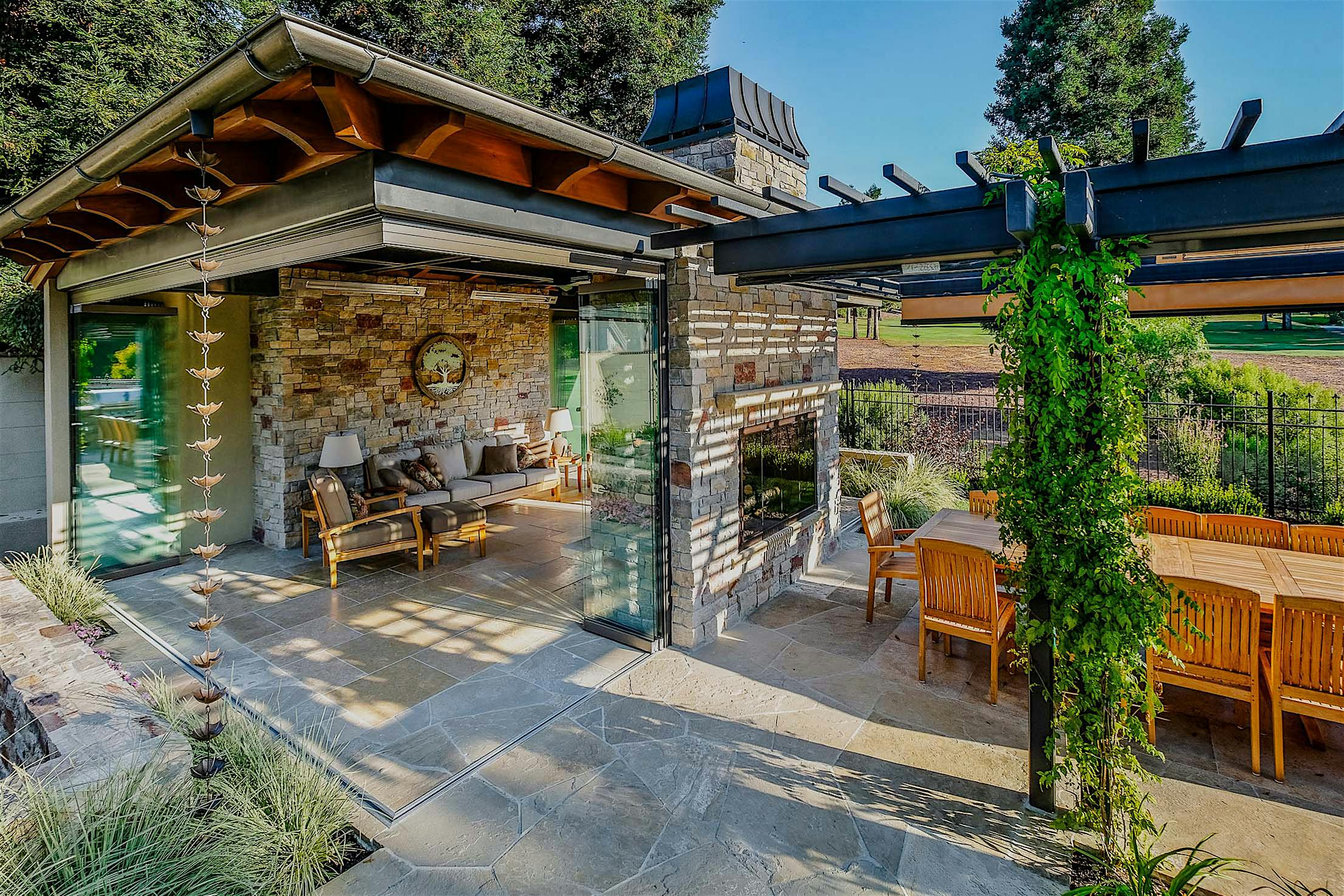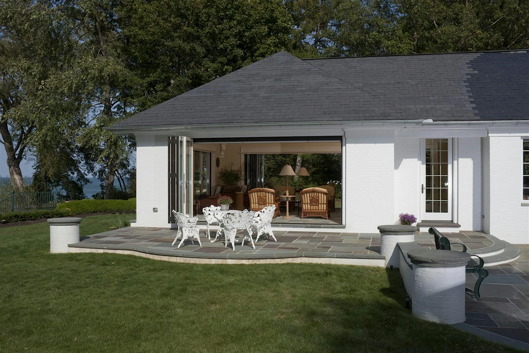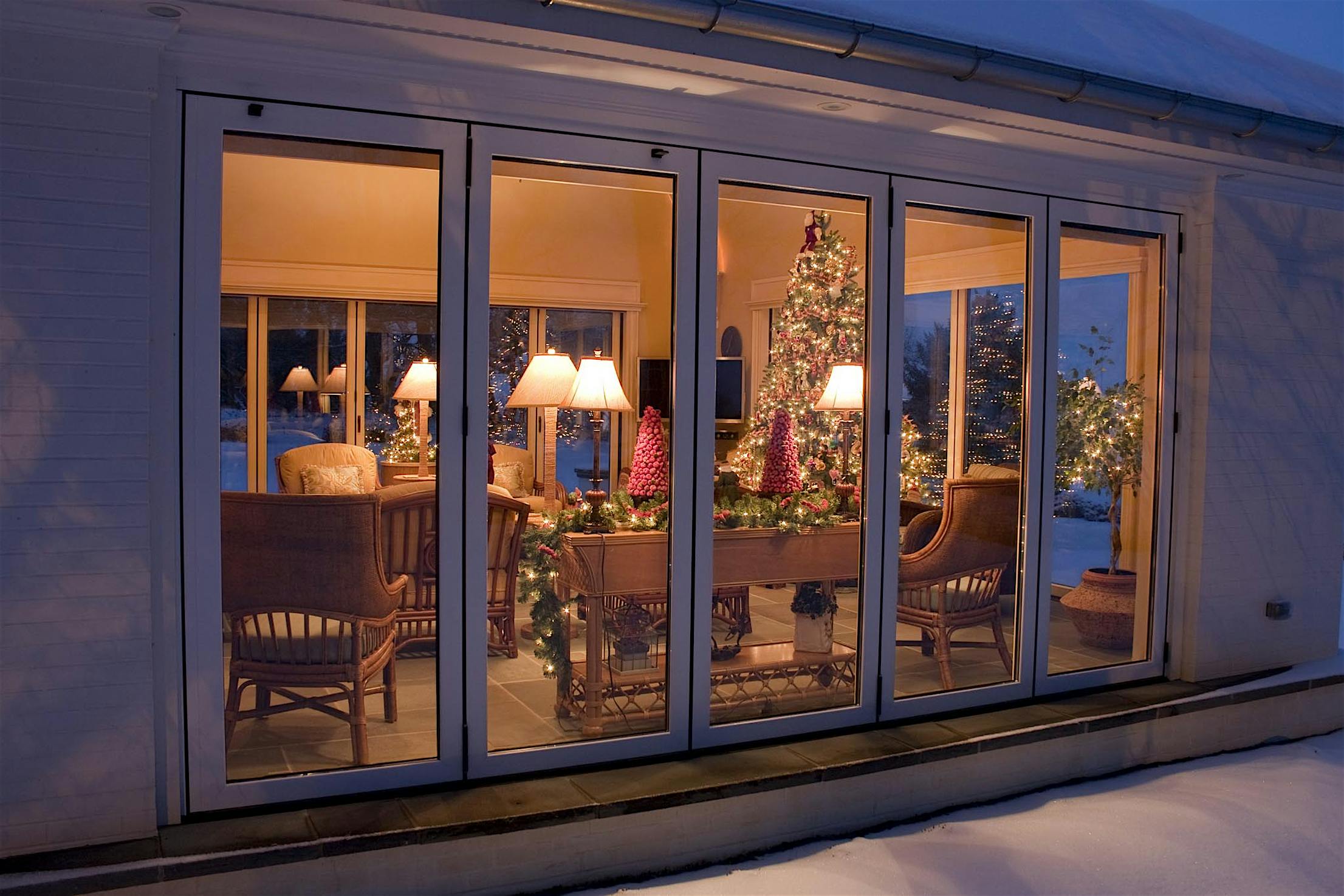Each panel of the glass wall system is connected together along a single track and folds unto itself to create wide, unobstructed openings.