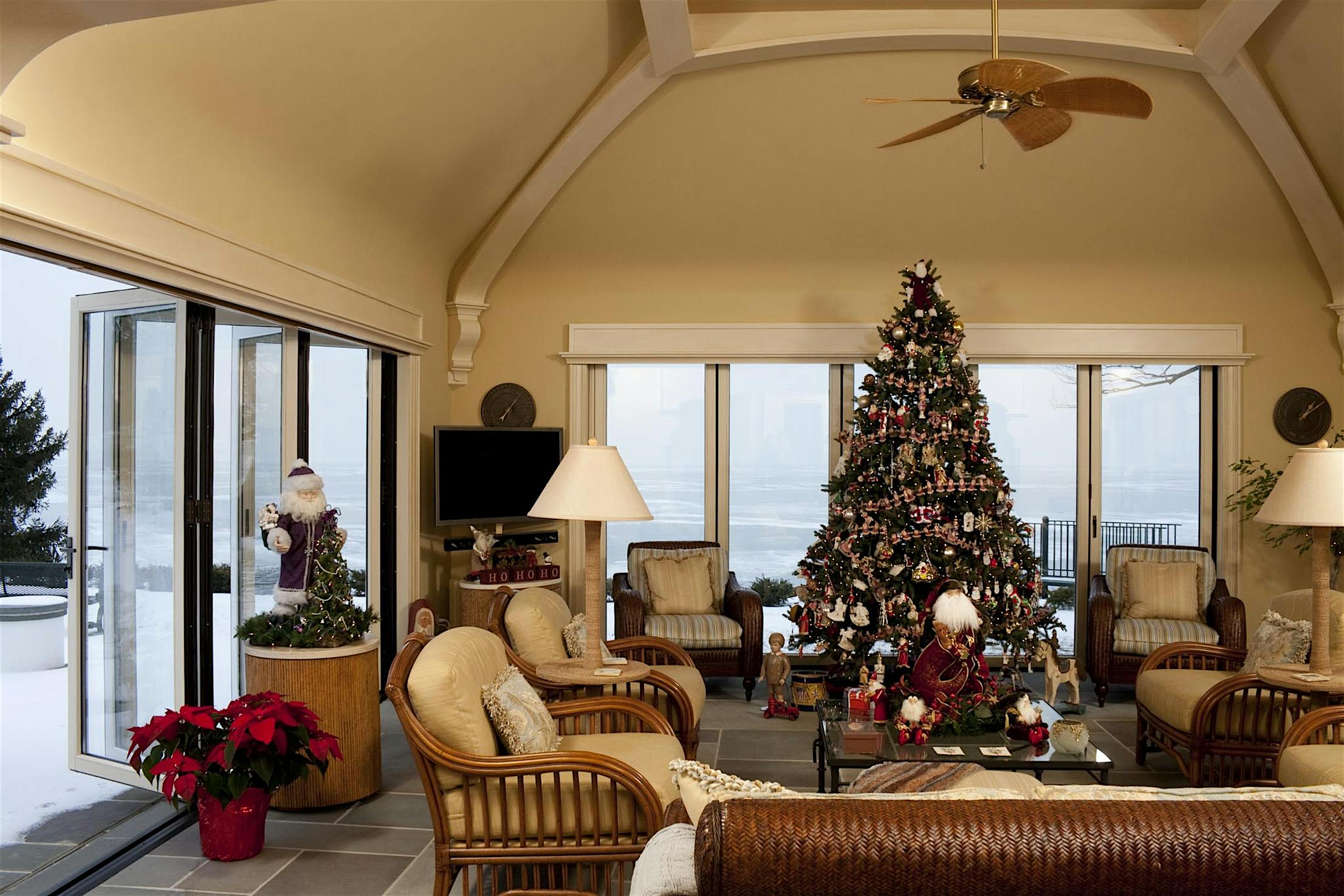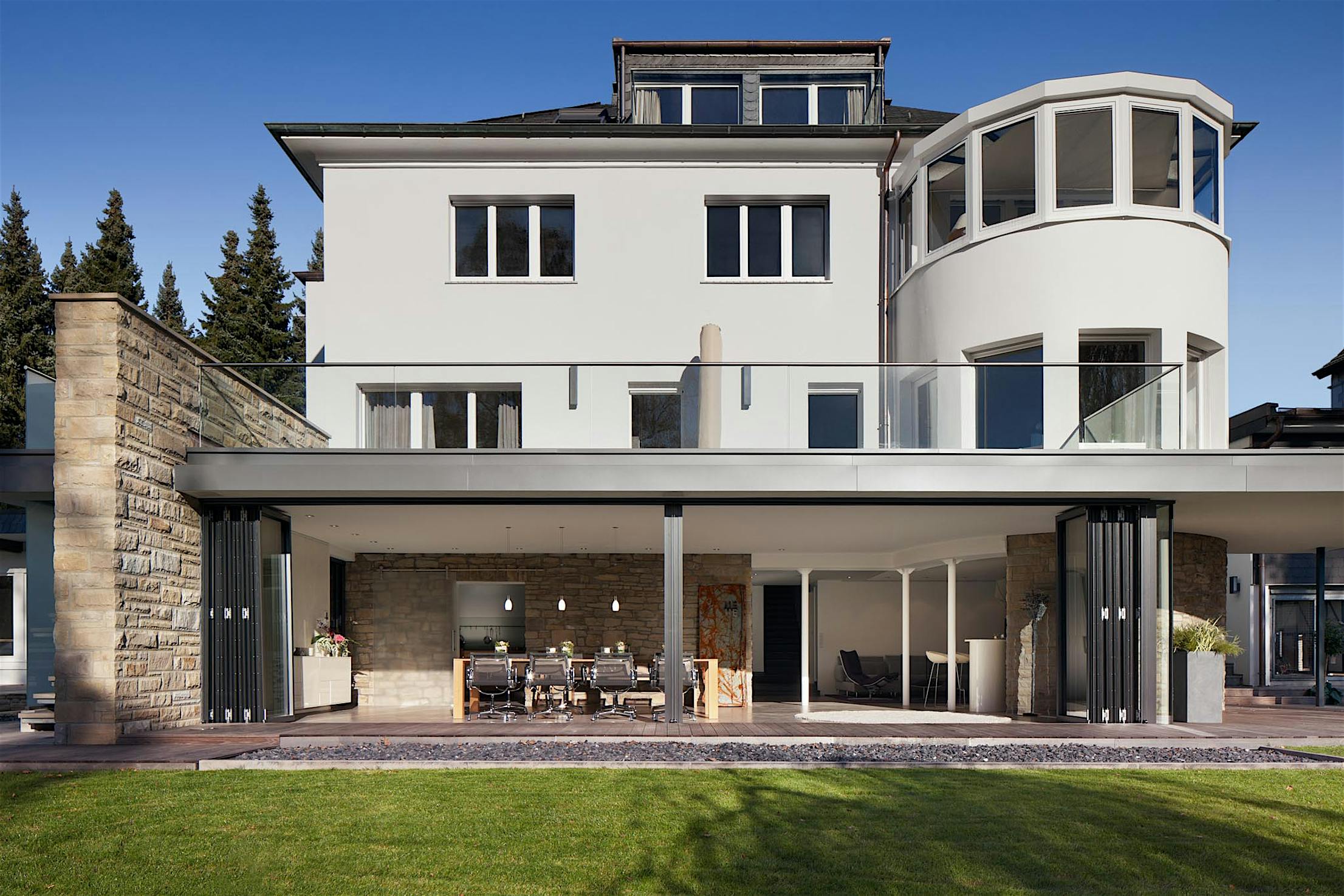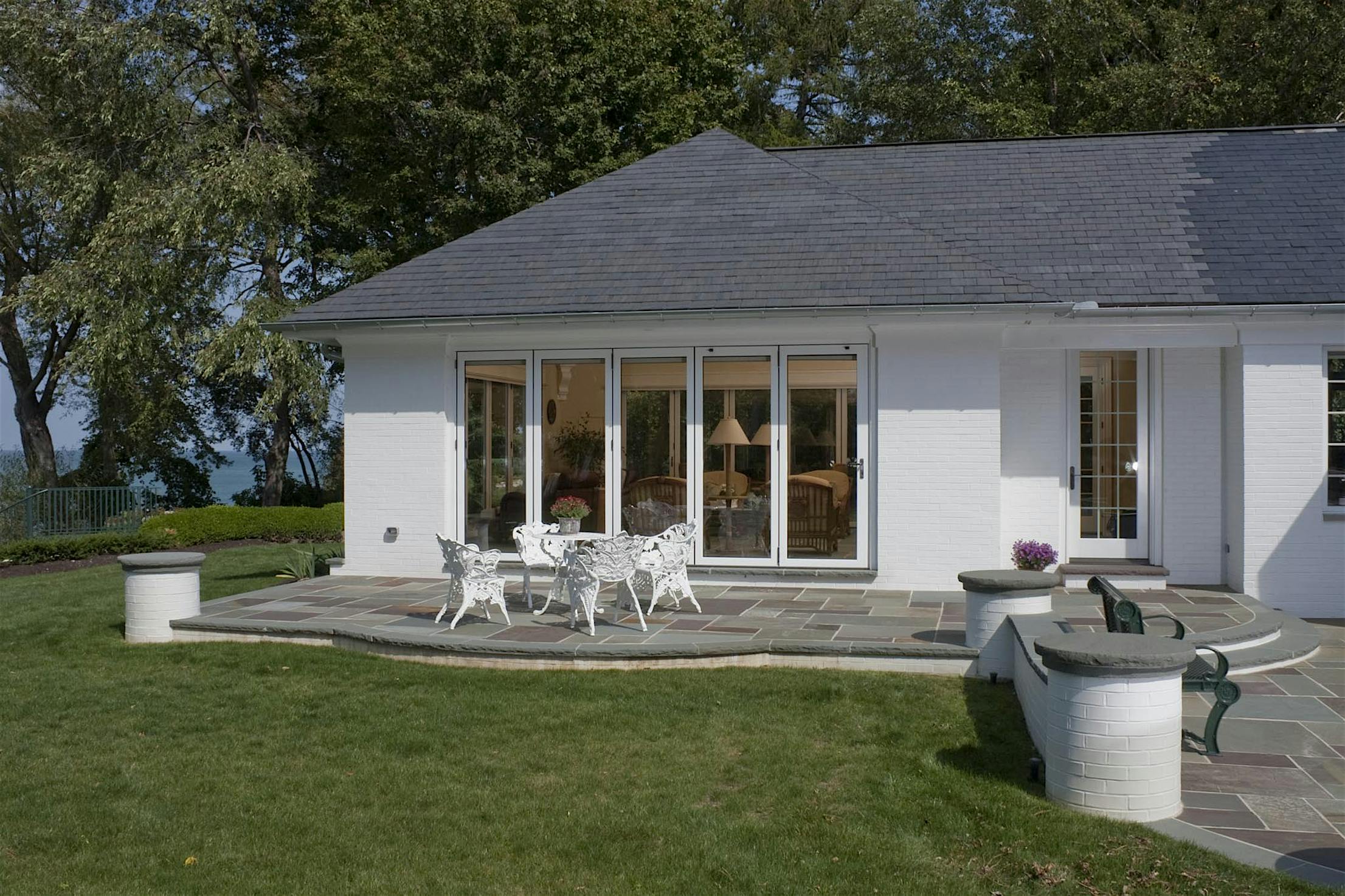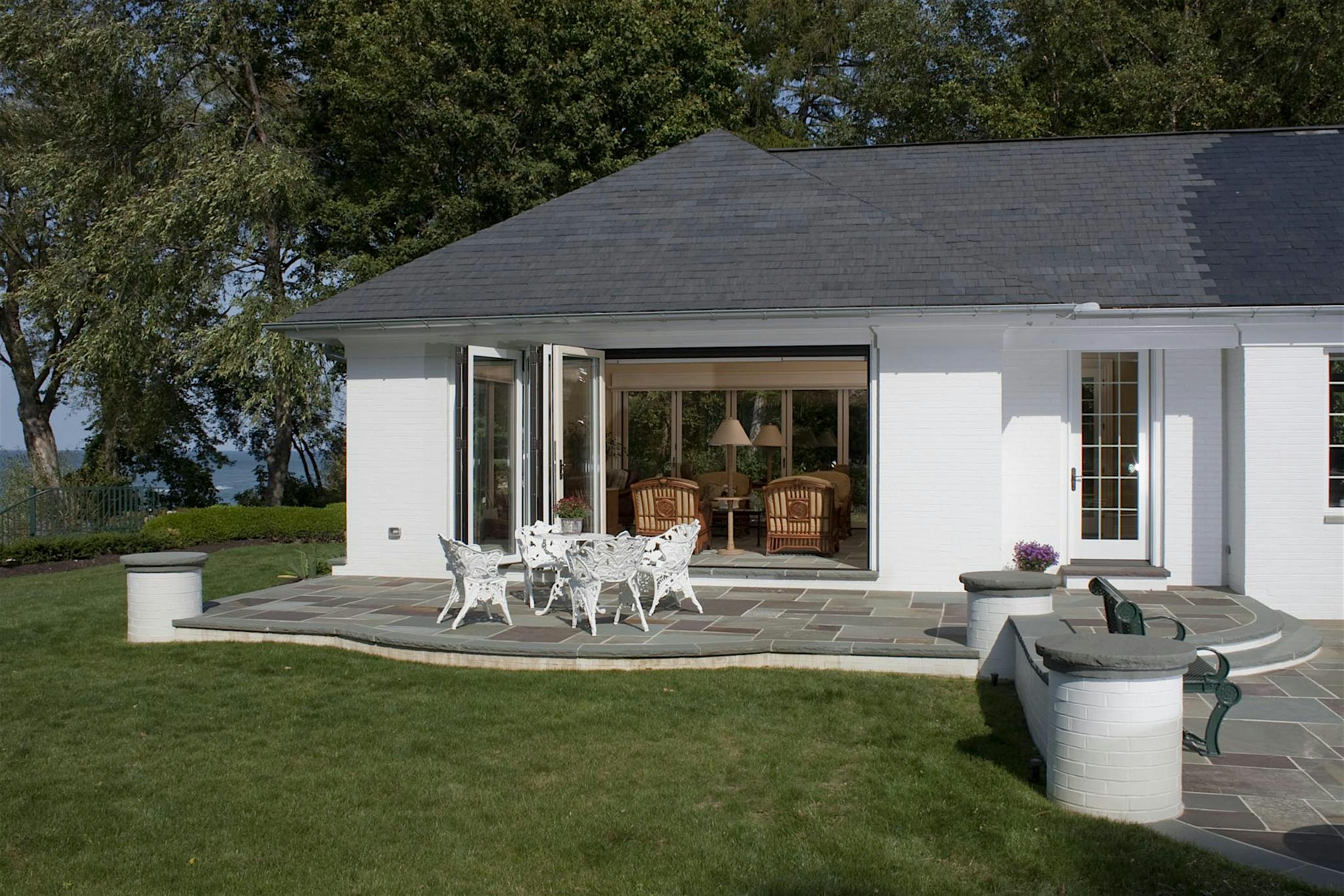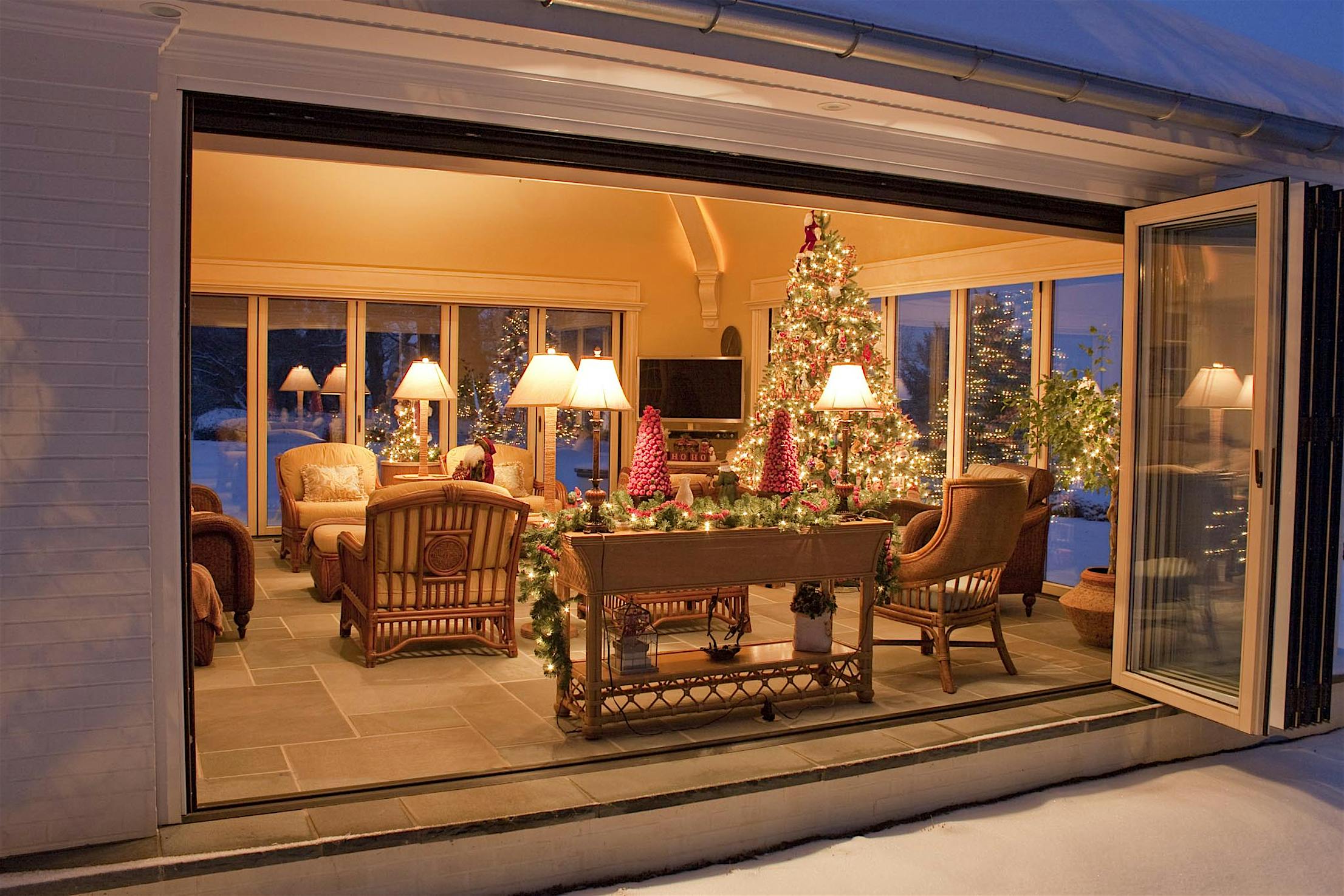 Each panel of the glass wall system is connected together along a single track and folds unto itself to create wide, unobstructed openings.