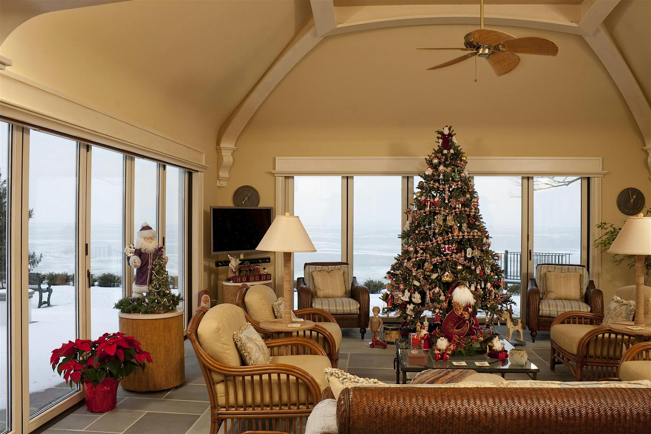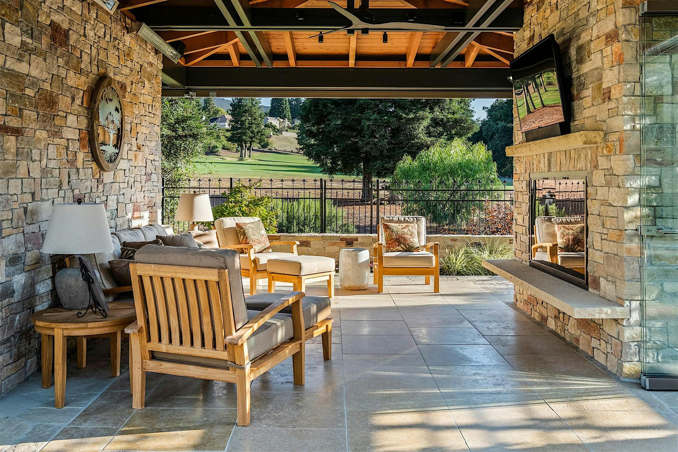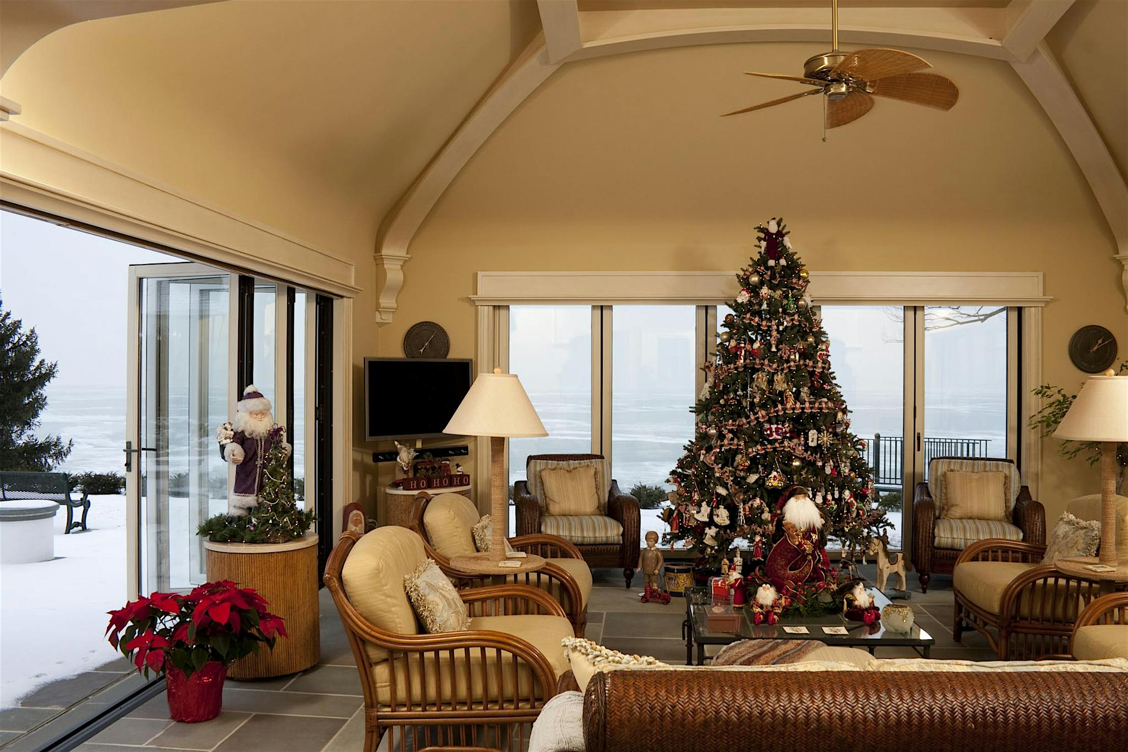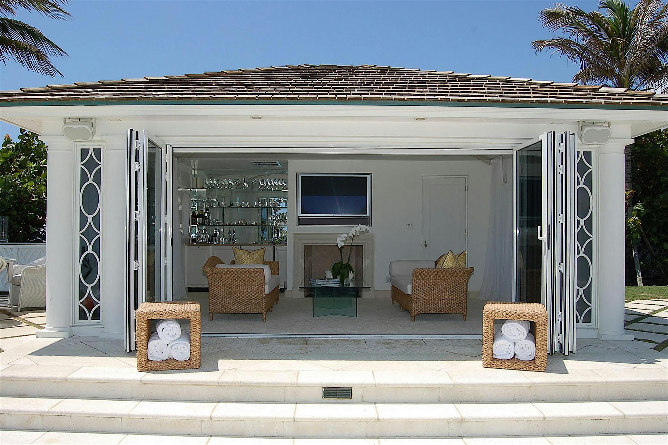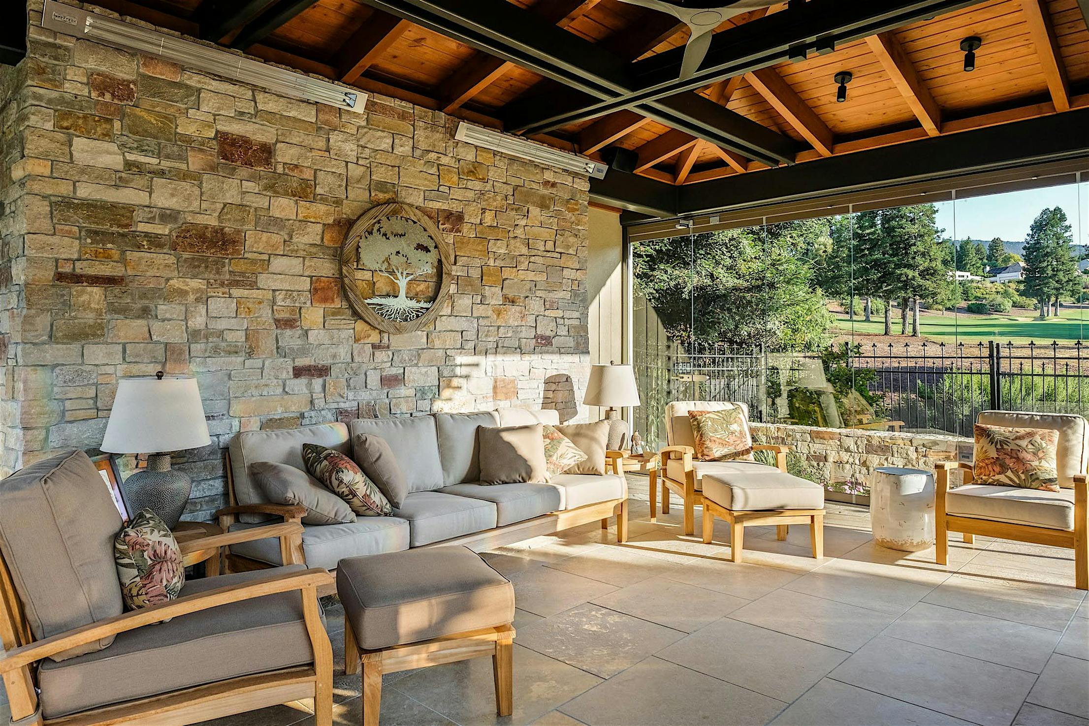 Each panel of the glass wall system is connected together along a single track and folds unto itself to create wide, unobstructed openings.