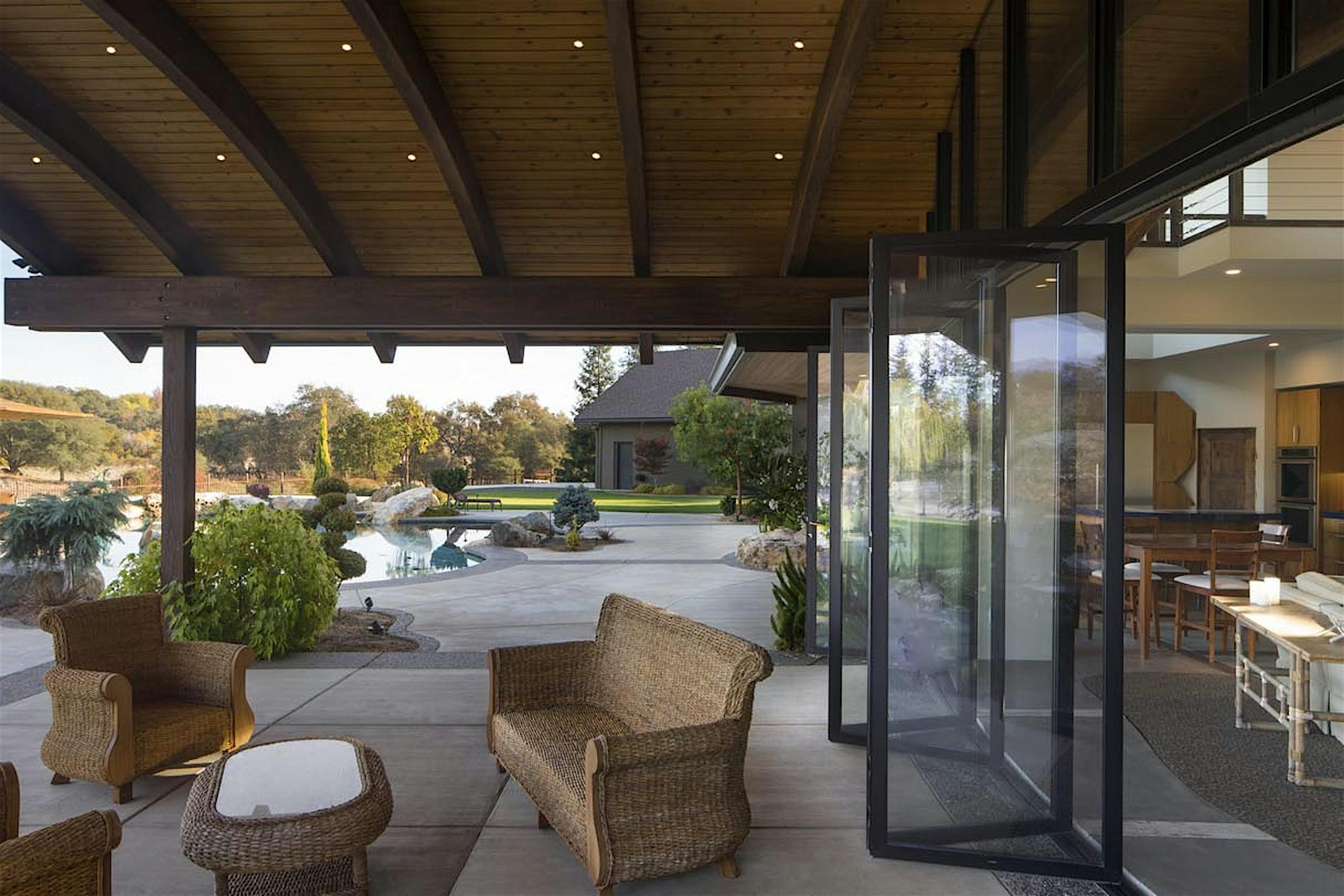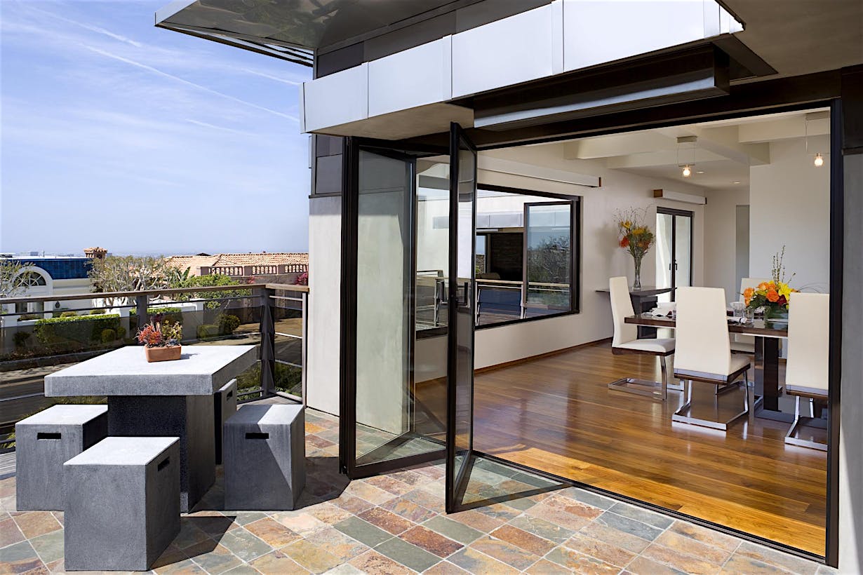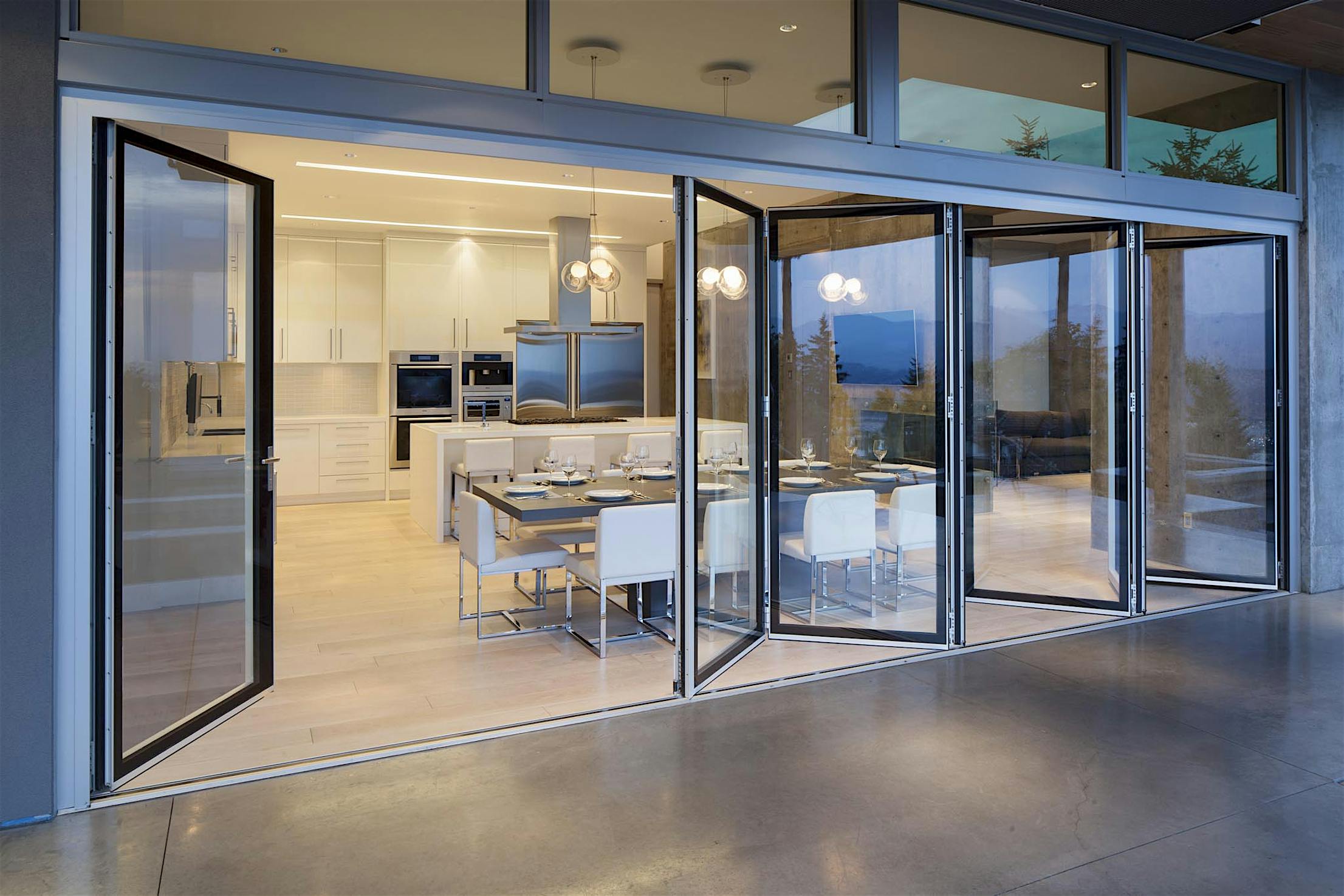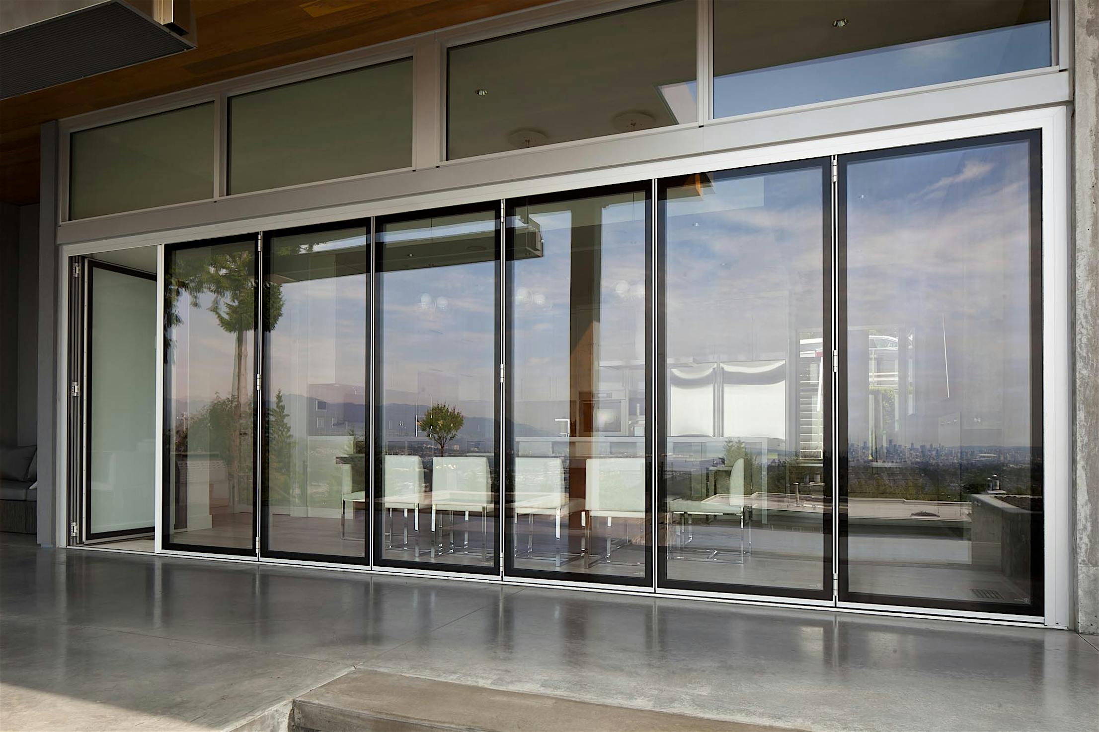 Each panel of the glass wall system is connected together along a single track and folds unto itself to create wide, unobstructed openings.