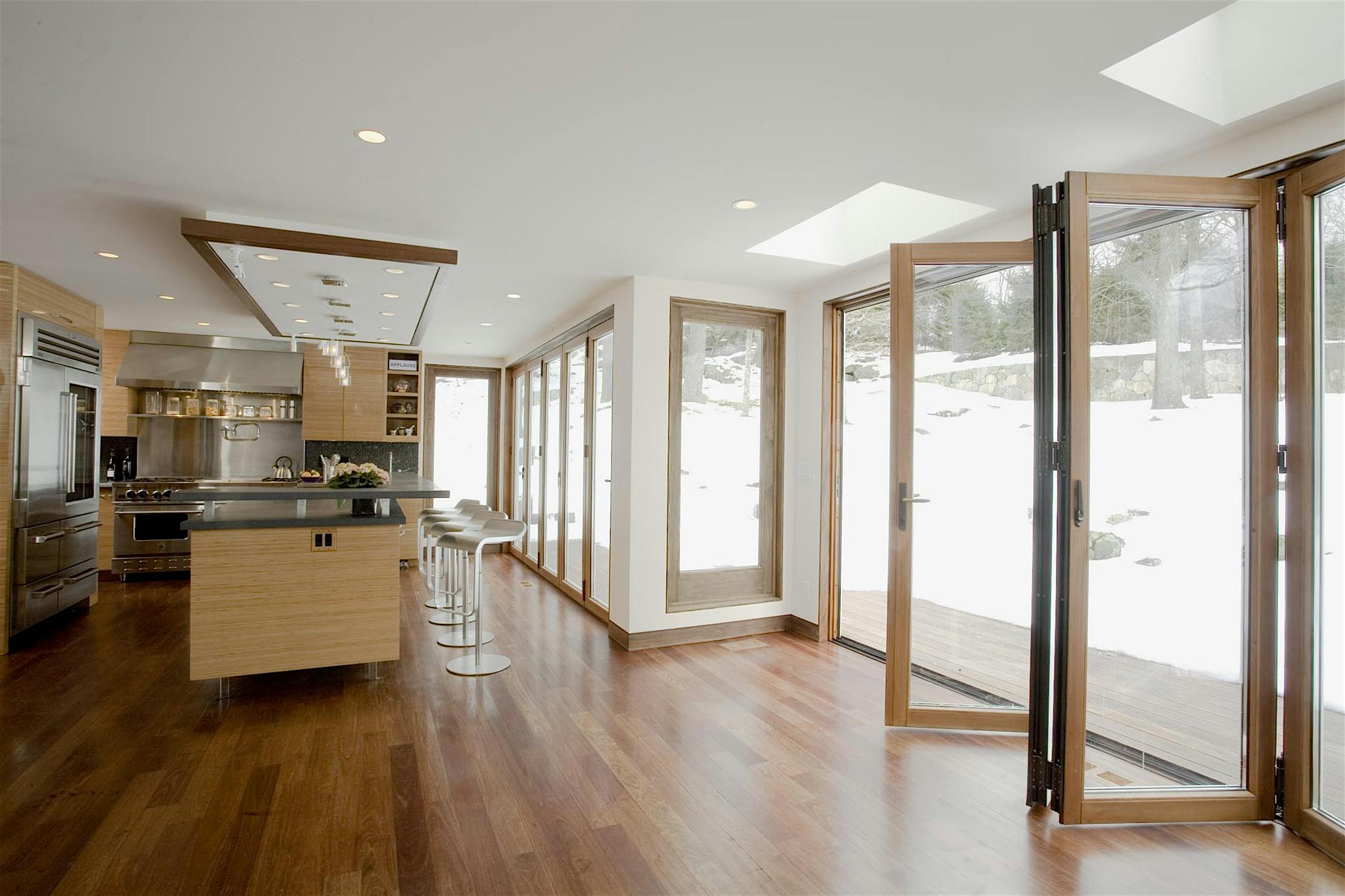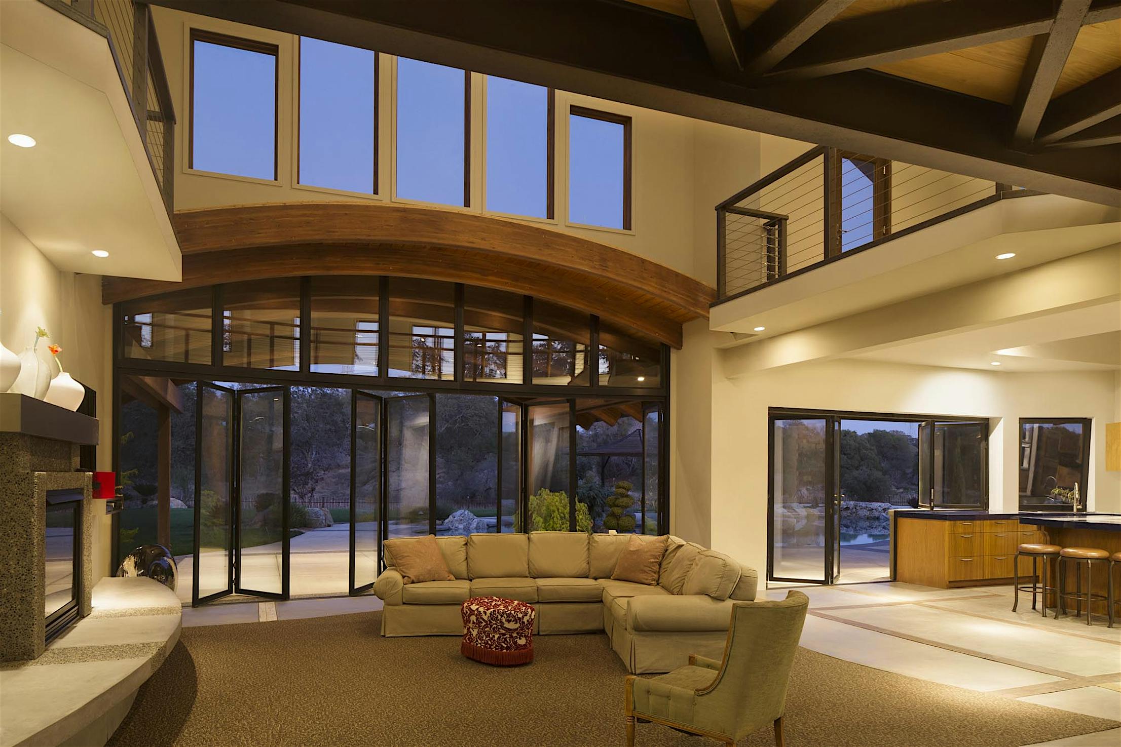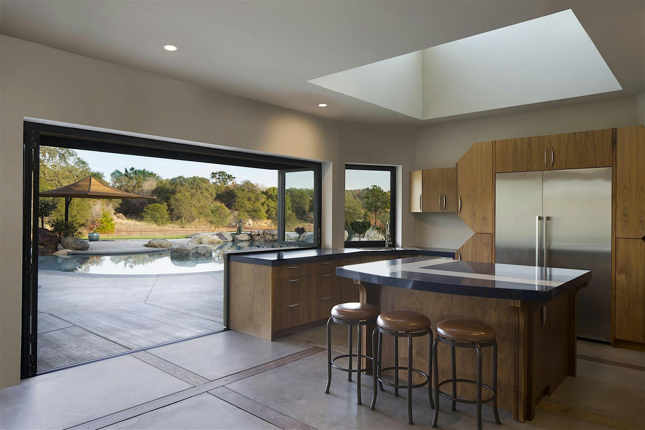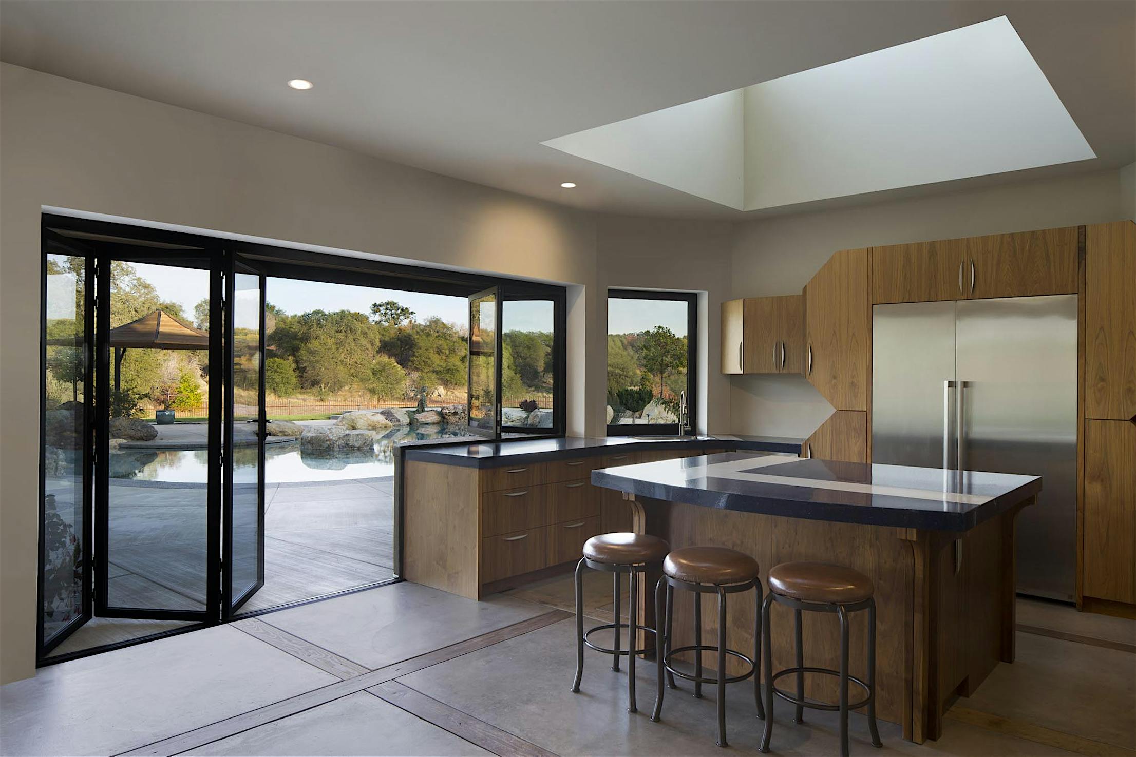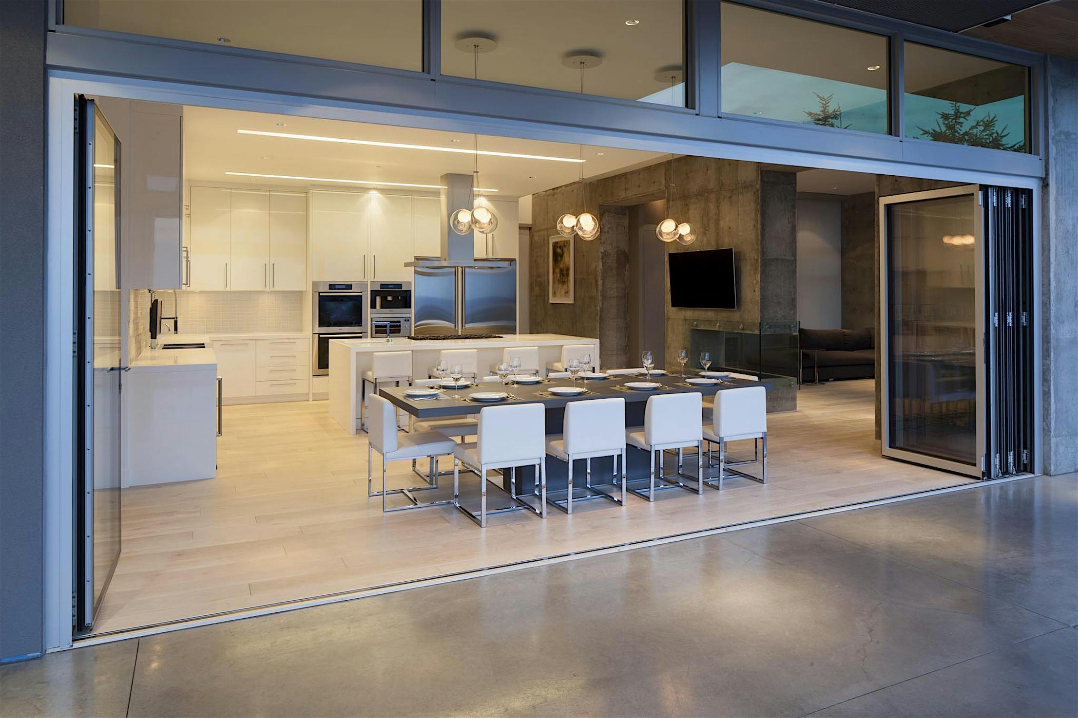 Each panel of the glass wall system is connected together along a single track and folds unto itself to create wide, unobstructed openings.