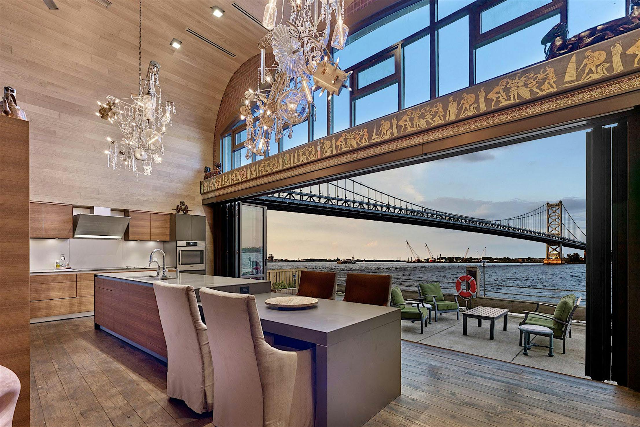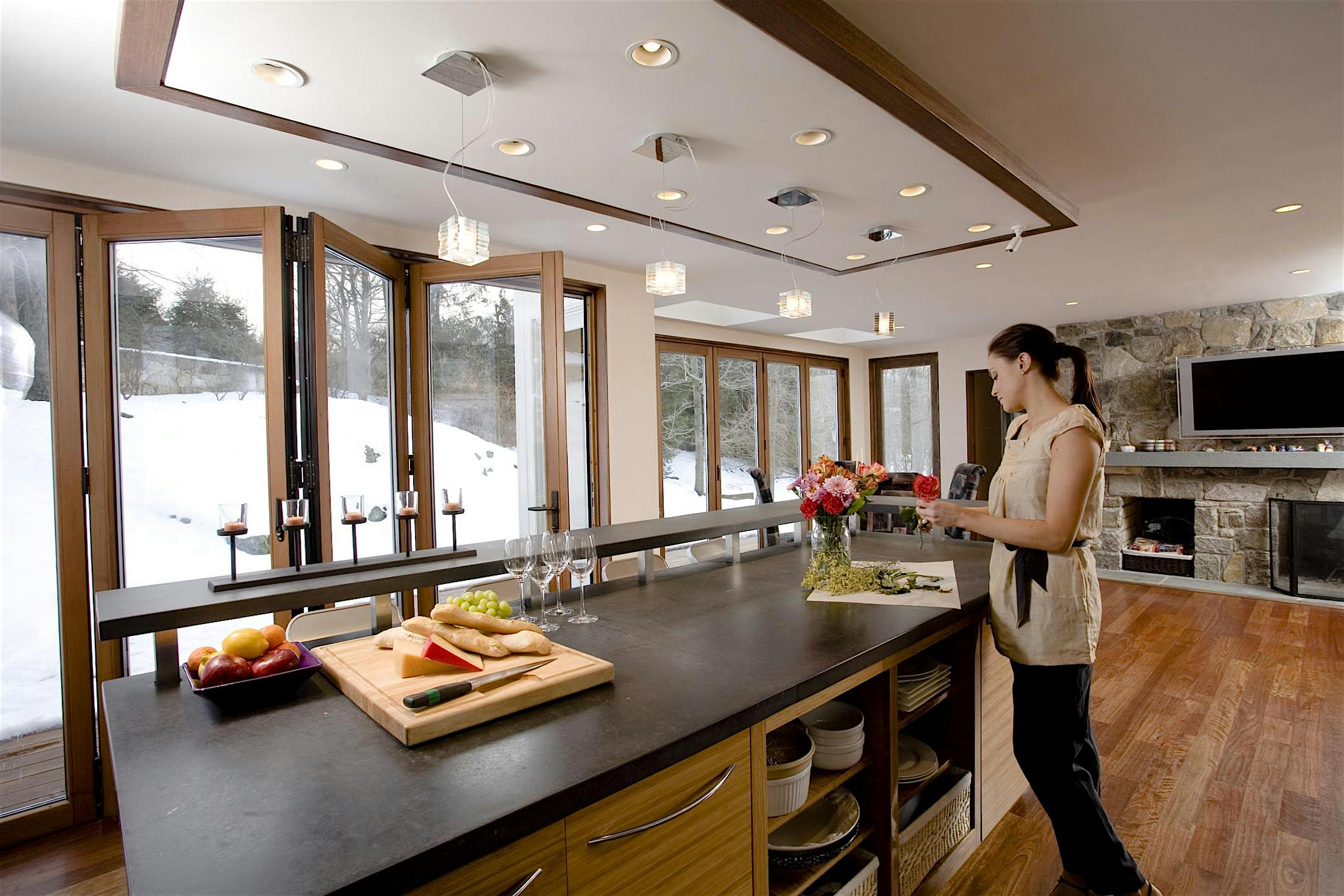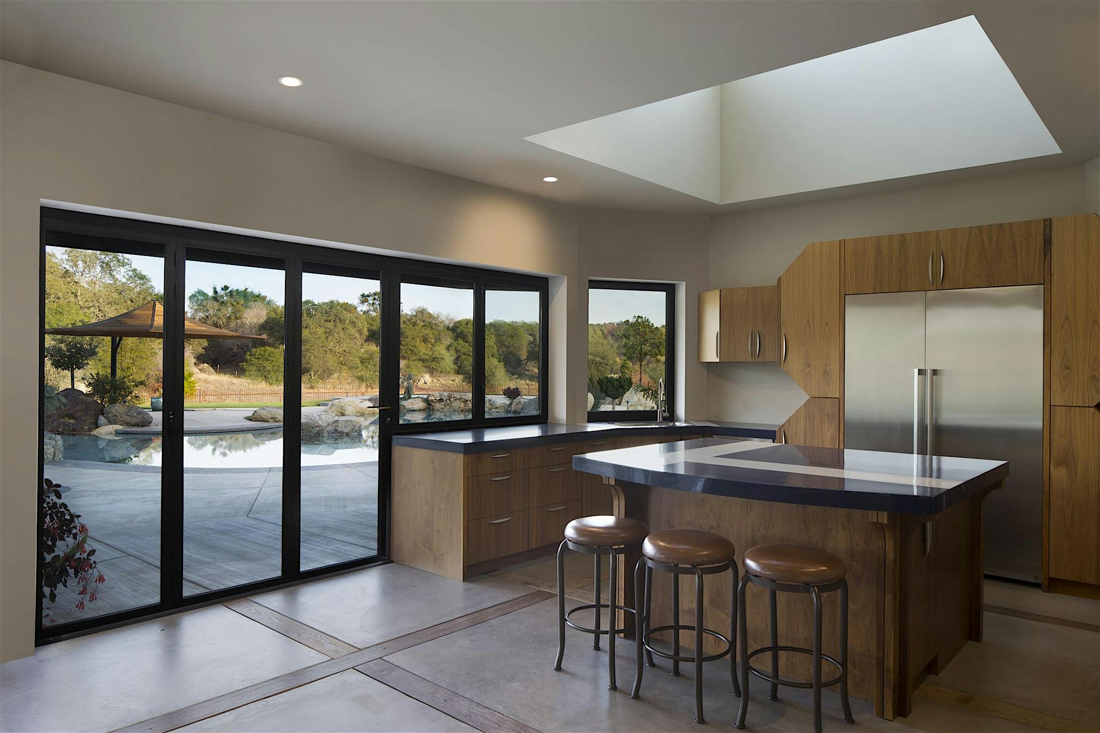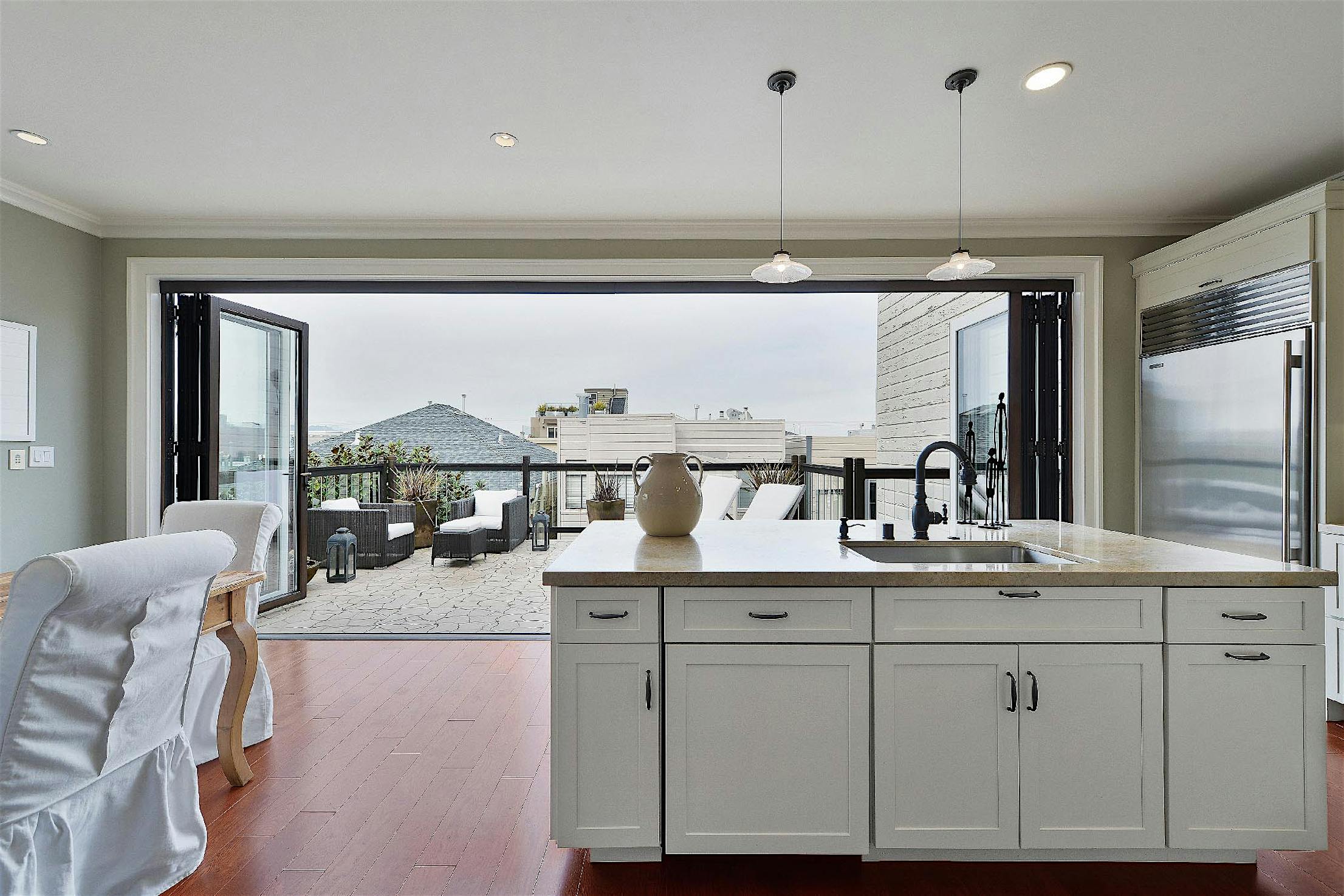 Each panel of the glass wall system is connected together along a single track and folds unto itself to create wide, unobstructed openings.