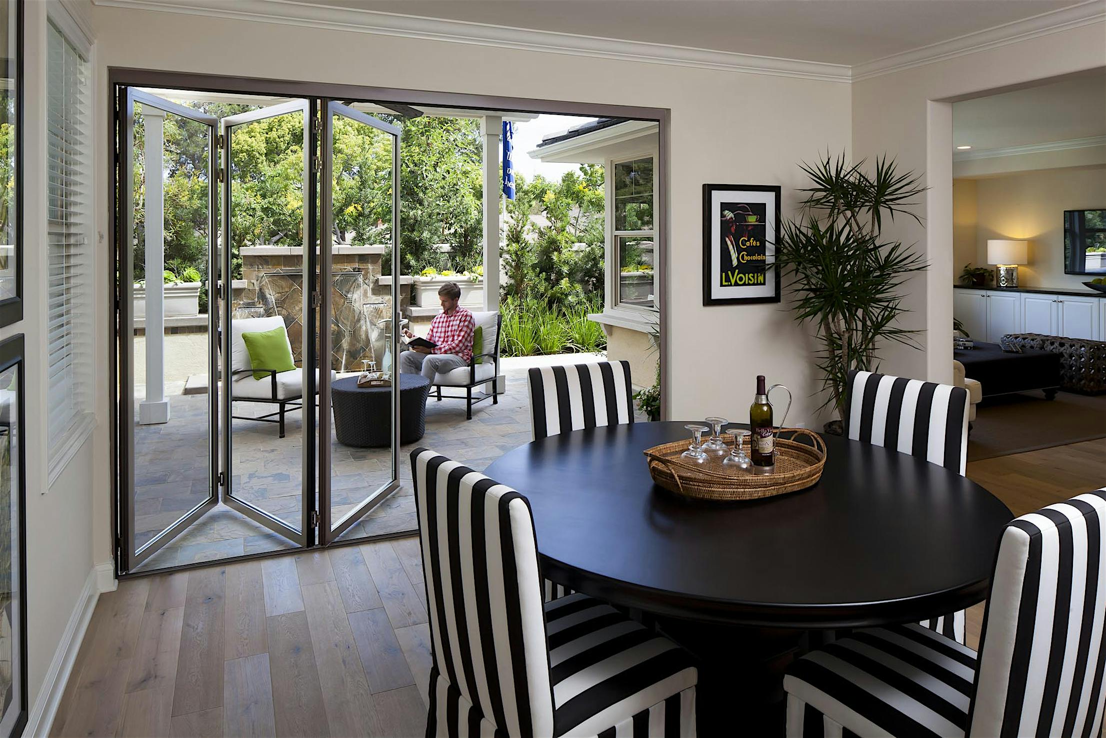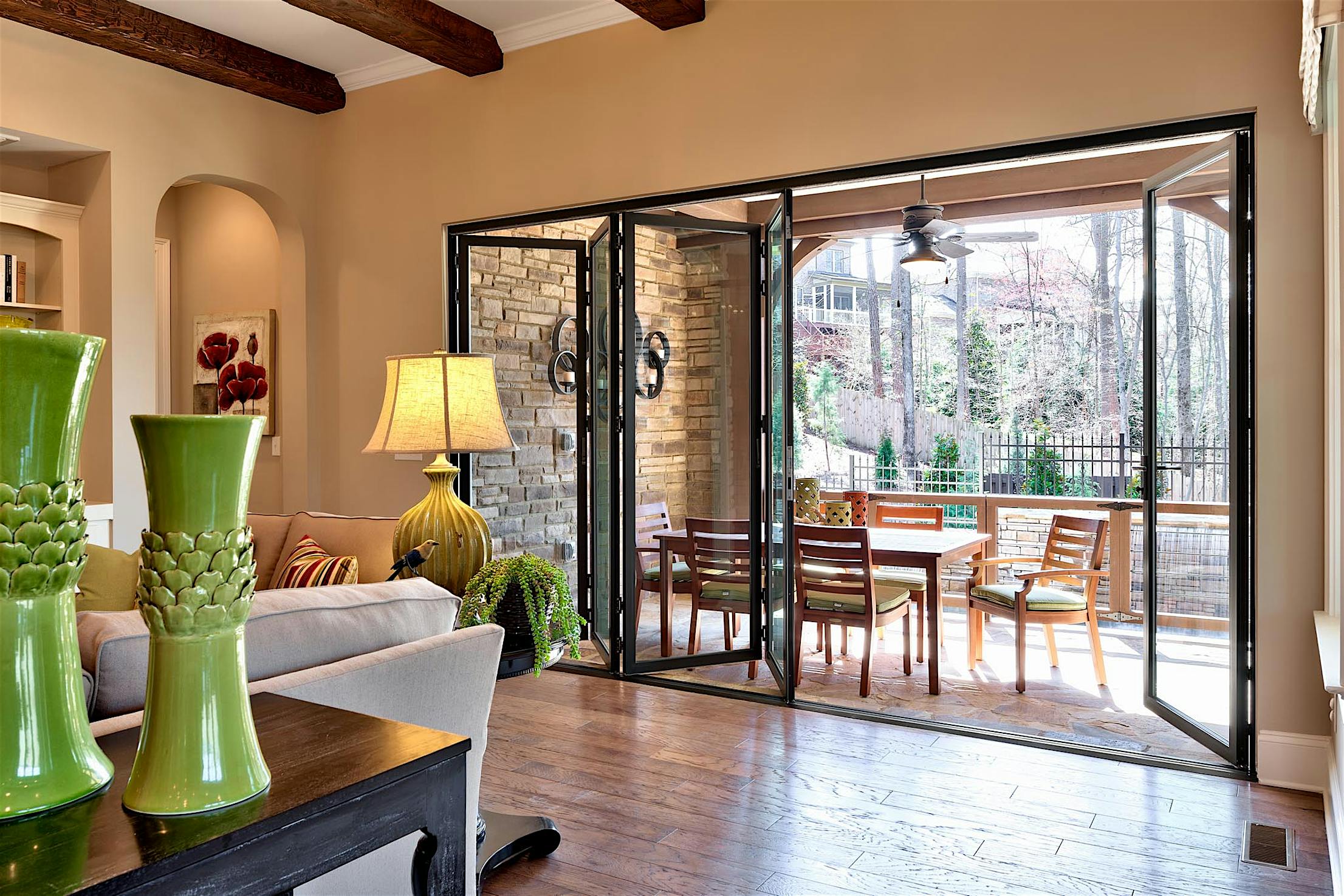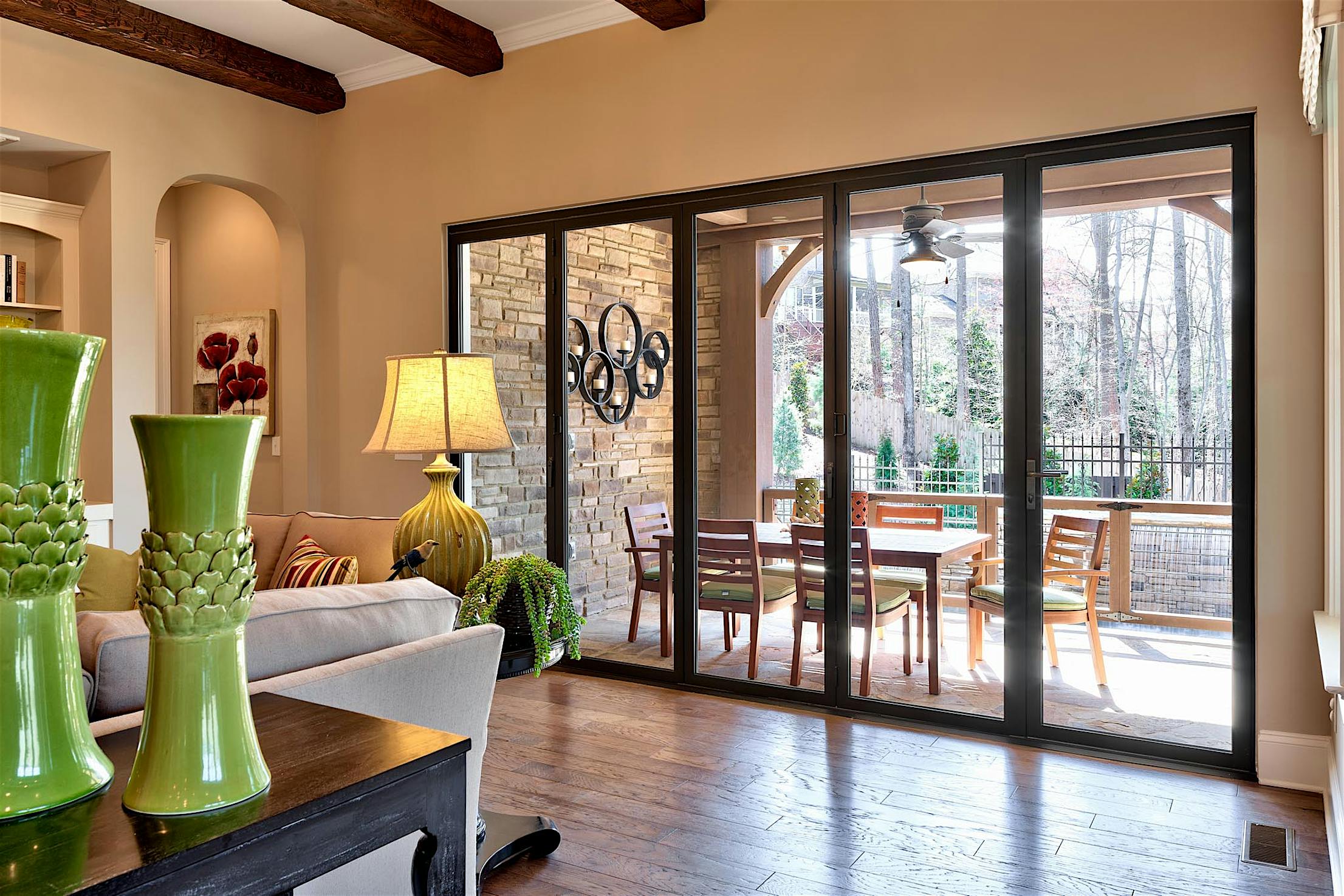 Opening your NanaWall spreads fresh air throughout the home, and on warmer days you can sit in comfort indoors with views , fresh air, and sunlight of the outdoors pouring in.
